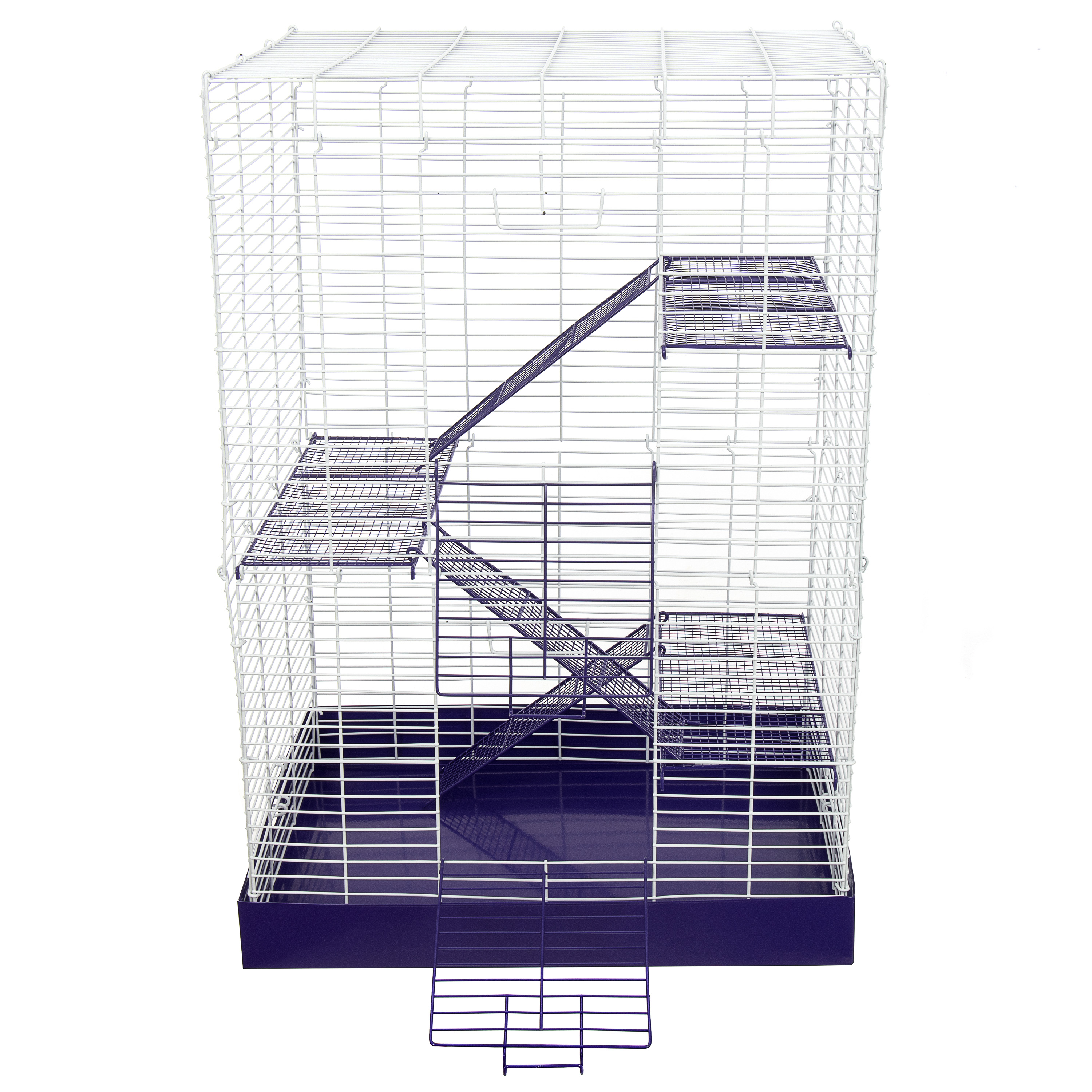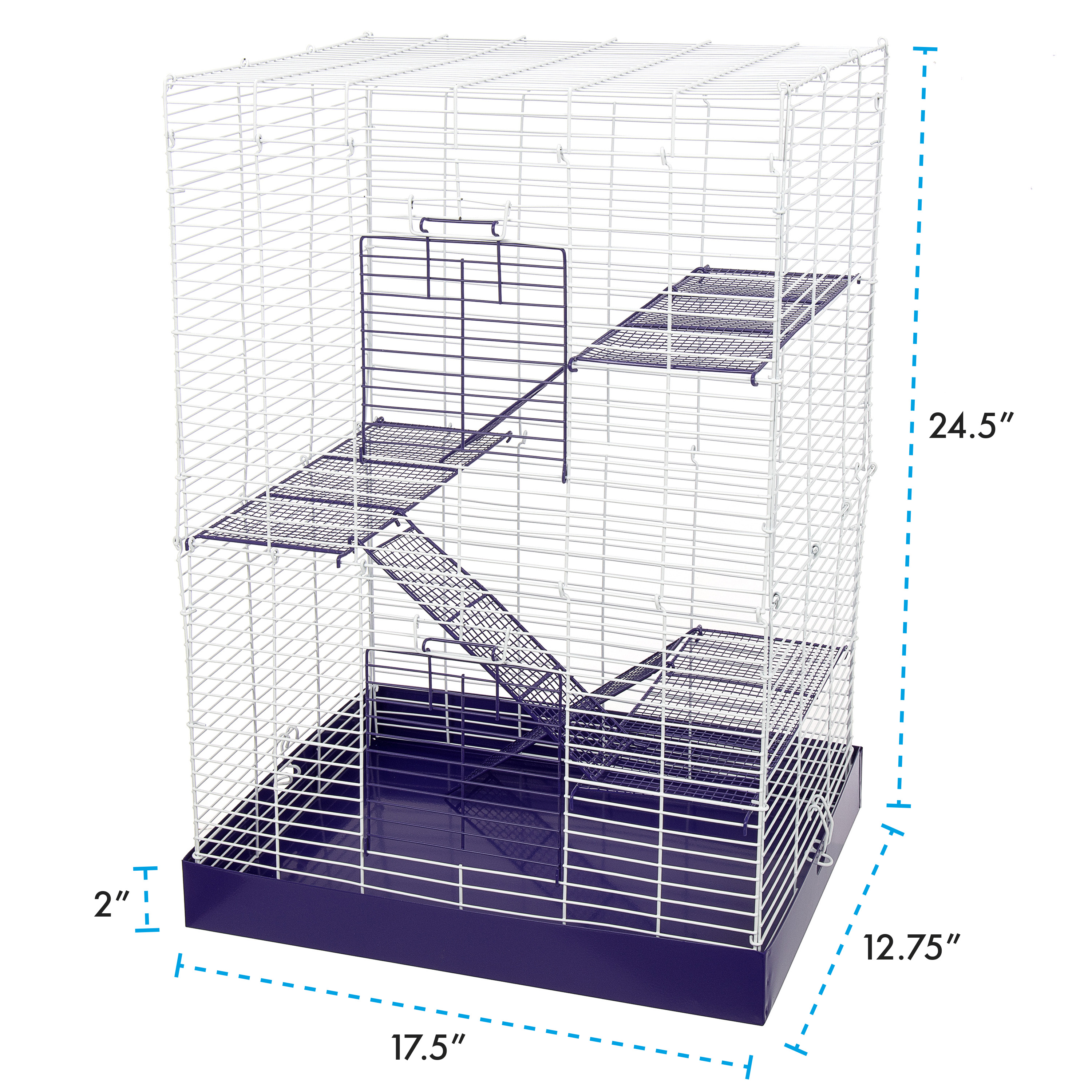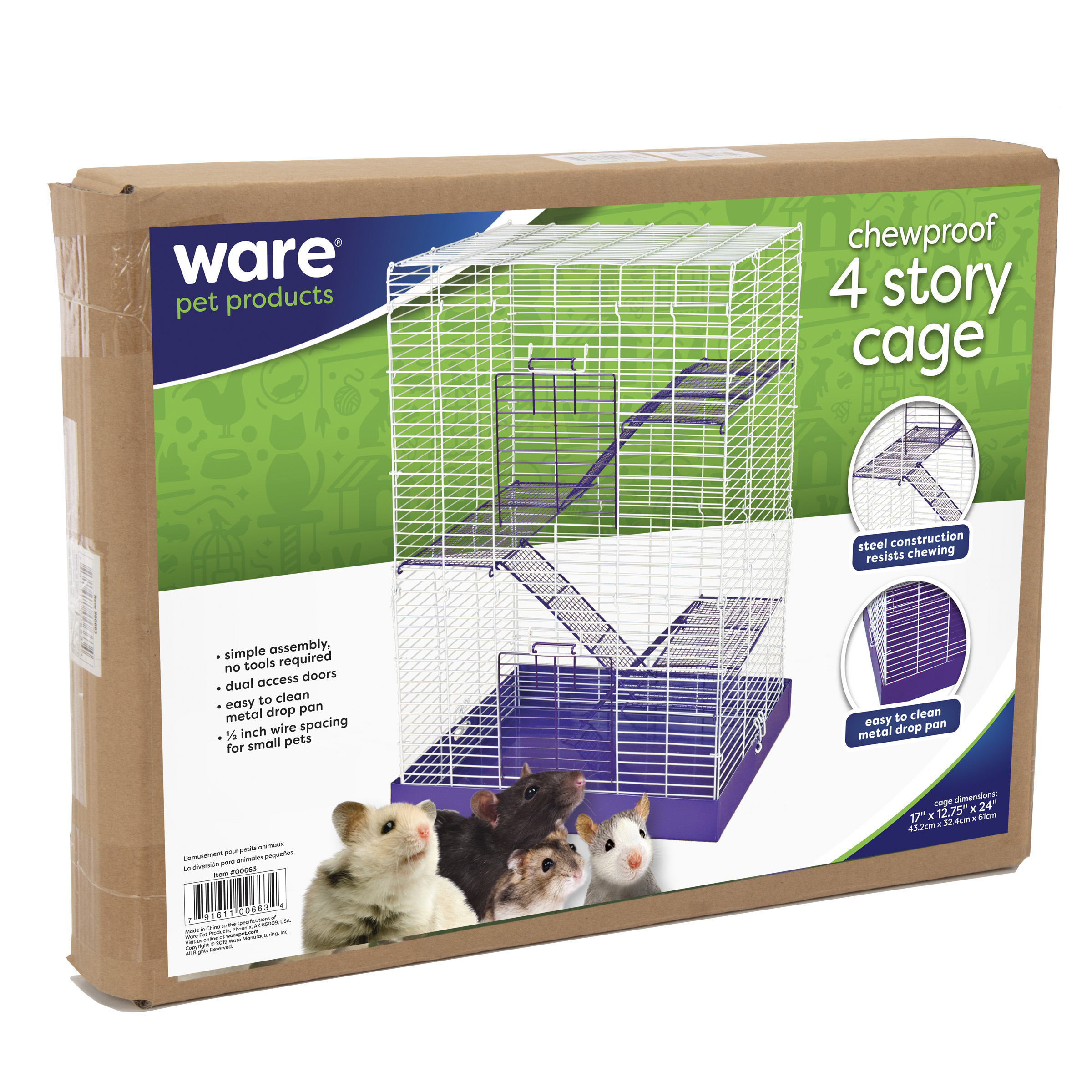 The Chew Proof 4 Story Hamster Cage has a durable all metal design. The powder coated wire cage, with shelves and ramps, attaches easily to the metal drop pan, making it easy to clean and assemble. It comes in a colorful, informative box that displays beautifully in a retail setting.