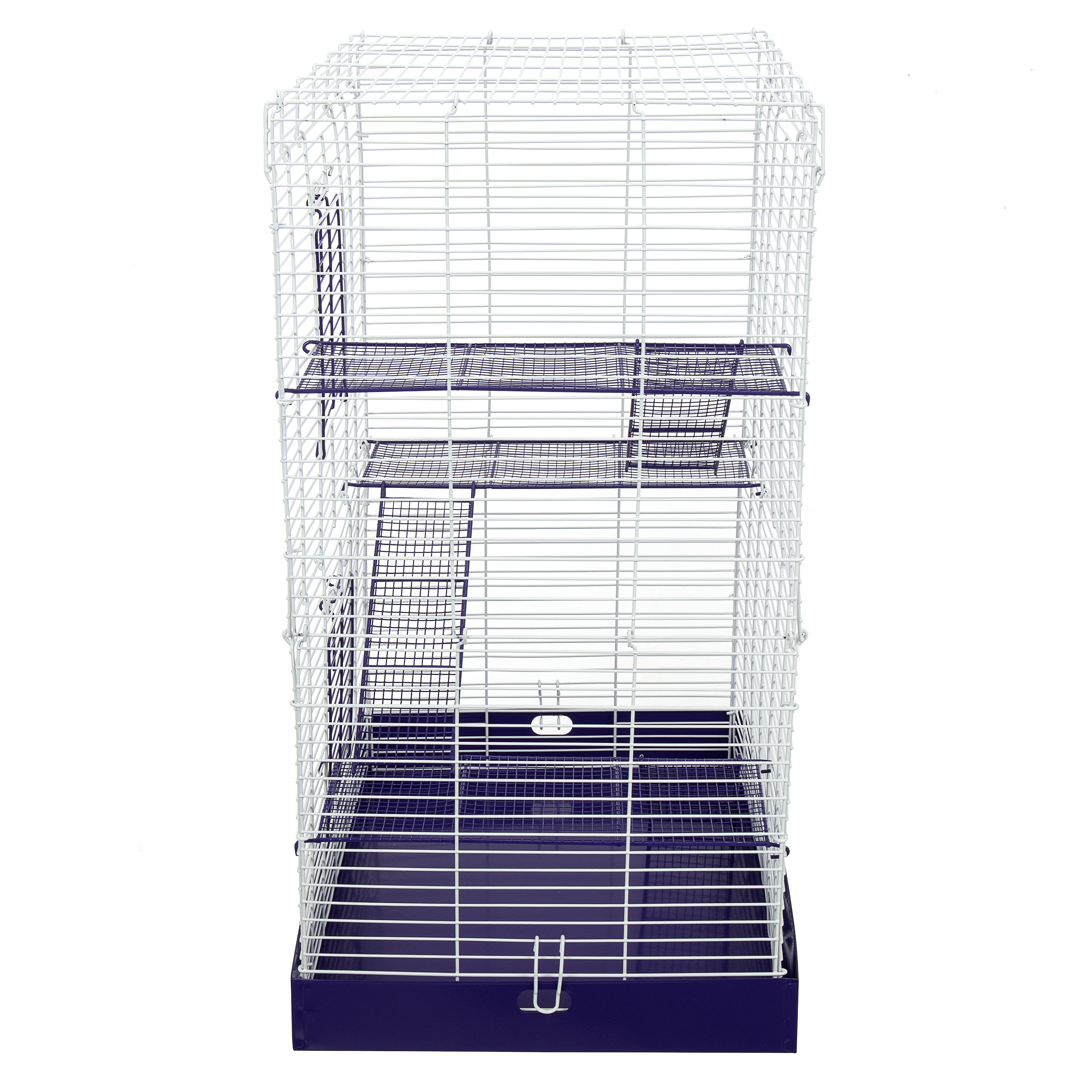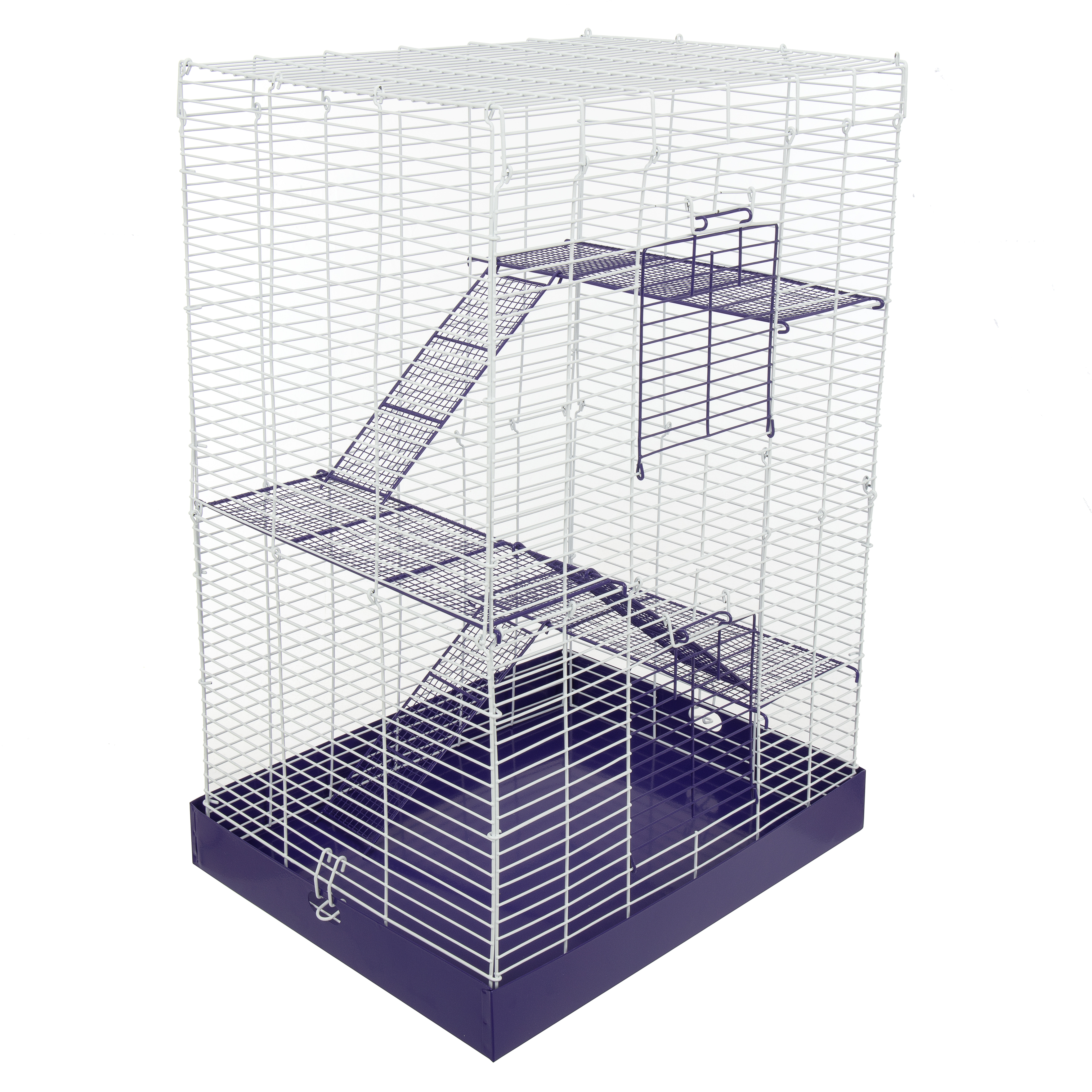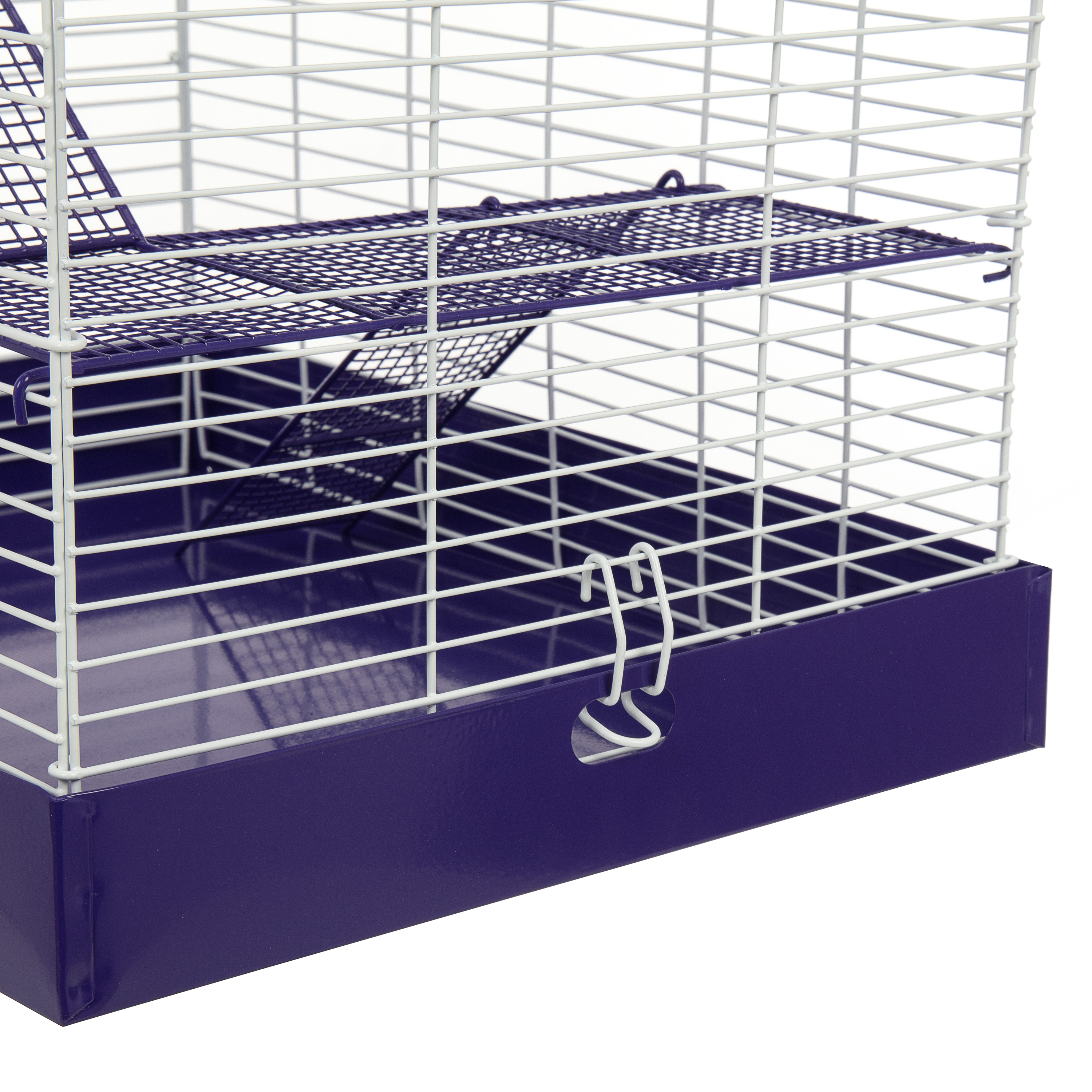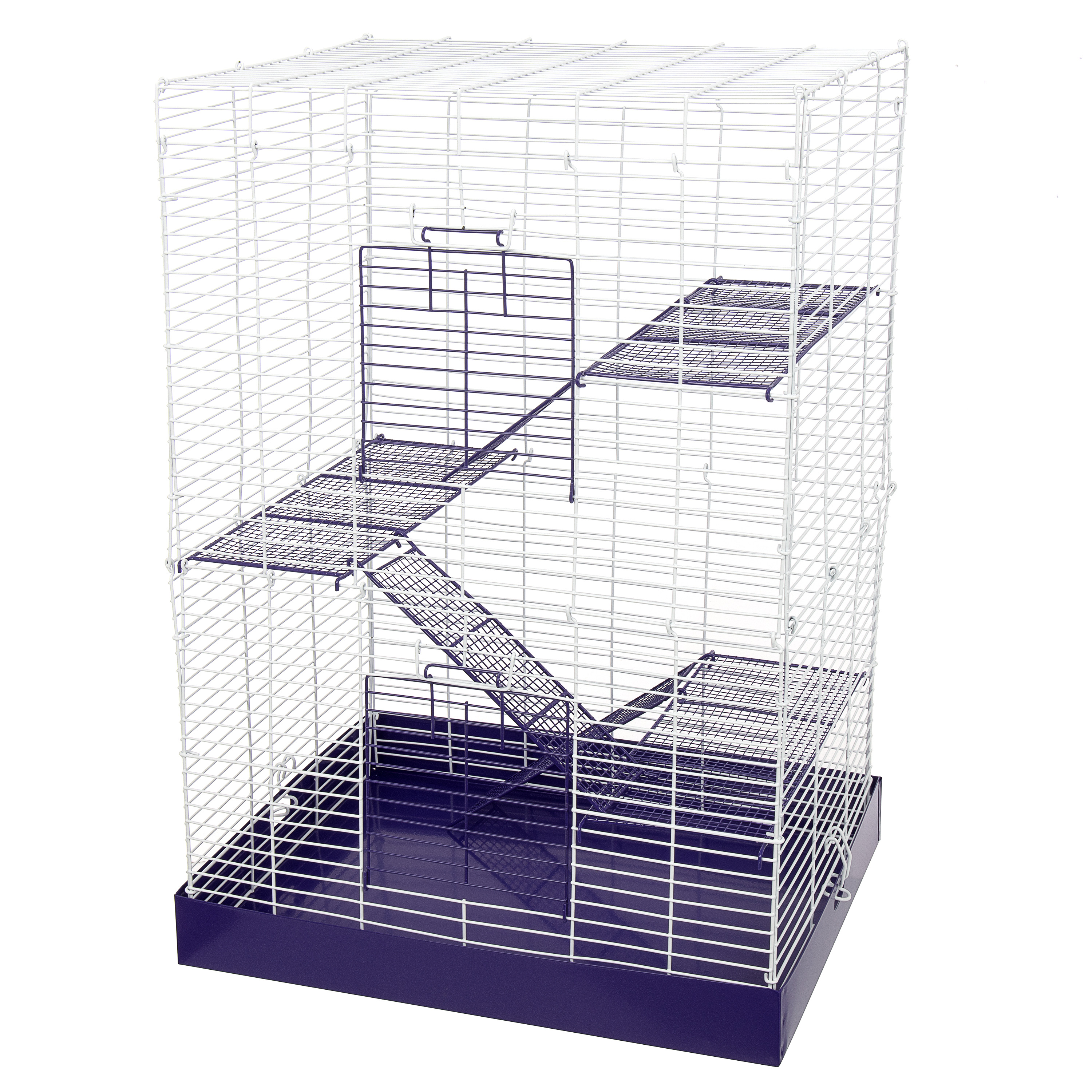 The Chew Proof 4 Story Hamster Cage has a durable all metal design. The powder coated wire cage, with shelves and ramps, attaches easily to the metal drop pan, making it easy to clean and assemble. It comes in a colorful, informative box that displays beautifully in a retail setting.