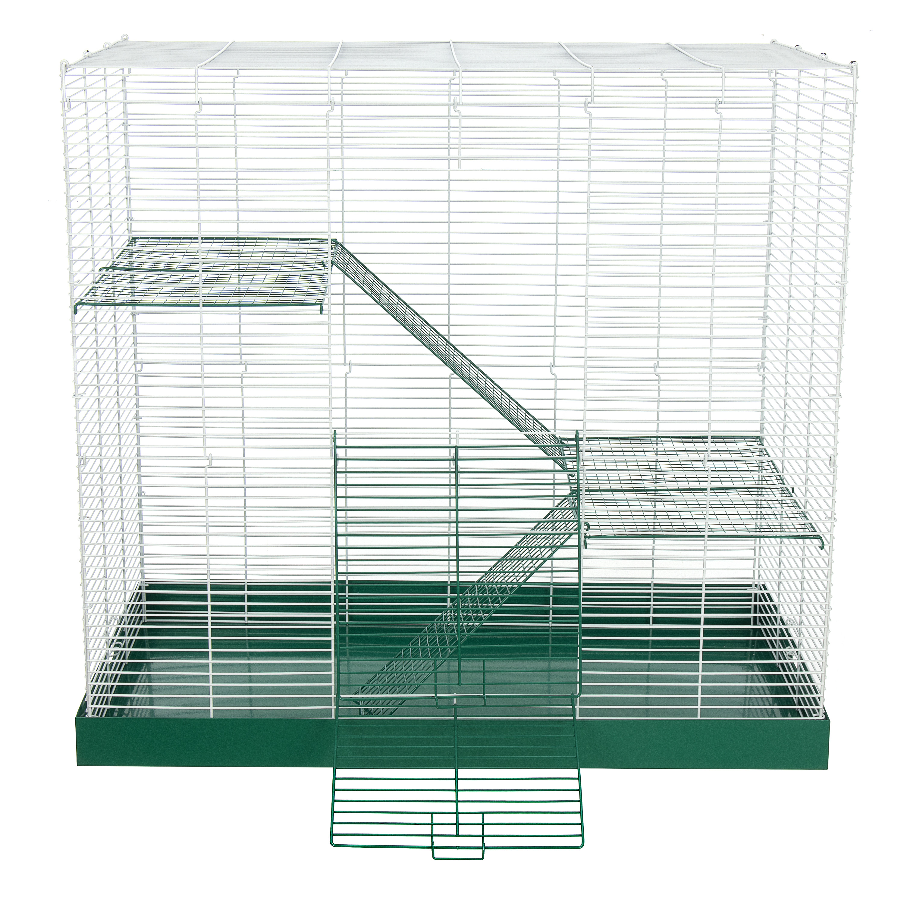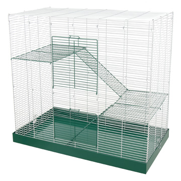 The Chew Proof 3 Level Critter Cage 30" has a durable all metal design. The powder coated cage, with ramps and shelves, attaches easily to the metal drop pan, making it easy to assemble and clean. It comes in a colorful, informative box that displays beautifully in a retail setting.
