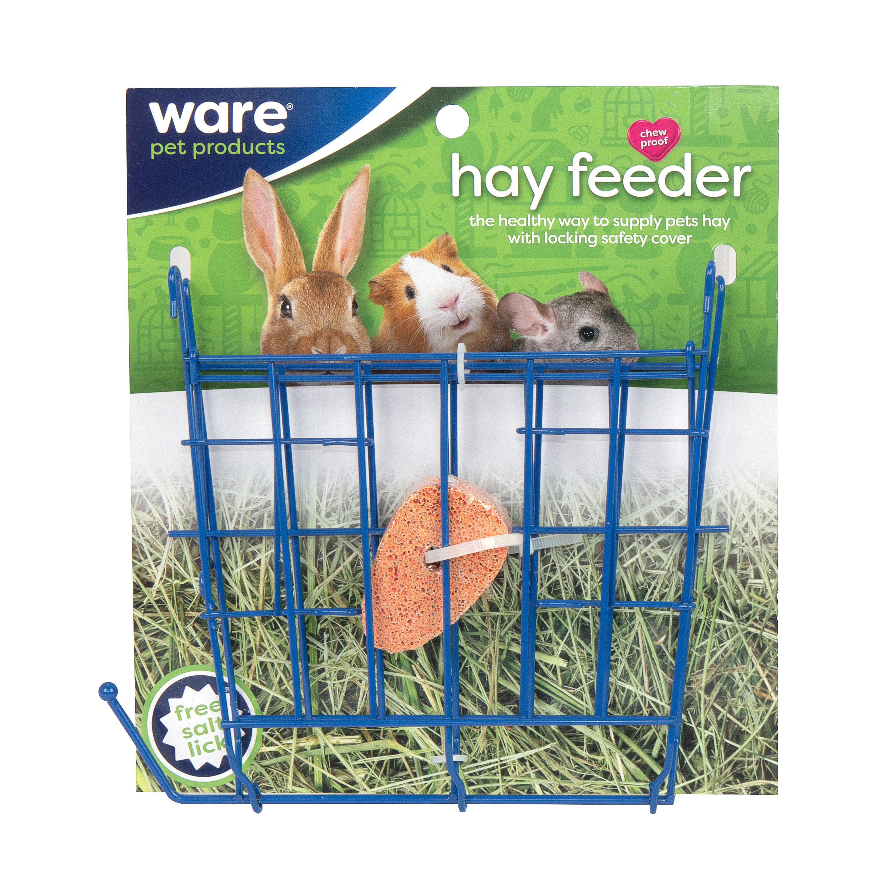 Our Chew Proof Hay Feeder is made of sturdy powder coated wire and features a safe locking lid. This Hay Feeder hangs easily on any cage. It reduces food waste and keeps the cage cleaner. A free salt lick is included. Available in a variety of colors.