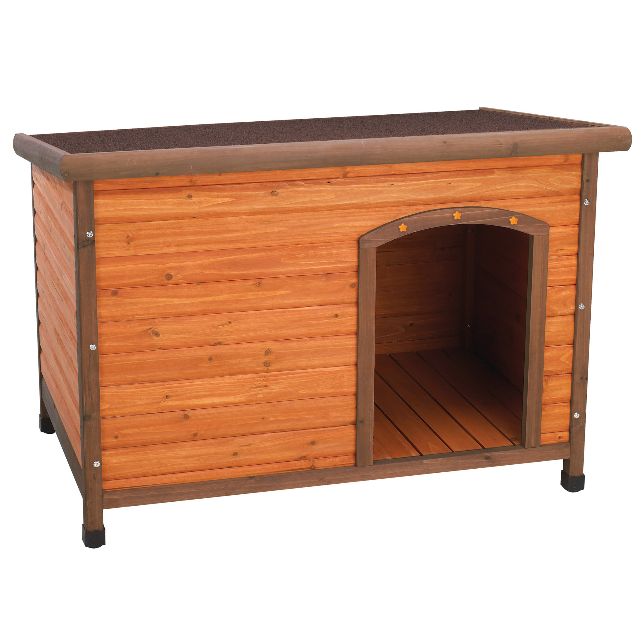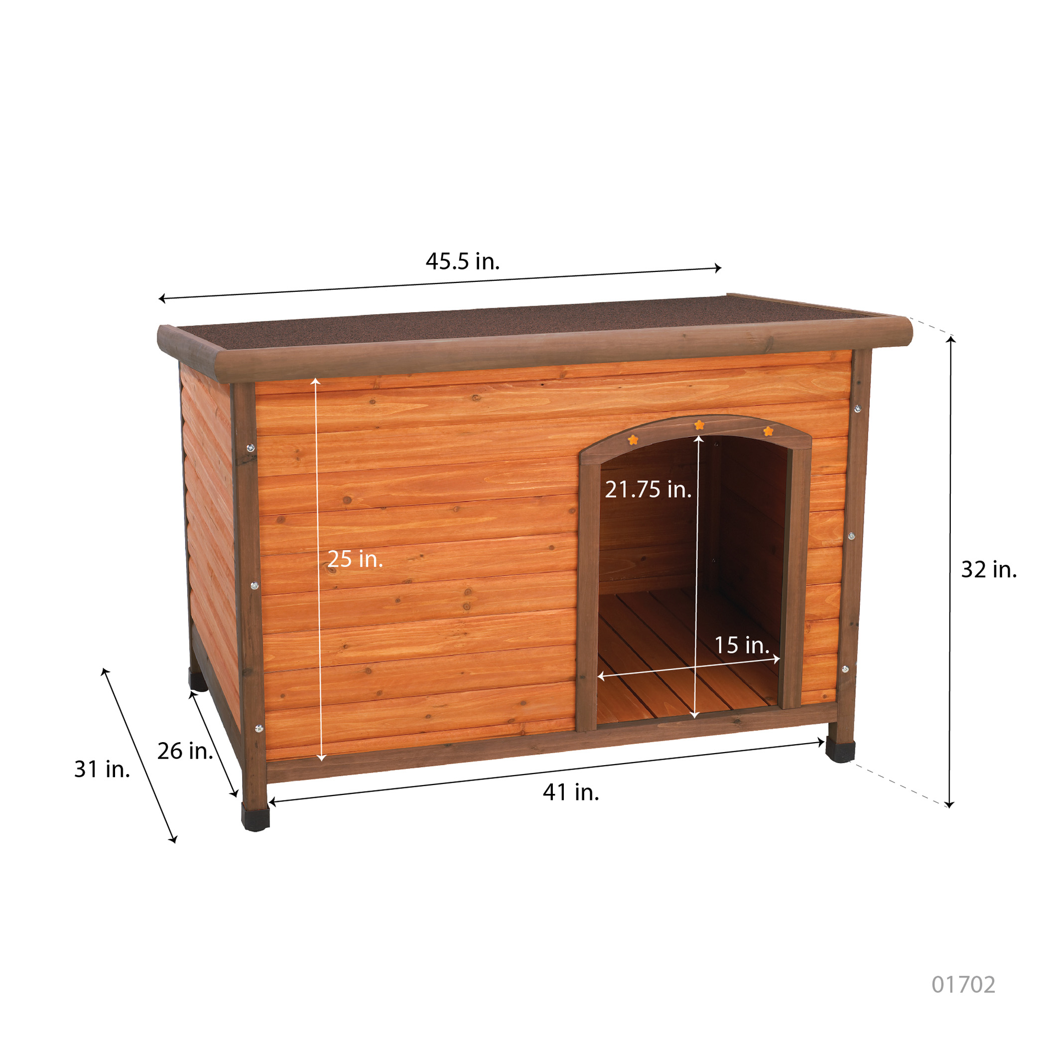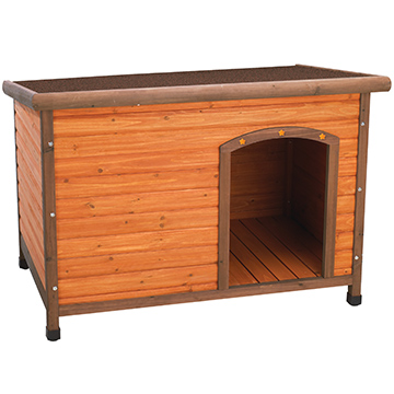 Our Premium+ Doghouses provide the perfect outdoor shelter for your dog. Features waterproof shingle roof and adjustable height feet. Solid wood construction is sealed with a water based non-toxic stain.