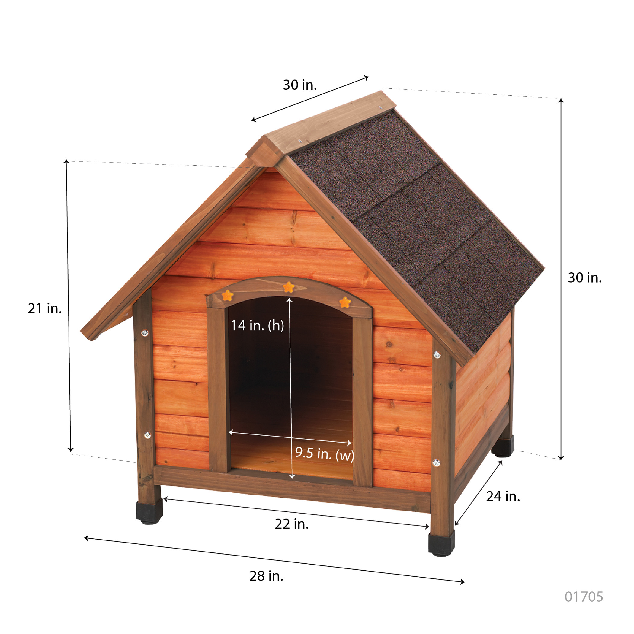 Premium+ A-Frame Doghouses provide the perfect outdoor shelter for your dog. Features waterproof shingle roof and adjustable height feet. Solid wood construction is sealed with a water based non-toxic stain.