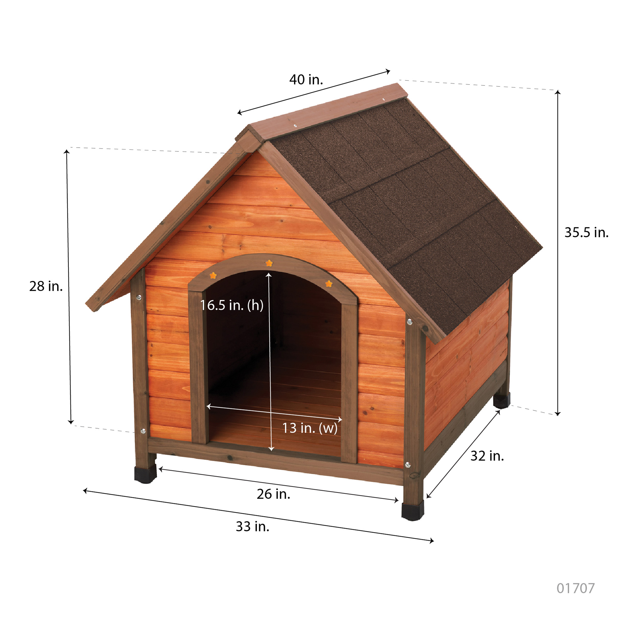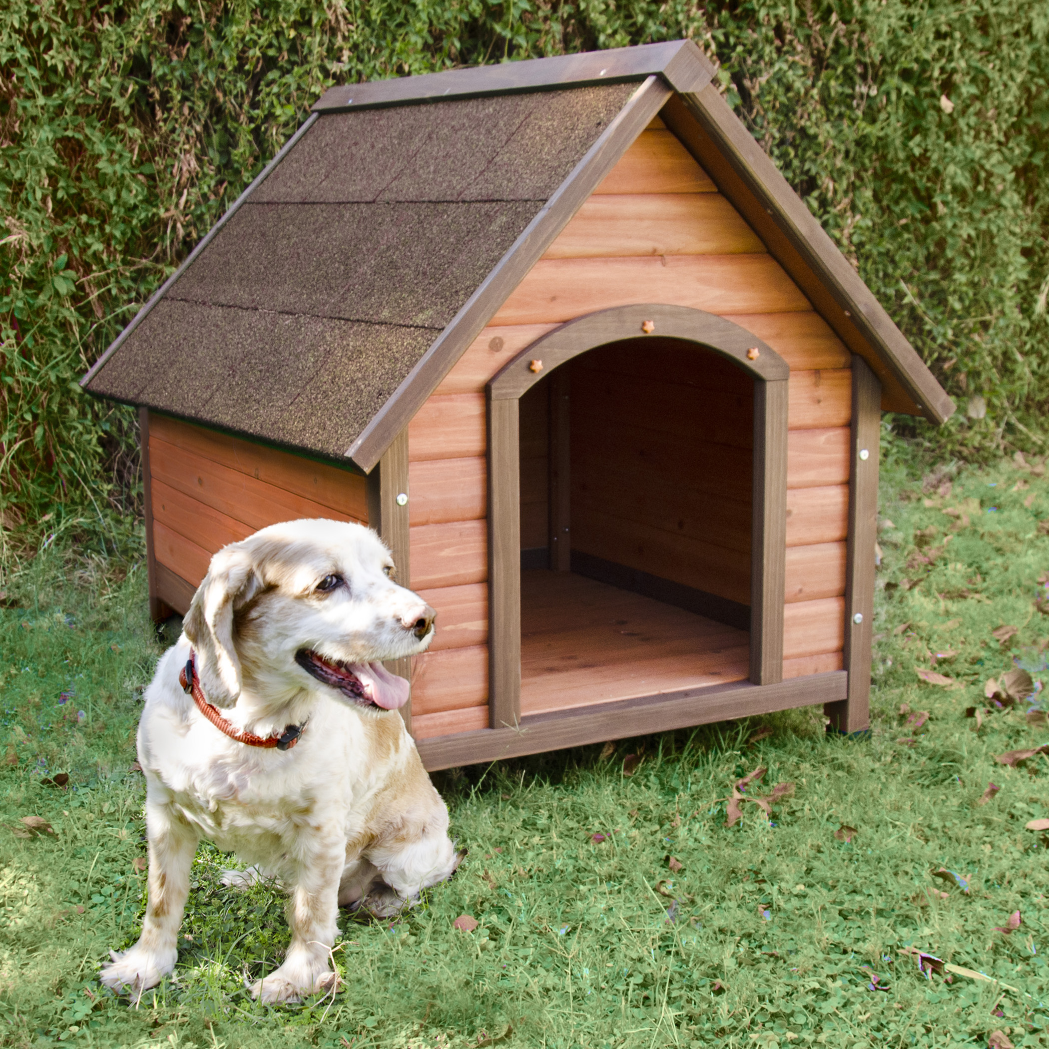 Premium+ A-Frame Doghouses provide the perfect outdoor shelter for your dog. Features waterproof shingle roof and adjustable height feet. Solid wood construction is sealed with a water based non-toxic stain.