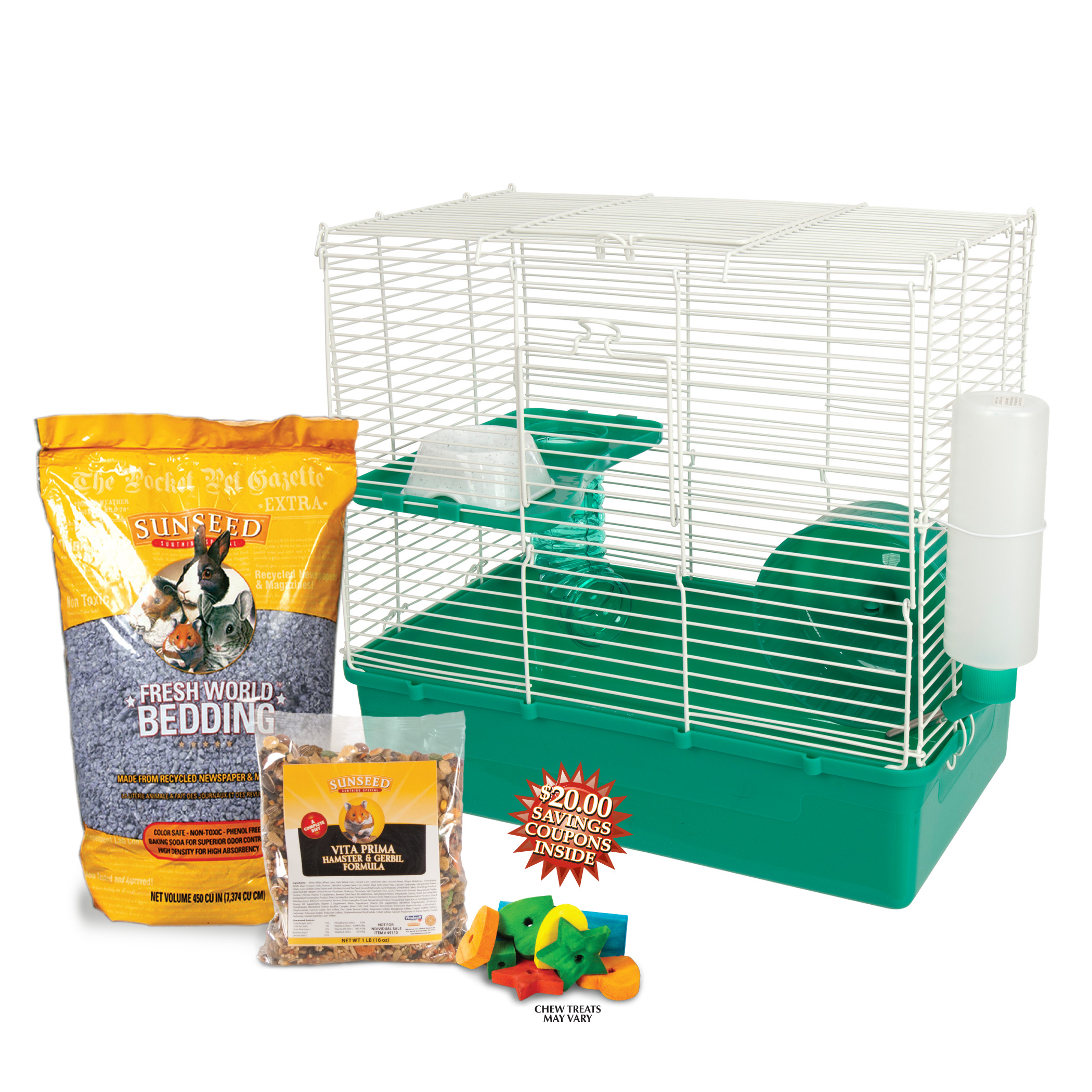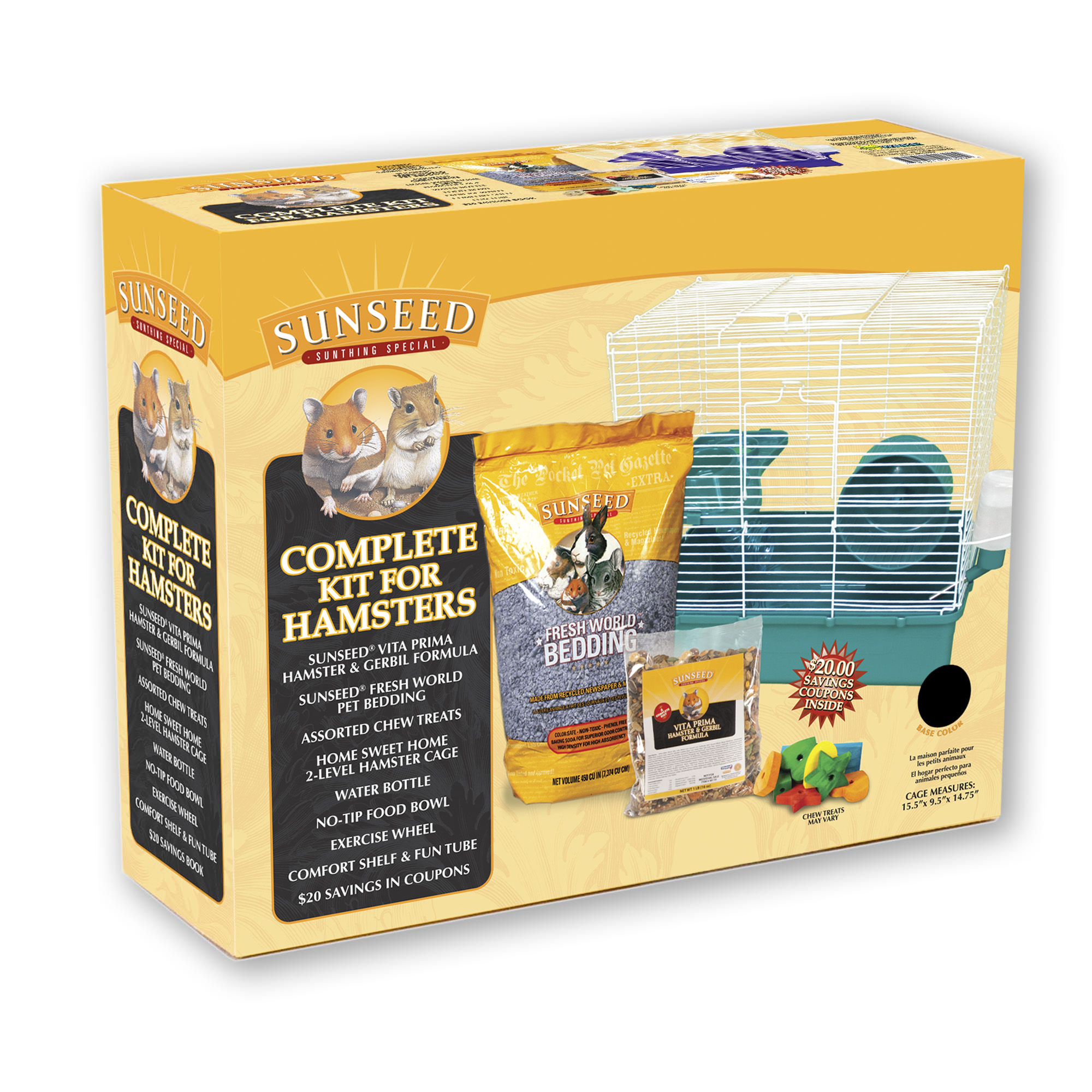 Our Home Sweet Home Hamster Kit features a cage with a deep plastic base and an easy snap-on top made of durable powder coated wire. This complete kit features Sun Seed brand food. It also includes bottle, bowl, chew treat, toy and bedding. Great for new pet owners. Comes in a color box.