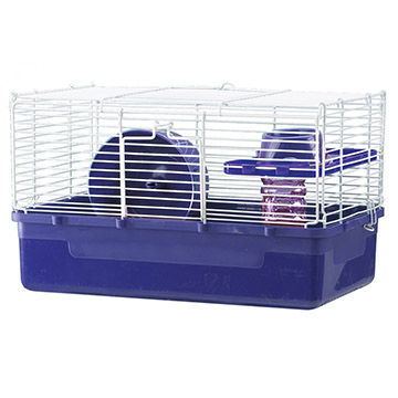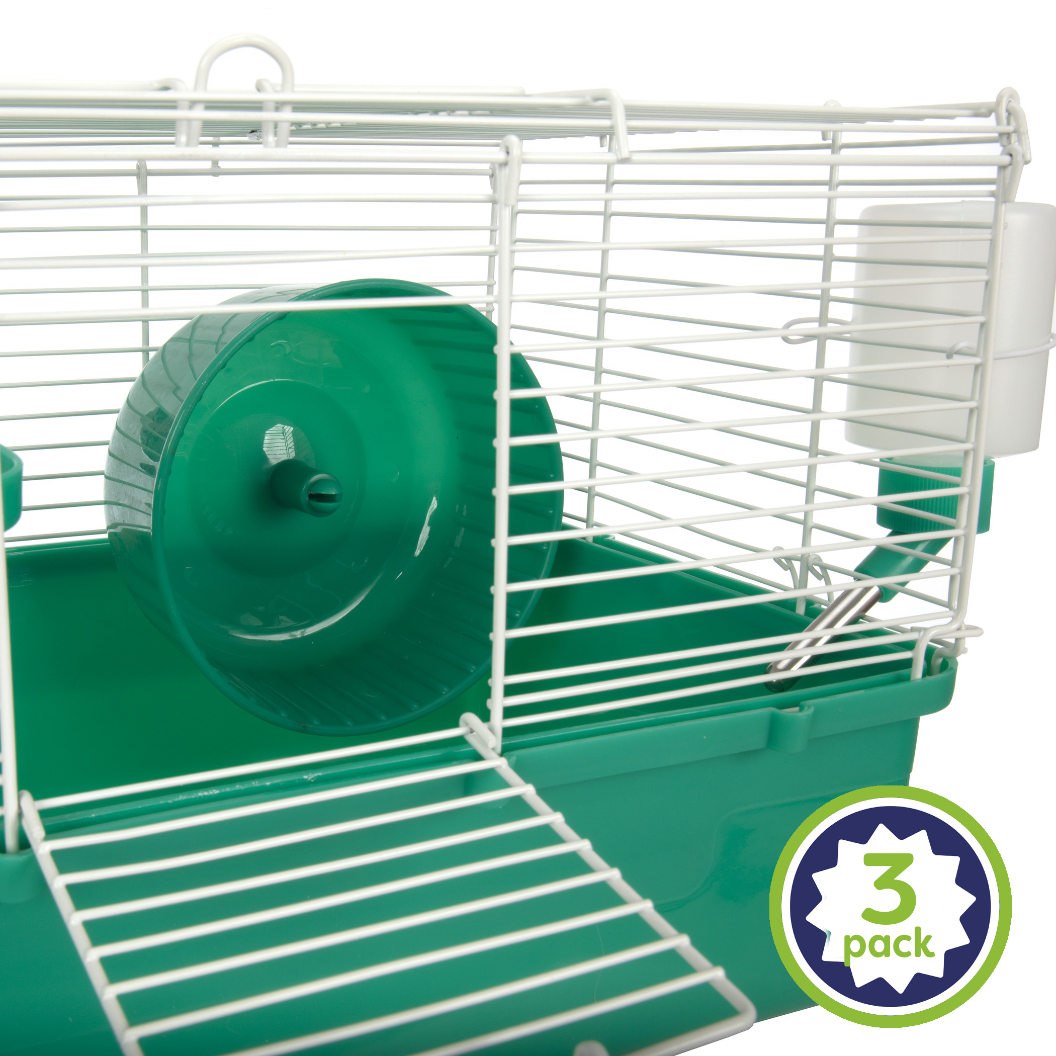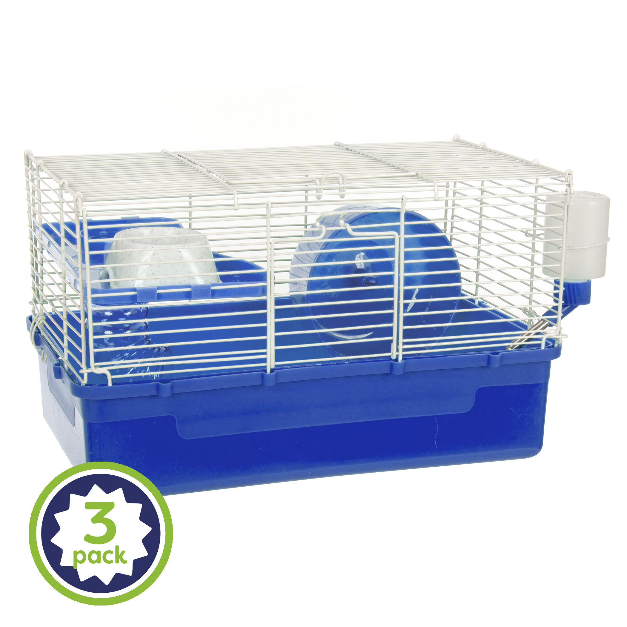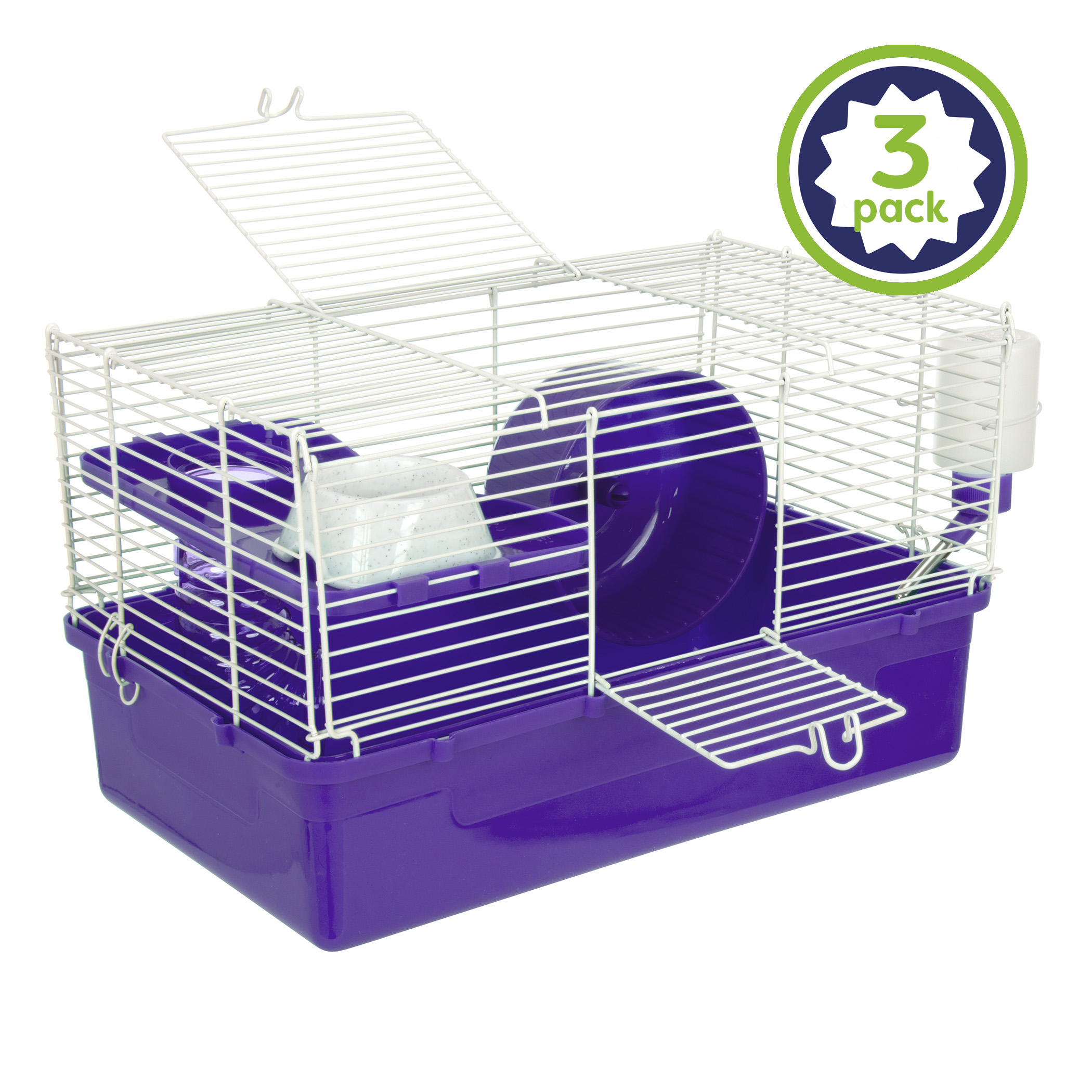 Our Home Sweet Home Hamster Cage One Level Multi Pack (3 to a pack) comes with a shelf, bottle, bowl, ramp, wheel and tube. It has a deep plastic base and an easy snap-on top made of durable powder coated wire. Available in three colors.