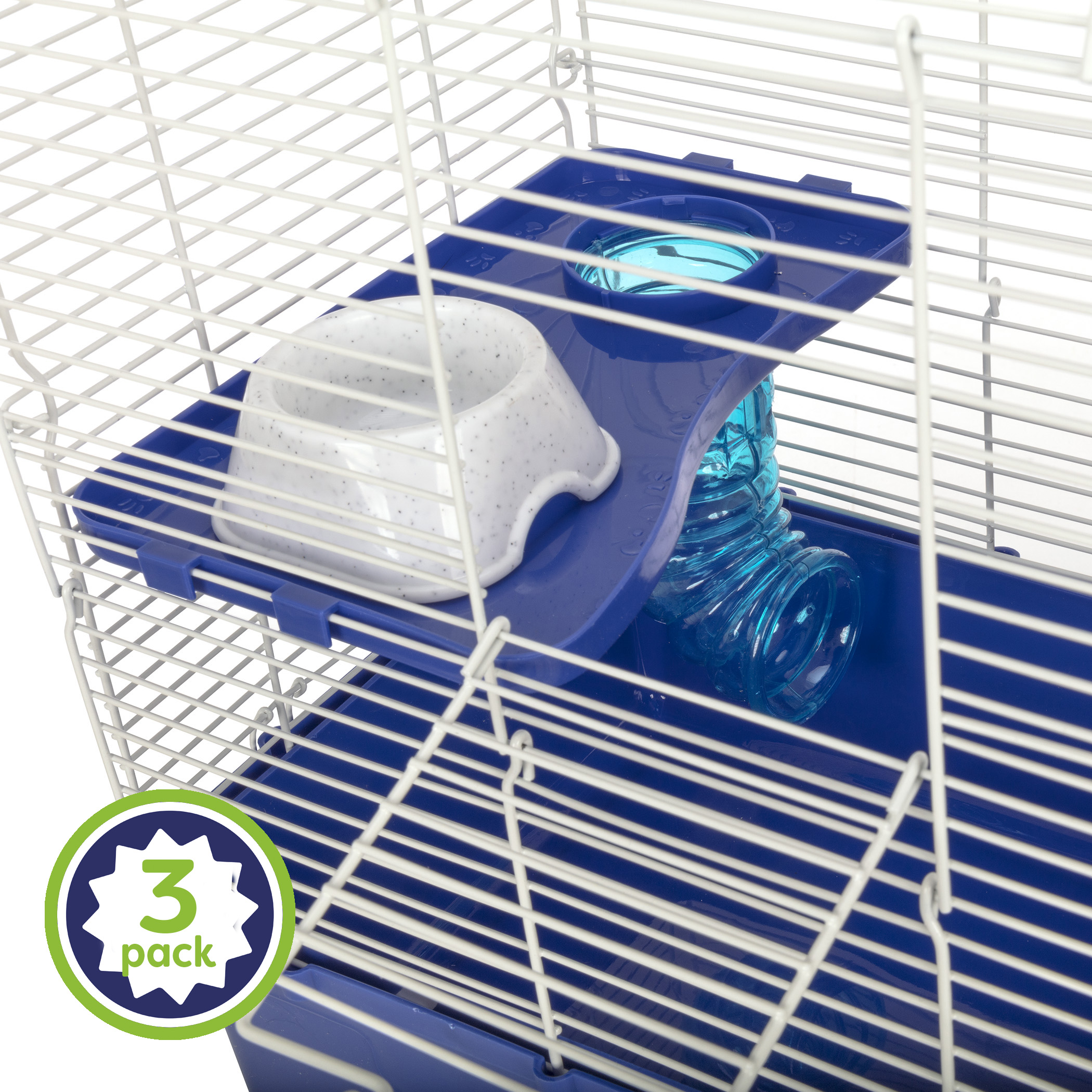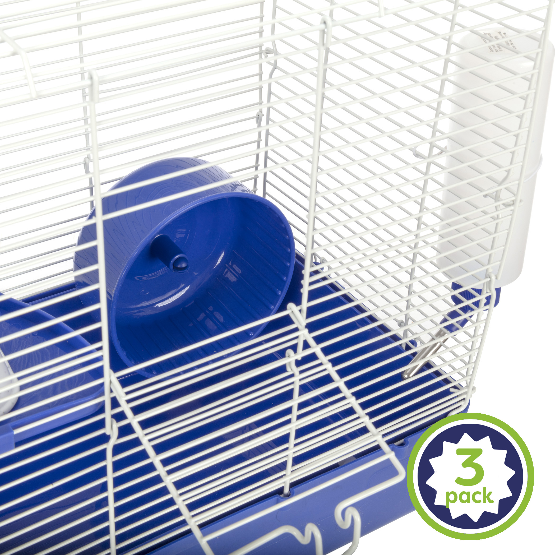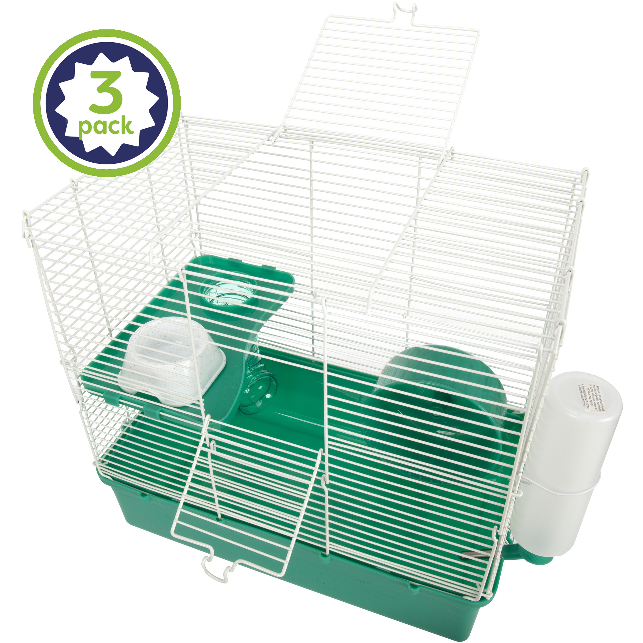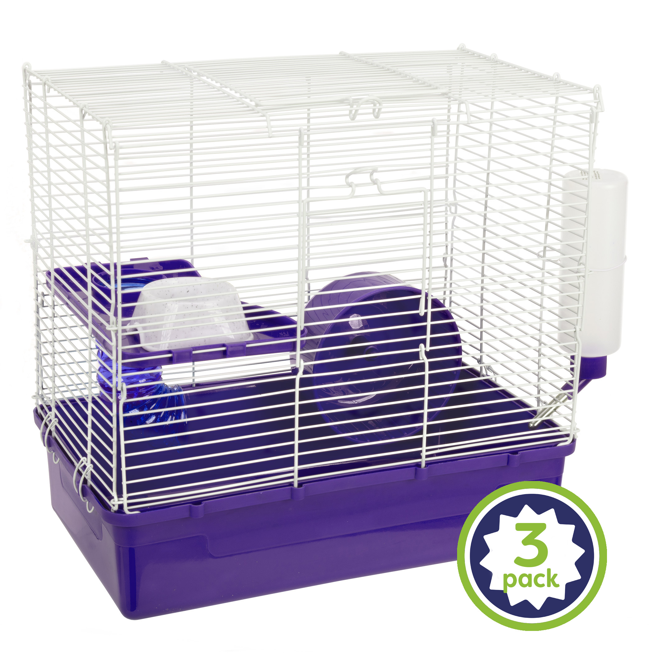 Our Home Sweet Home Hamster Cage Two Level Multi Pack (3 to a pack) comes with a shelf, bottle, bowl, ramp, wheel and tube. It has a deep plastic base and an easy snap-on top made of durable powder coated wire. Available in three colors.