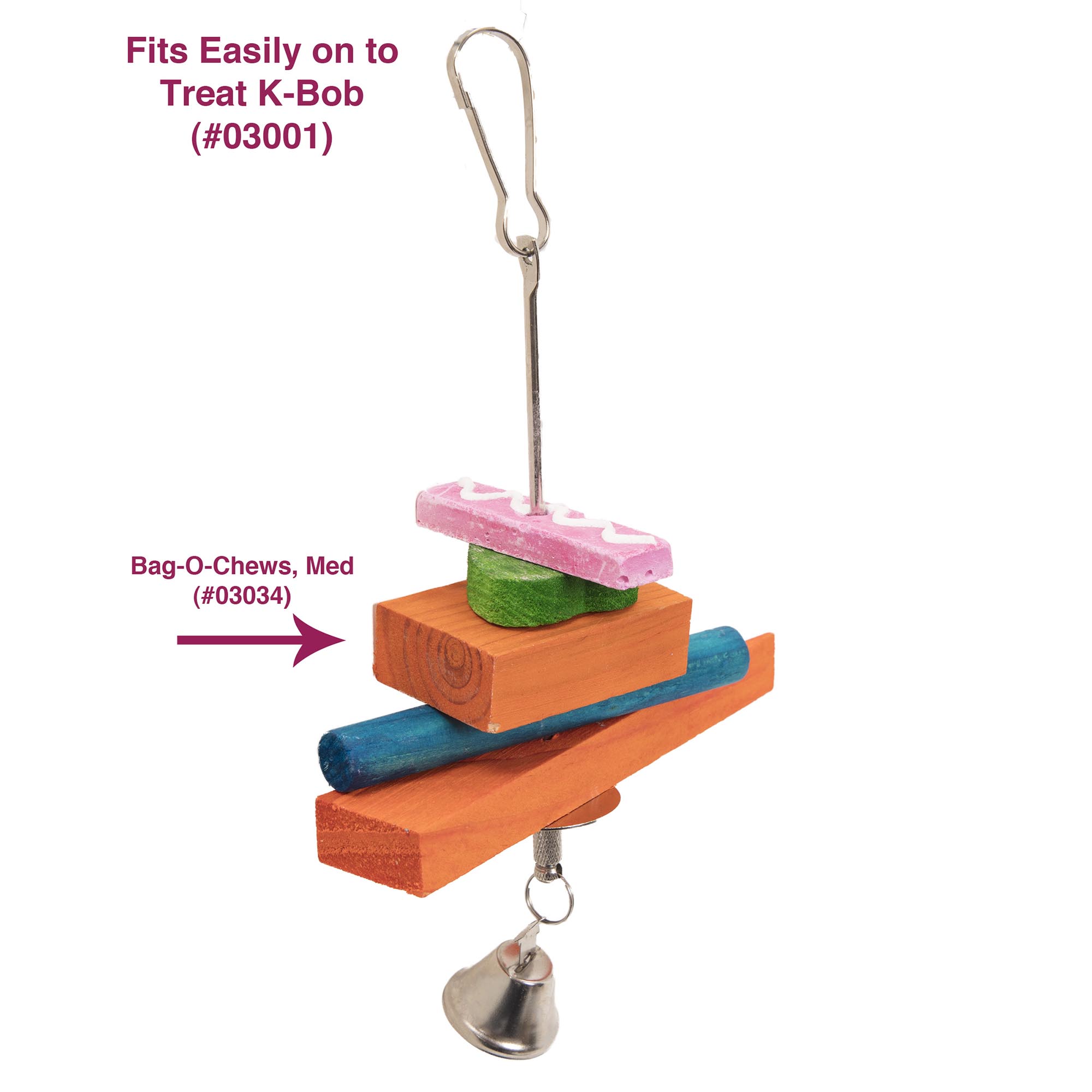 Our Wood Chews are safe, natural and fun treats for small pets. They are made of pine with an enticing fruit flavor. Chew treats keep teeth trimmed and provide a fun activity that relieves cage boredom. Fits Treat-K-Bob (item 03001).