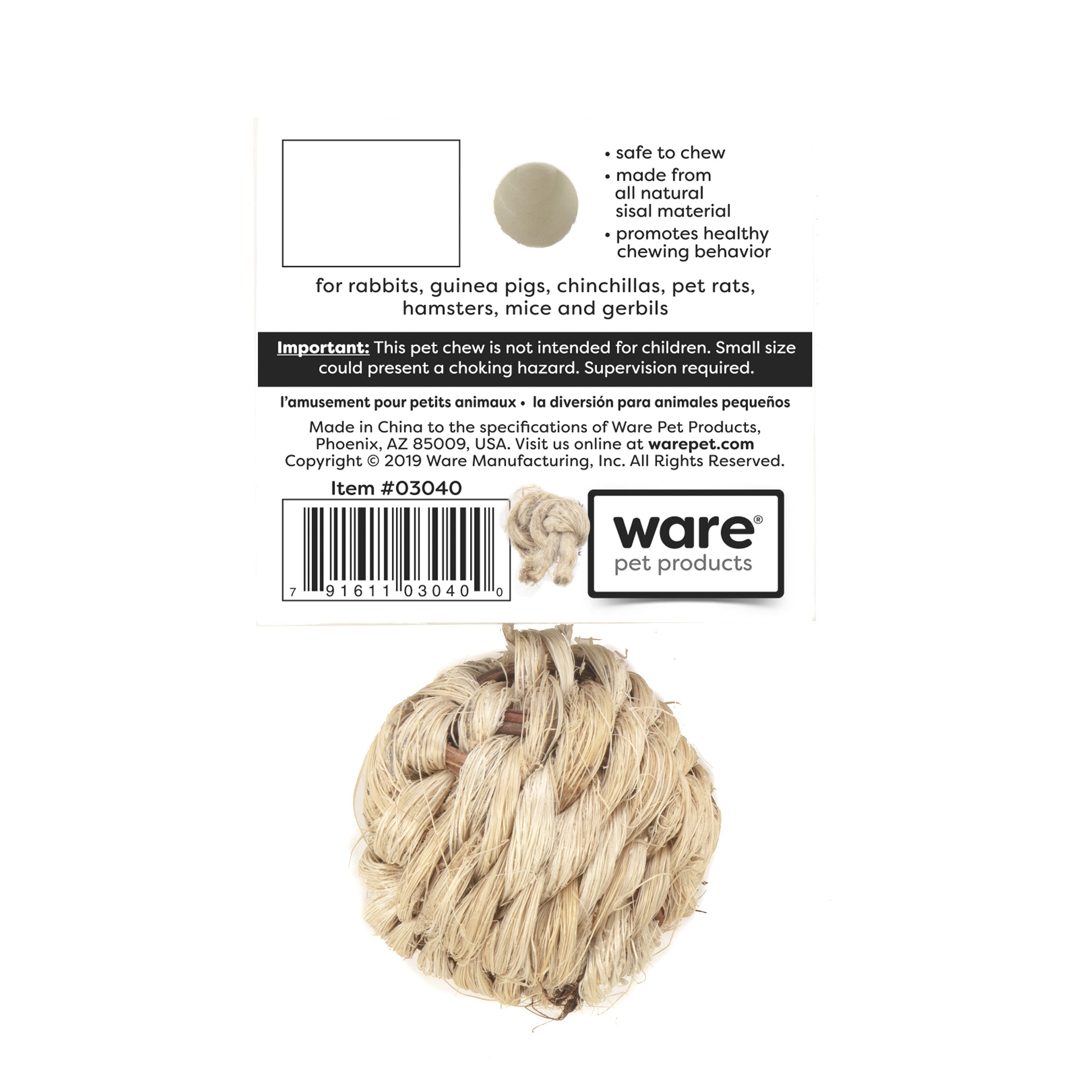 The Mini Nature Ball is made of 100% sisal. Small pets will nibble, gnaw, toss and roll for hours of playtime fun and exercise.