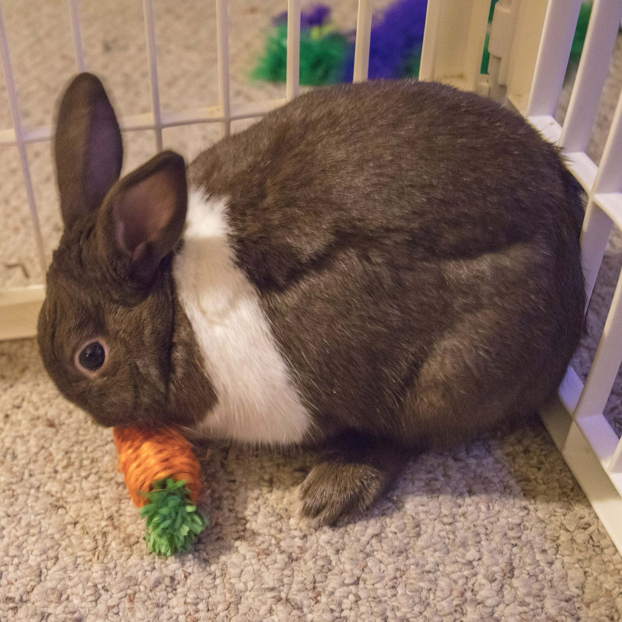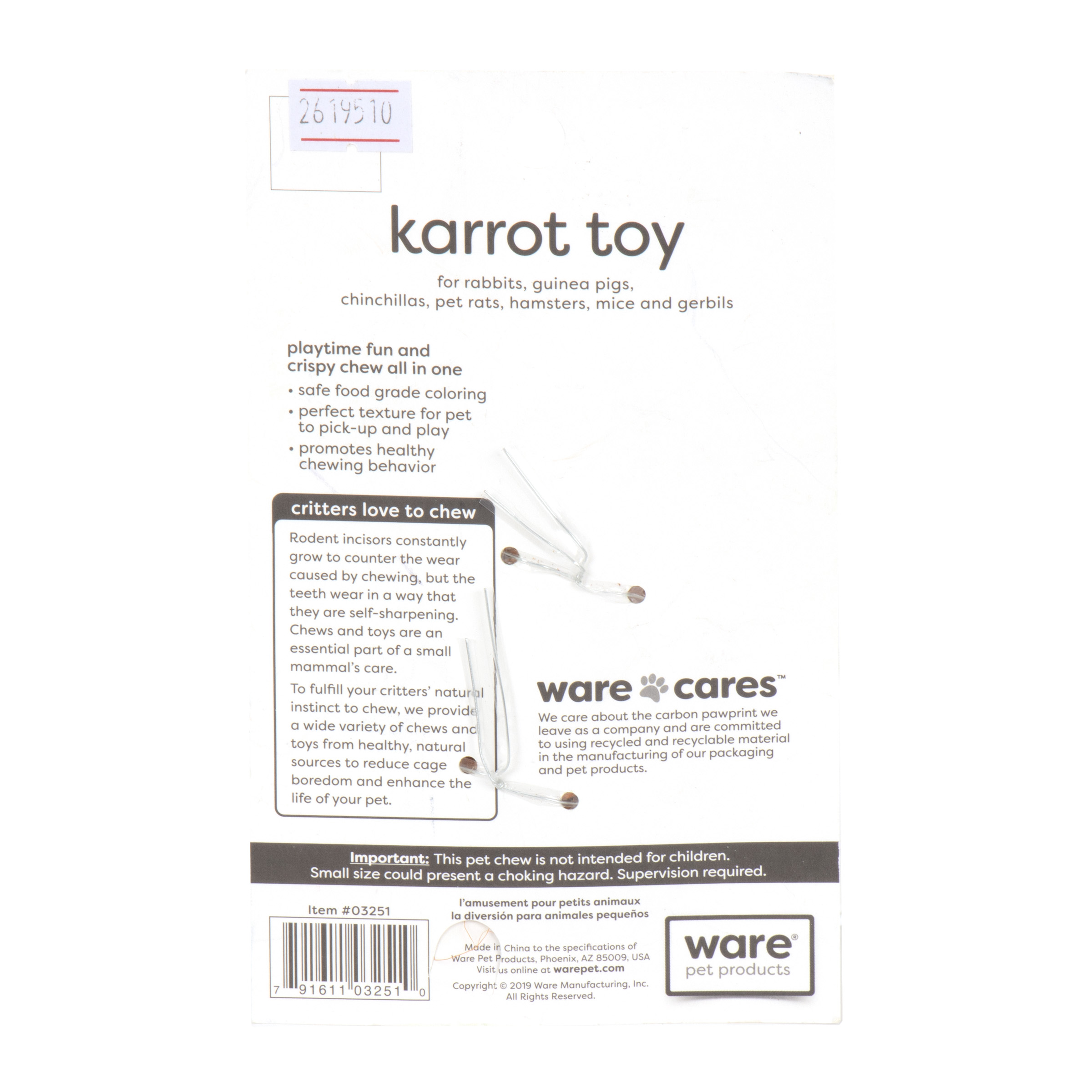 Karrot Toy is a safe and fun toy for rabbits and other small pets. Toys encourage playtime activities and help prevent cage boredom. Rabbits and other small pets love the shape and texture and owners love the creative carrot shape.