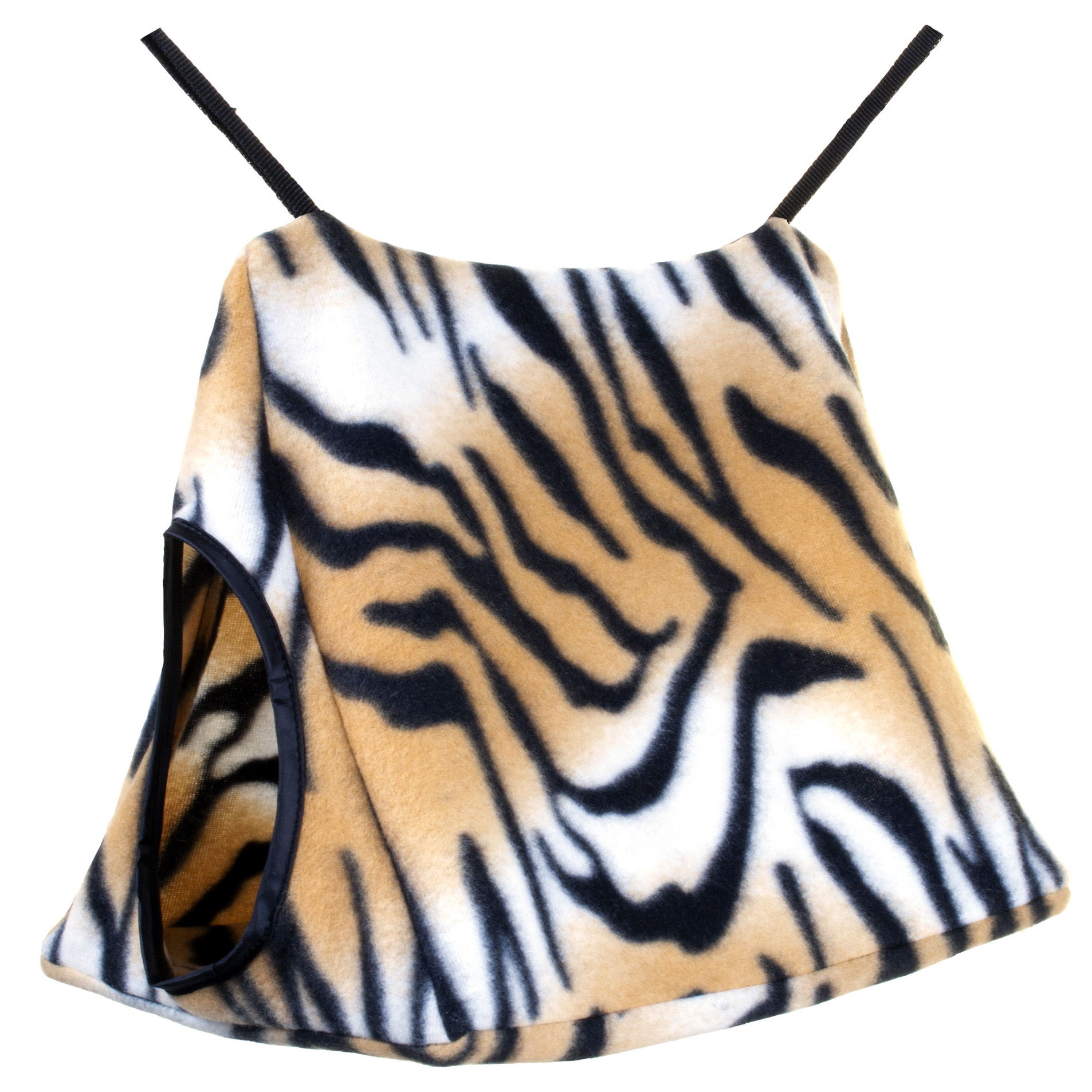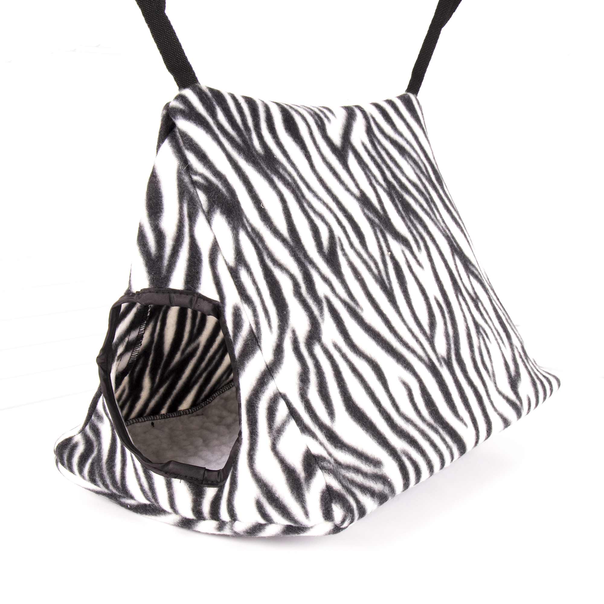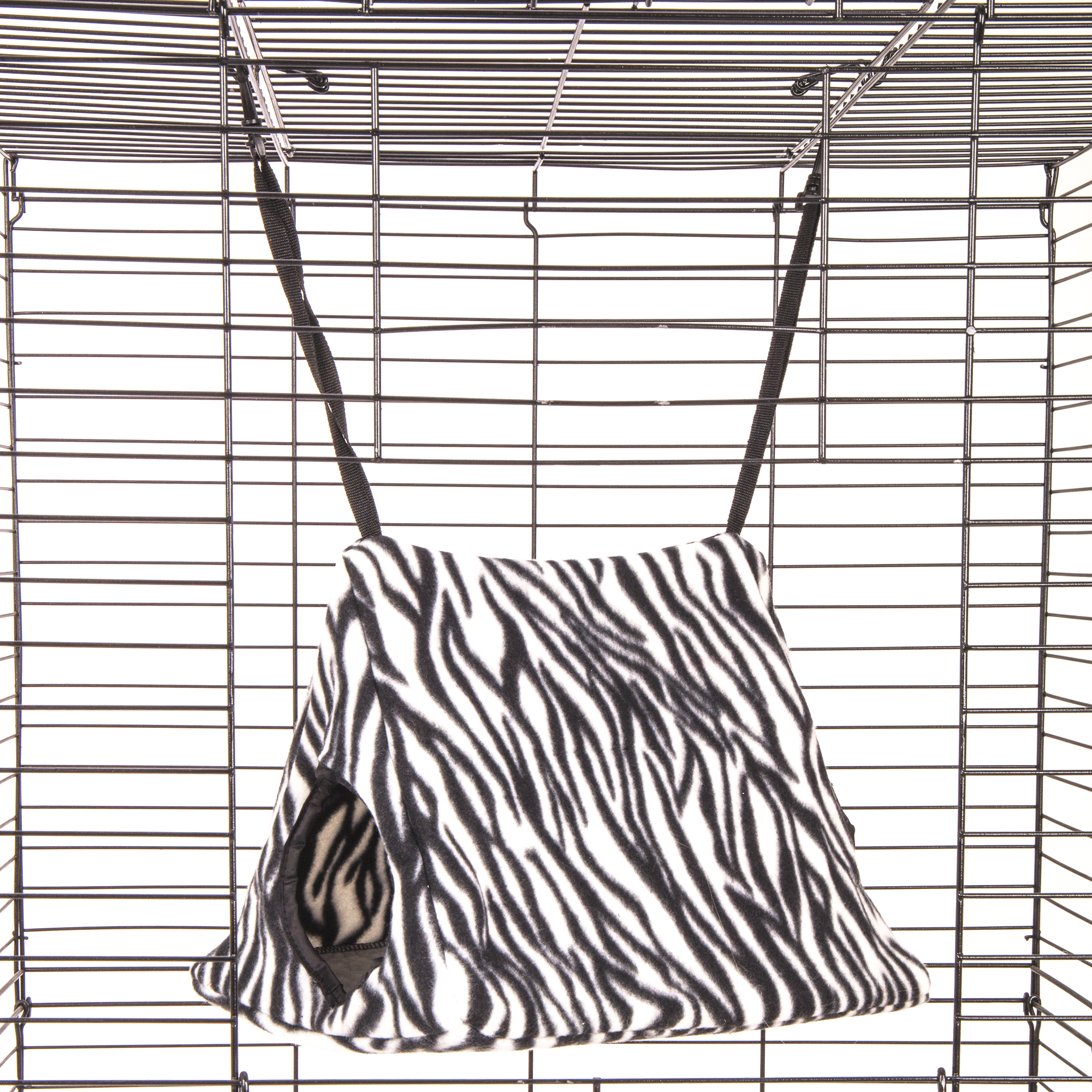 Our Hang-N-Tent fits inside any cage and features nylon straps with clips for easy attachment. This cozy animal print sleeper is soft and comfy. The fun tent design gives critters a place to play and hide and expands their living space.