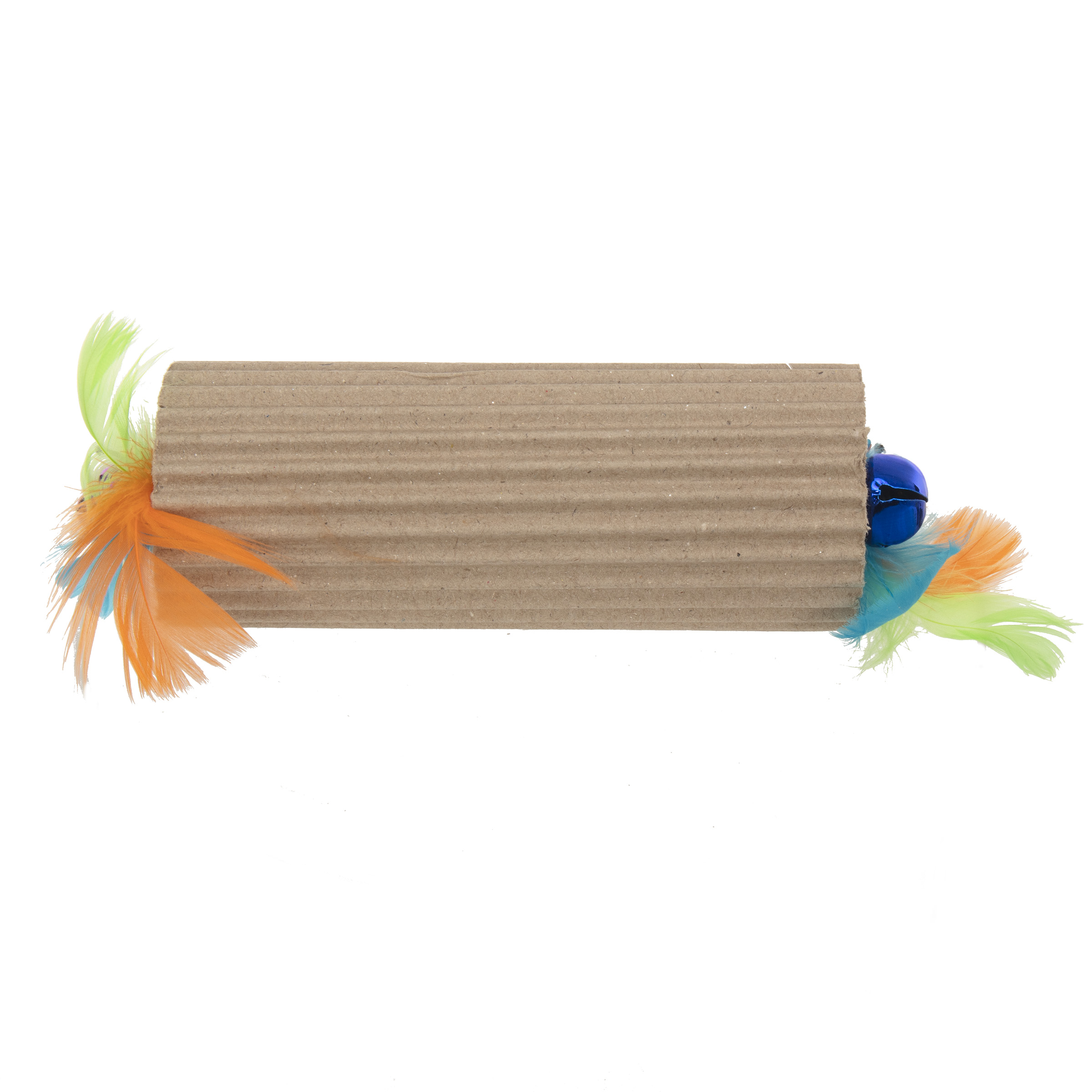 A fun corrugate toy that encourages activity and healthy exercise. As the bell bar gets batted around the bell on the end jingles for more fun. The cute shape design and colorful feathers will appeal to your playful feline.