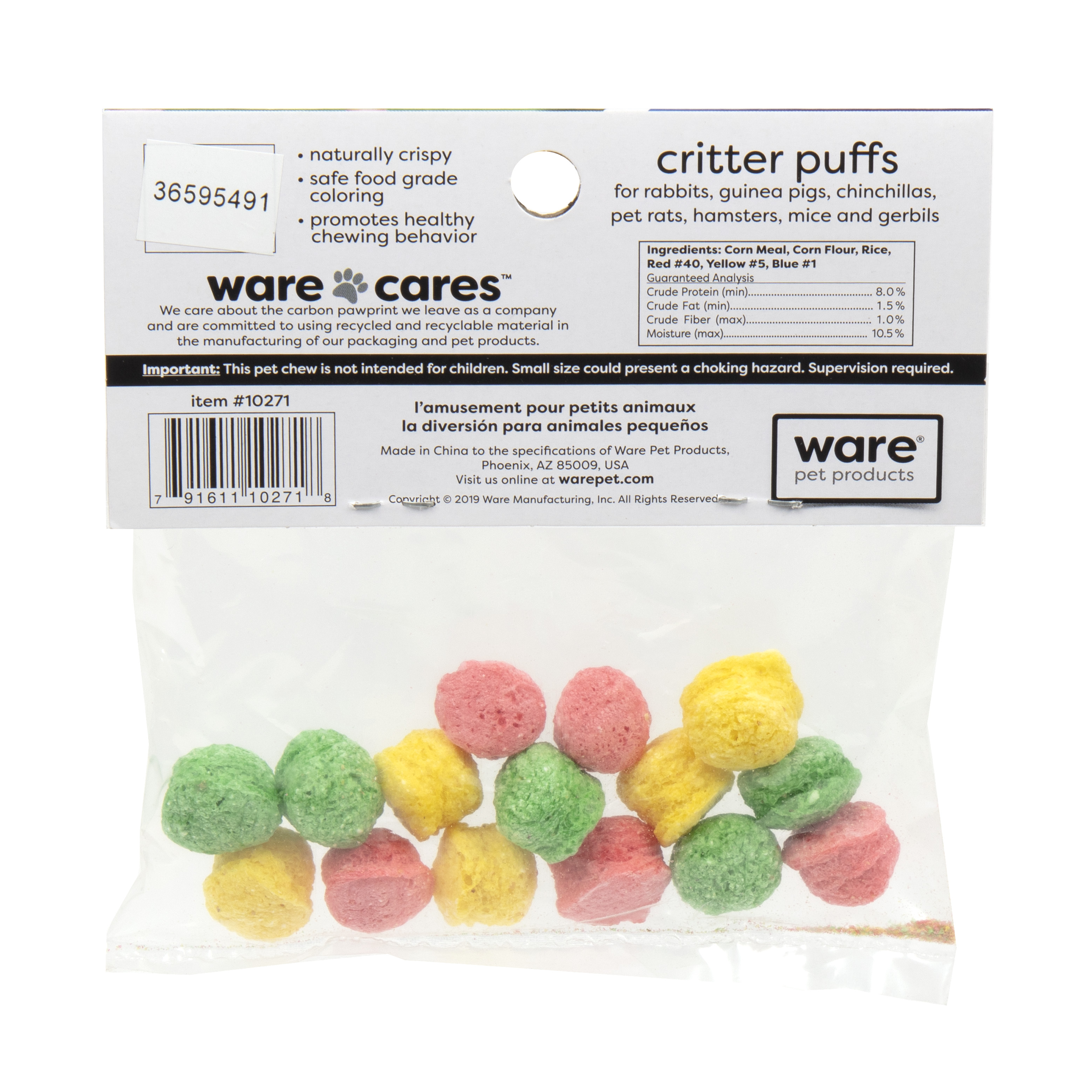 Critter Puffs are a wholesome combination of crunchy chews and flavorful fun. Ideal for hand feeding or for hand placement on the Ware Treat-K-Bob. Critter puffs are a tasty treat for rabbits, guinea pigs, chinchillas, hamsters and pet rats.