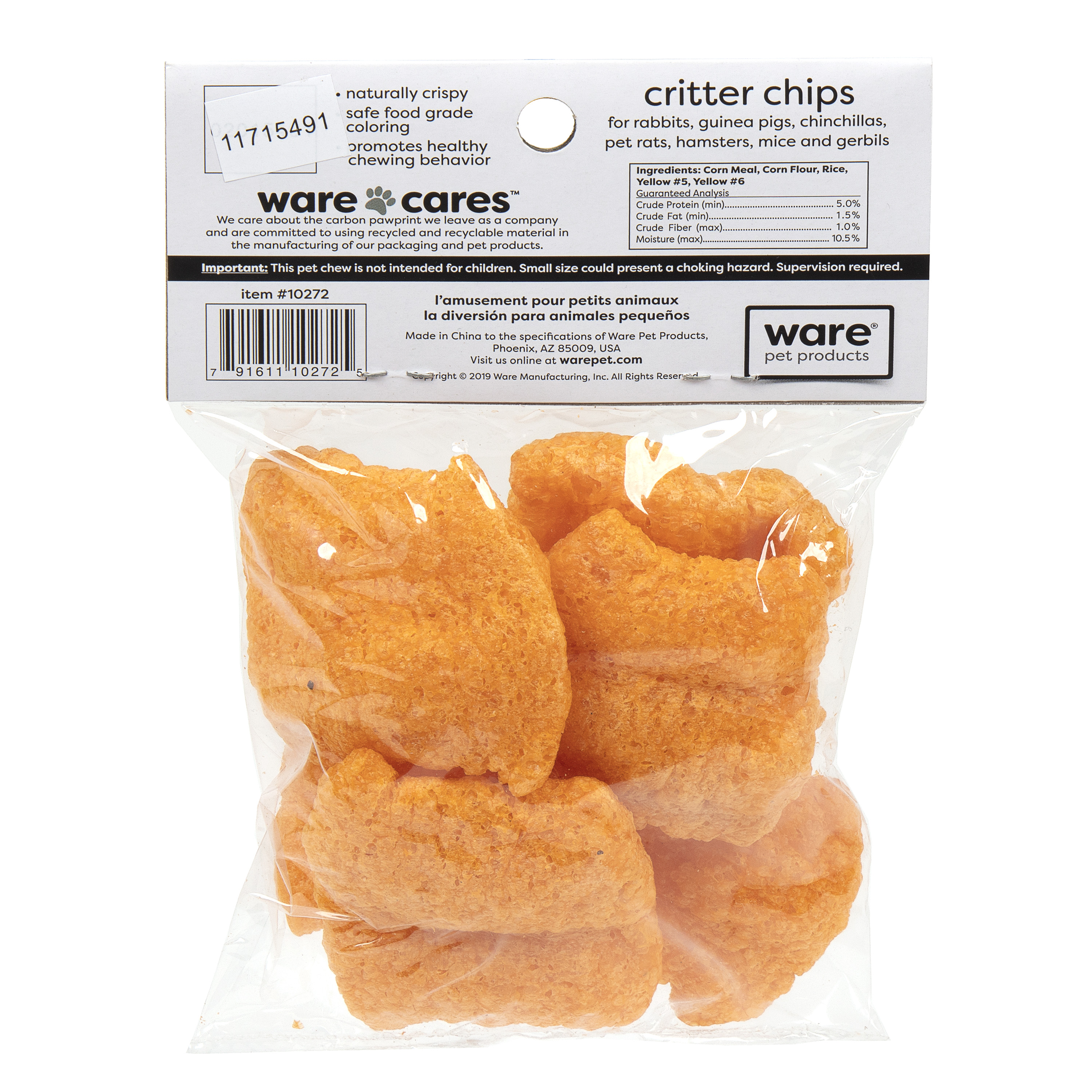 Critter Chips are a wholesome combination of crunchy chews and flavorful fun. Ideal for hand feeding or for hand placement in the cage. Critter Chips are a tasty treat for rabbits, guinea pigs, chinchillas, hamsters and pet rats.