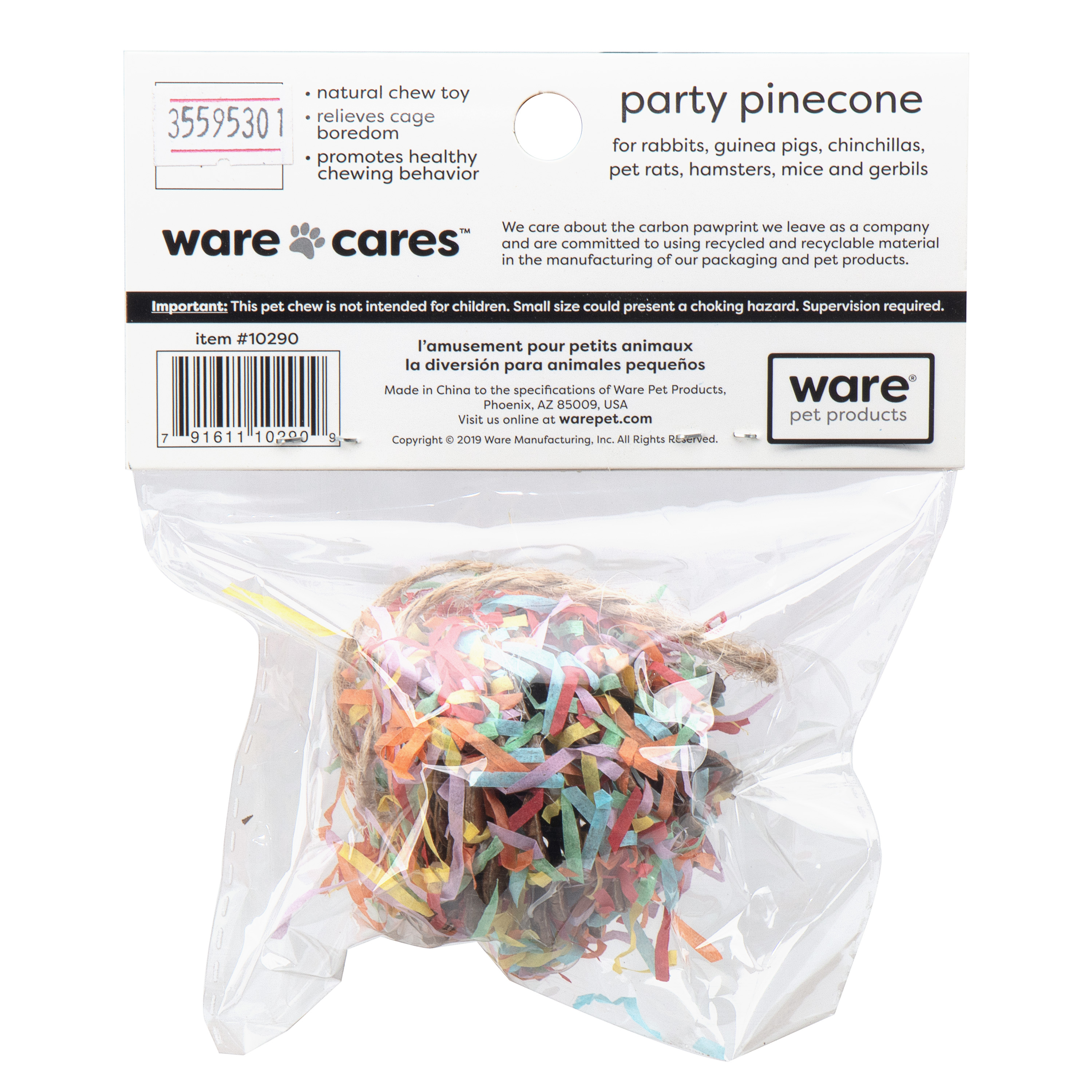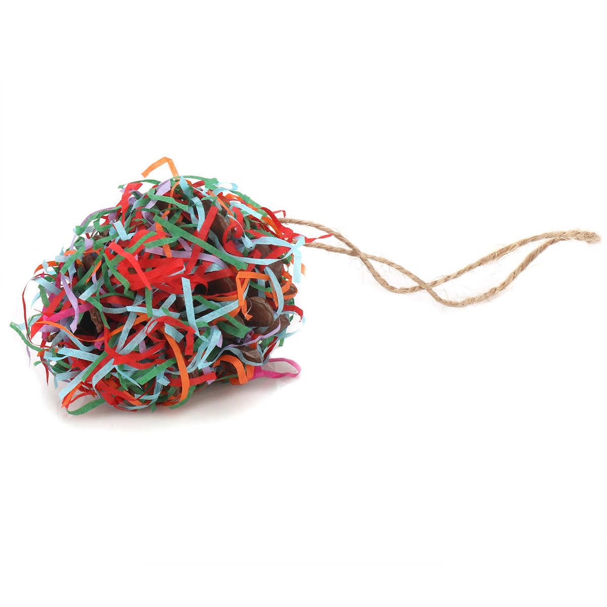 Fun pinecone with a twist. Offering a variety of enticing textures to gnaw and nibble. Can be hung in the cage or as a stand alone treat.