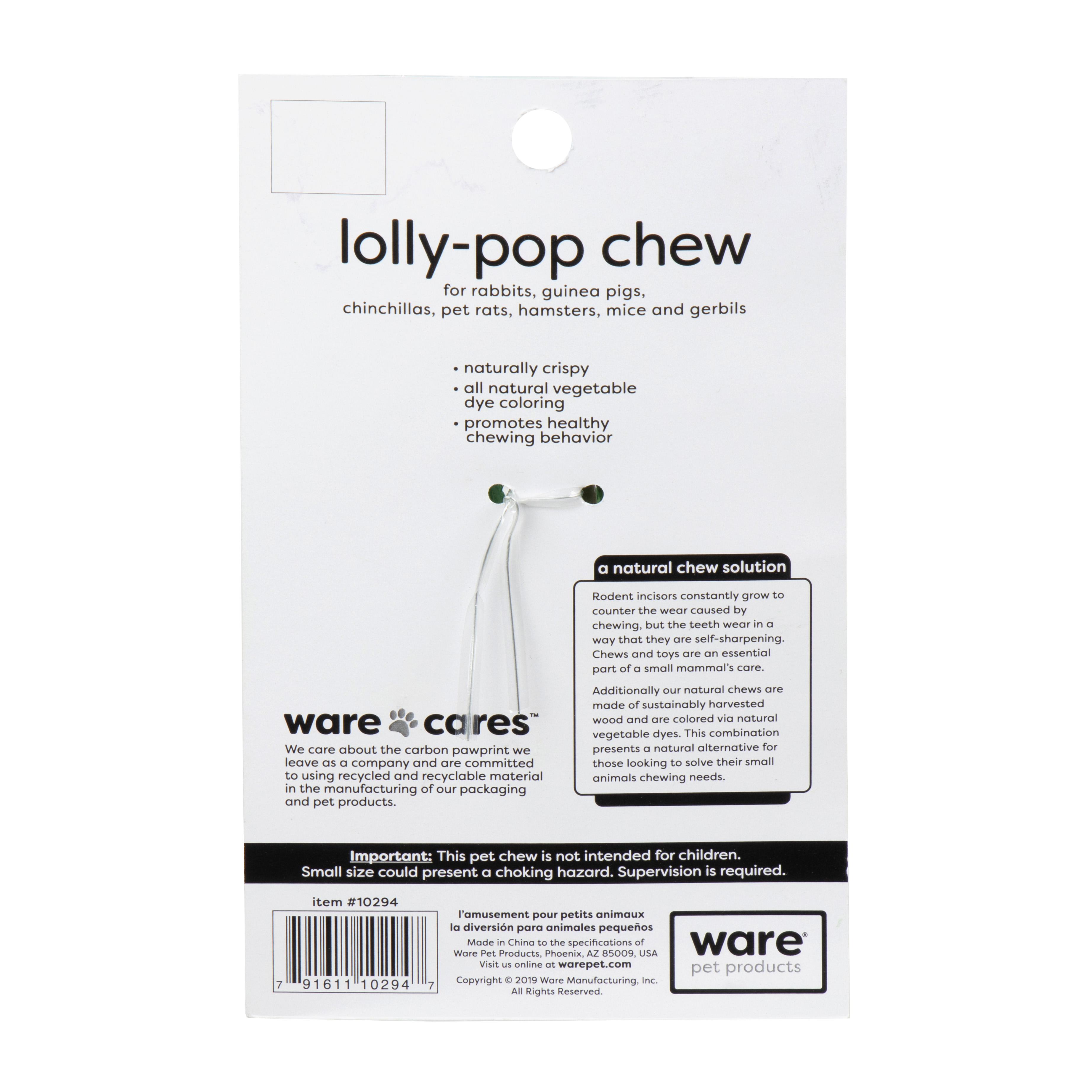 Fun all natural chew shaped like a lolly-pop. Made with natural wood construction and all natural dye coloring that is safe for critters to chew.