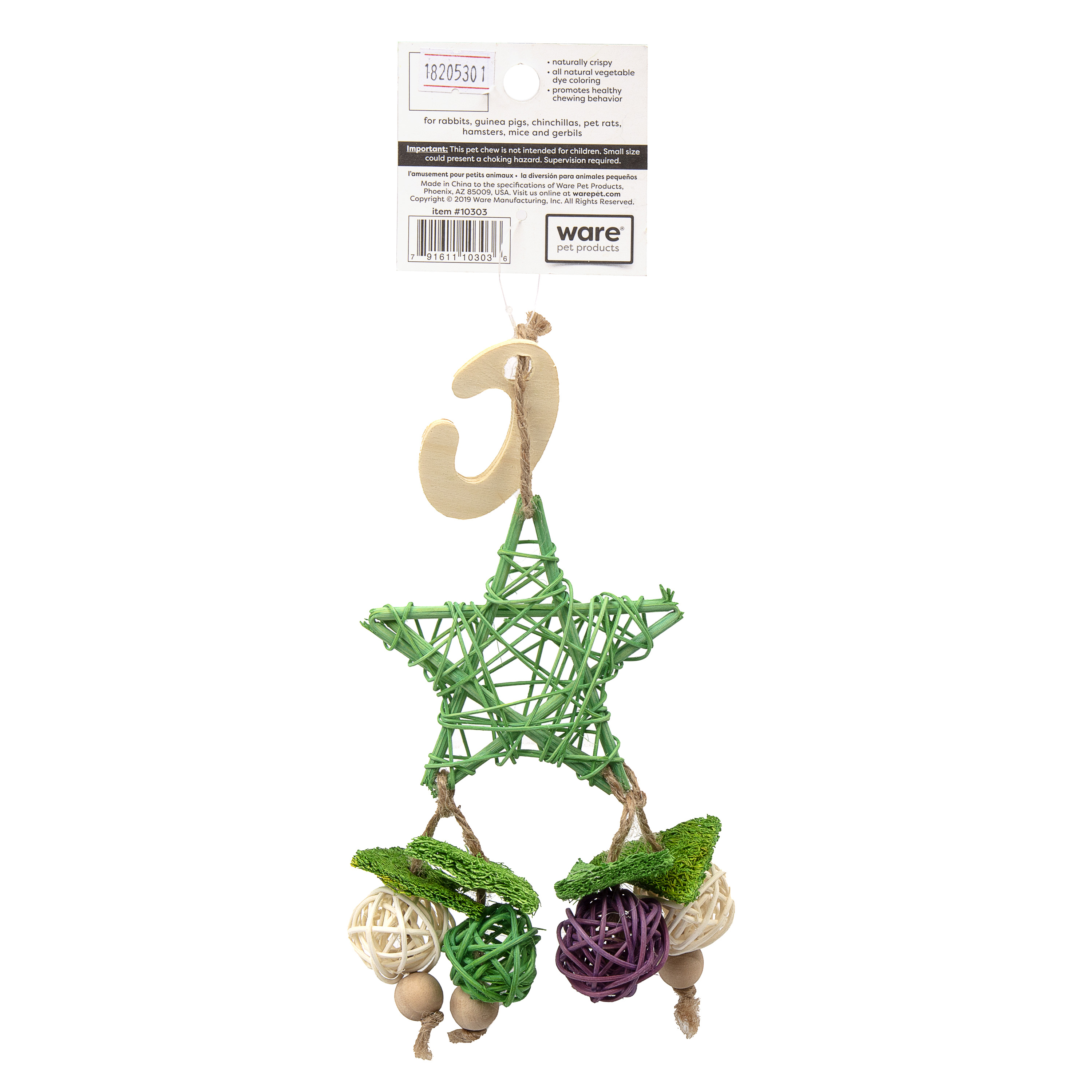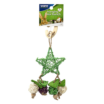 The Hanging Star Bunch hangs inside any cage to provide an enticing array of chewtime fun. Made from all natural materials that are safe for small animals.