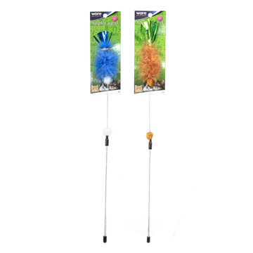 Provides a mix of tantalizeing textures that can bring out a felines playful, inquisitive nature. The colorful feather and vivbrant poly-film are perfect for gaining their attention. The wire and sparkly wand make playtime easy to control.