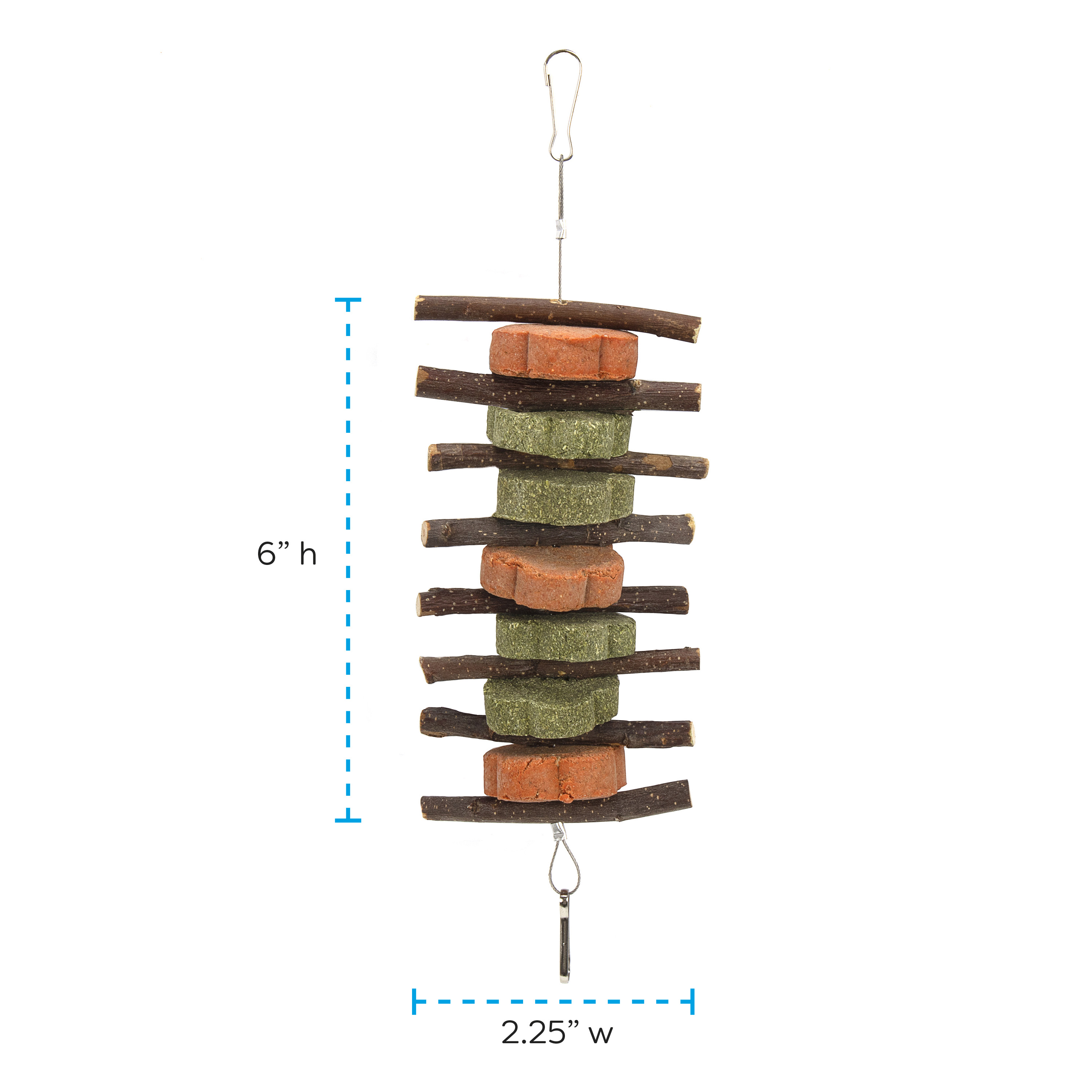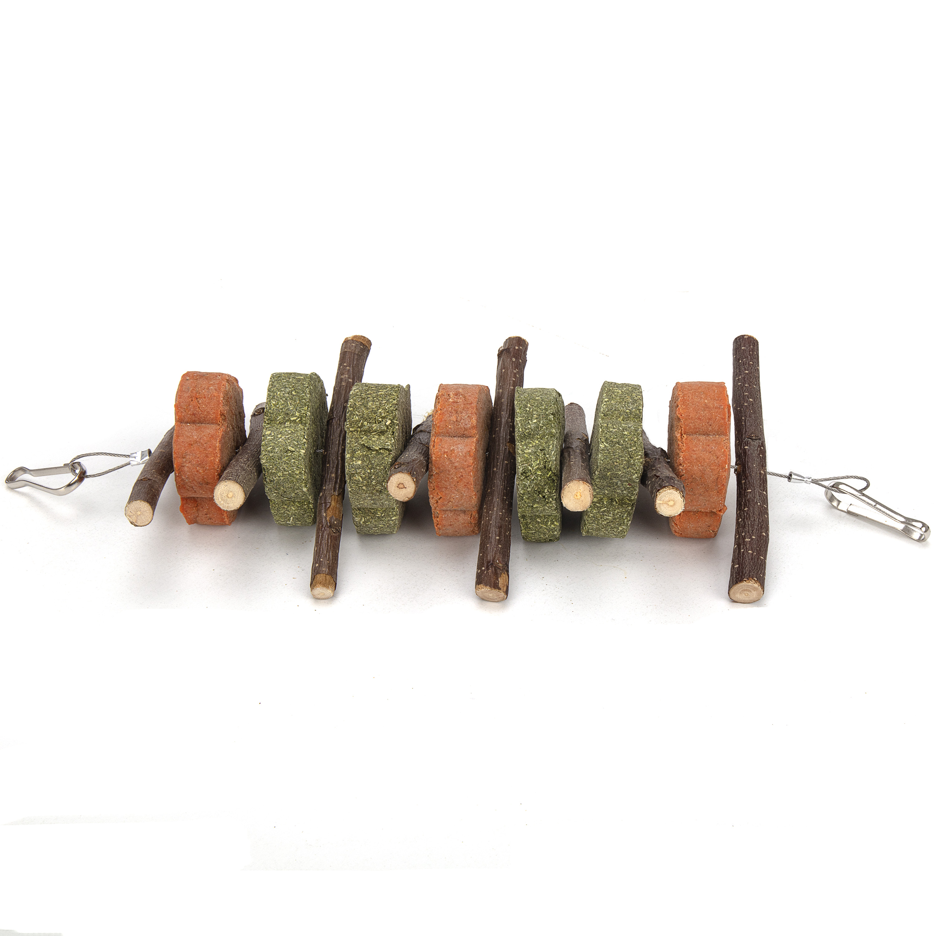 A tasty chew treat of twigs, ground timothy hay and ground carrots. Can hang anywhere inside cage for hours upon hours of chewtime fun. Helps to keep teeth clean and trimmed. Helps reduce cage boredom.