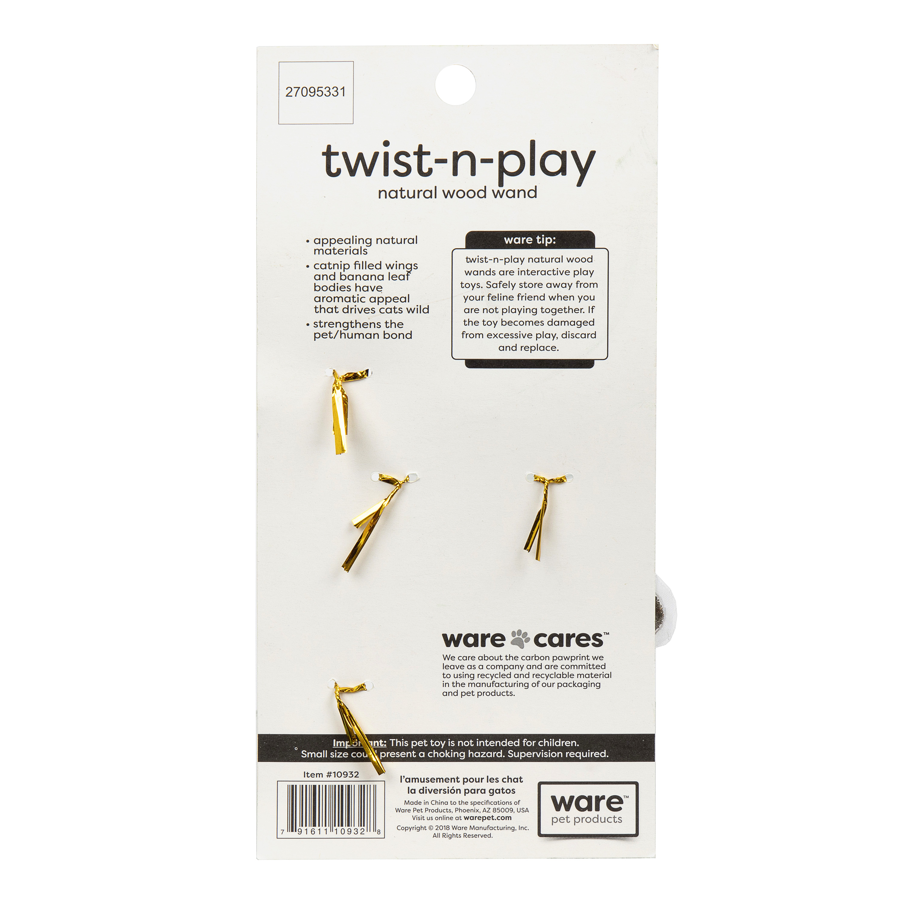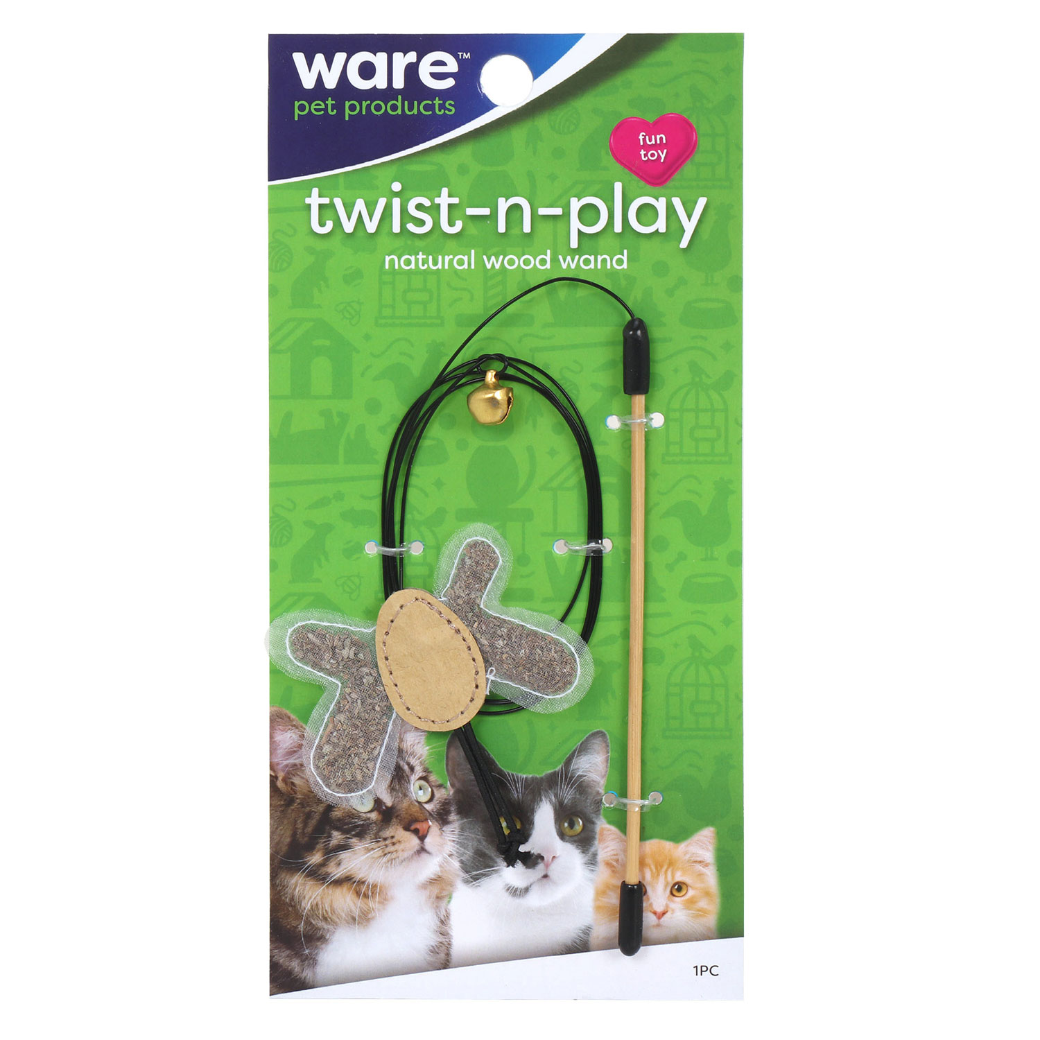 Twist-N-Play is wooden wand that teases and tantalizes cats with a twist and turn of your fingertips! Catnip filled wings and natural banana leaf bodies have an aromatic appeal that drives cats wild. The interactive Twist-N-Play toy provides mental and physical stimulation.