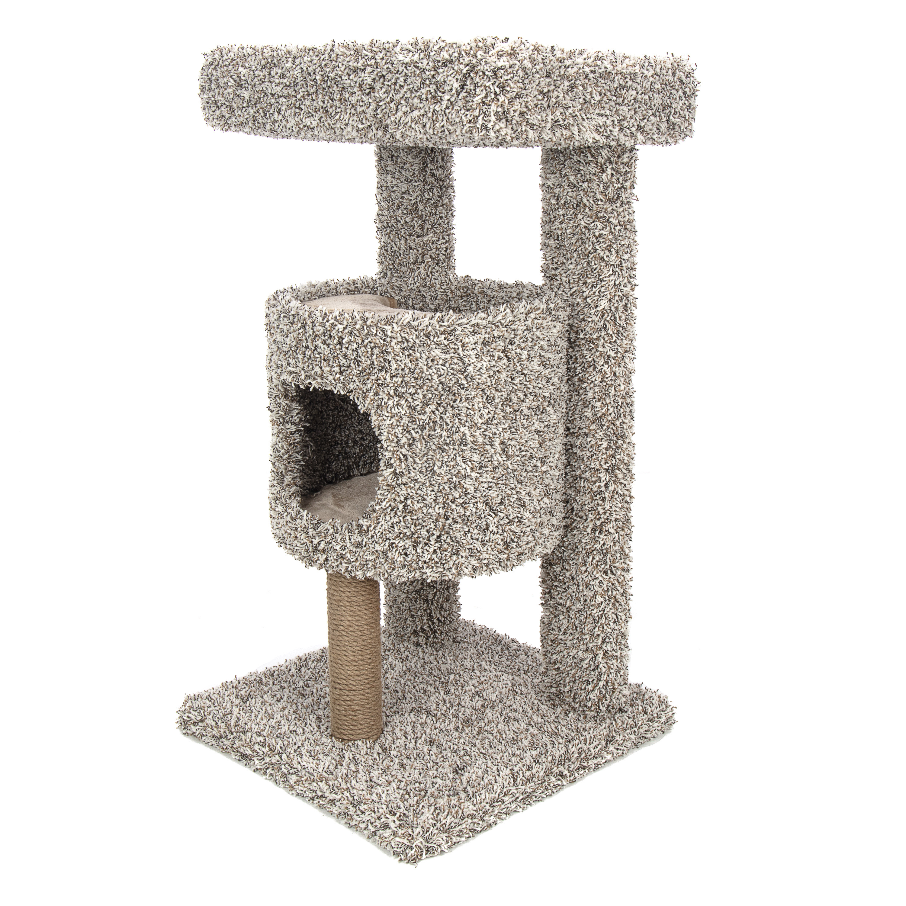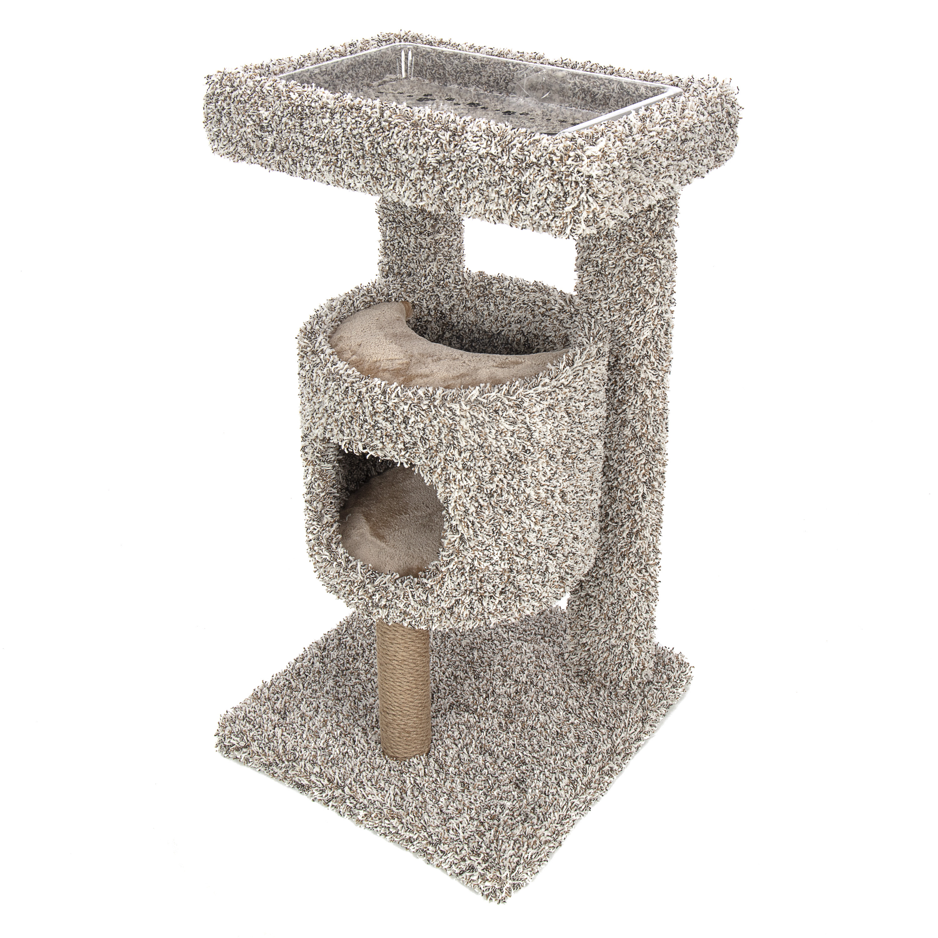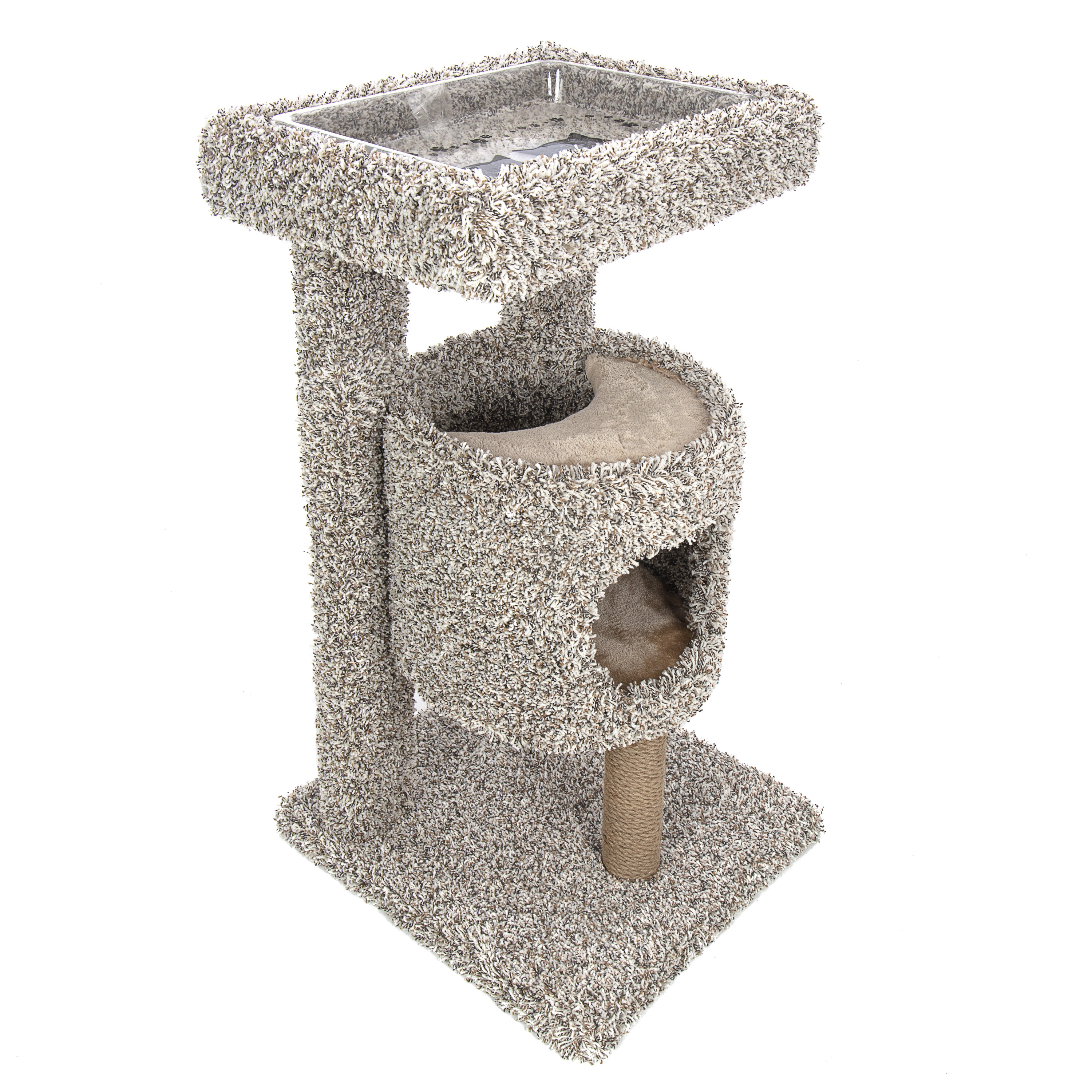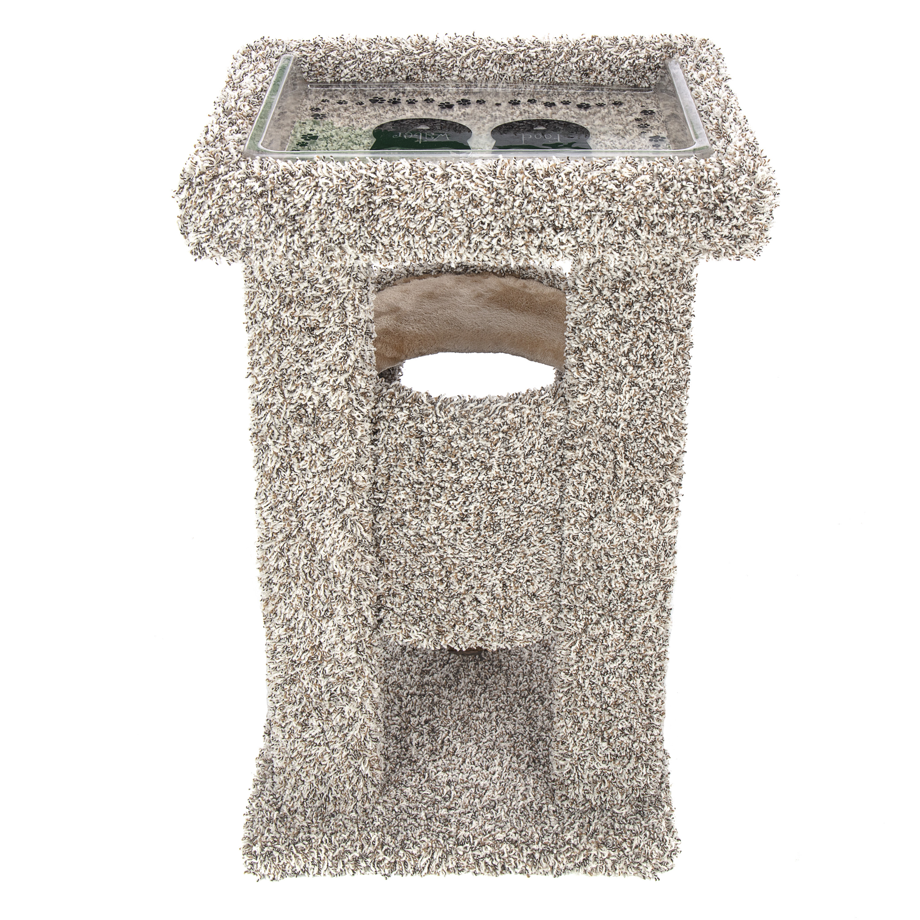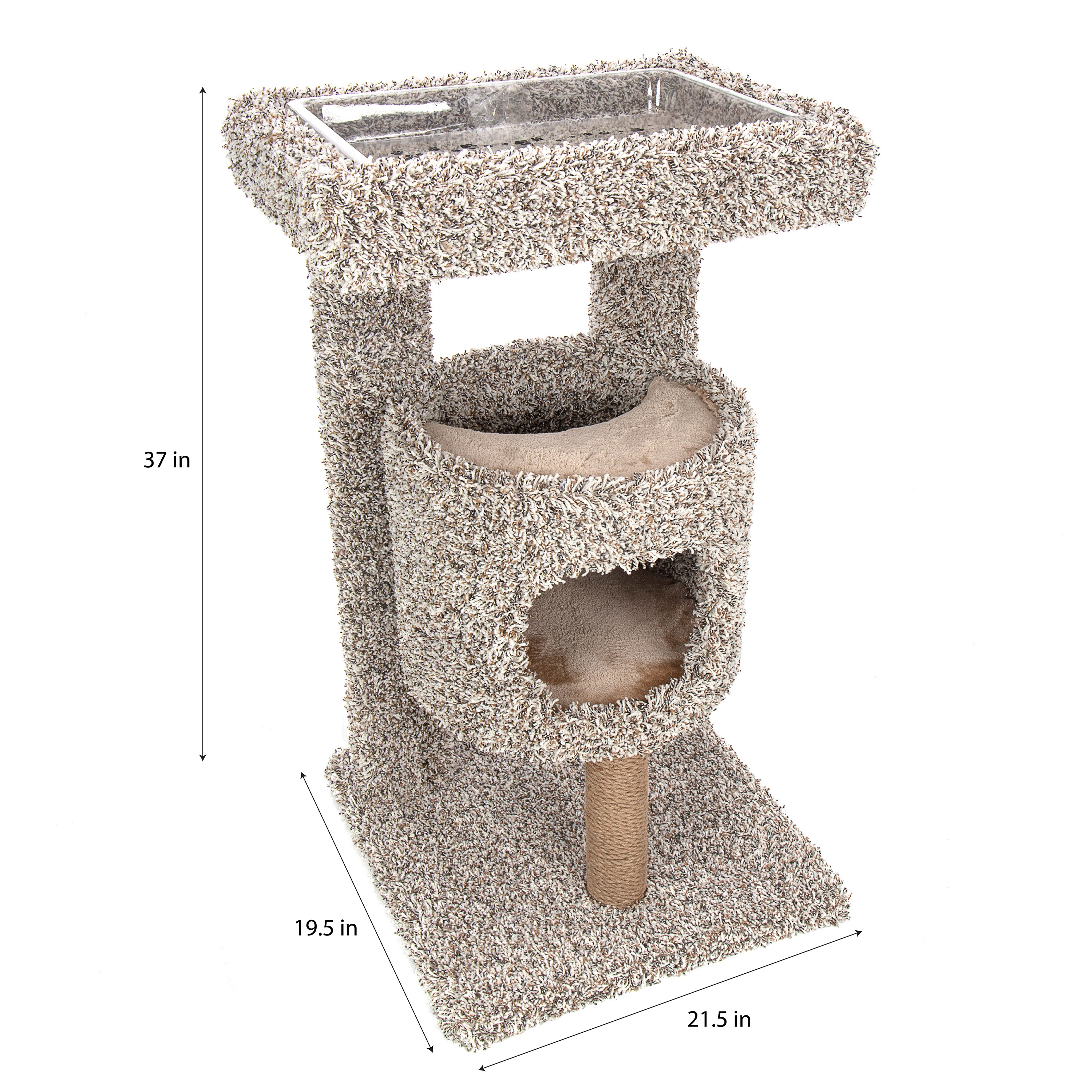 Unique design allows cats to dine in style above the madness below. Plush lined condo for the ultimate kitty napping experience. Rope and carpet surfaces for healthy scratching.