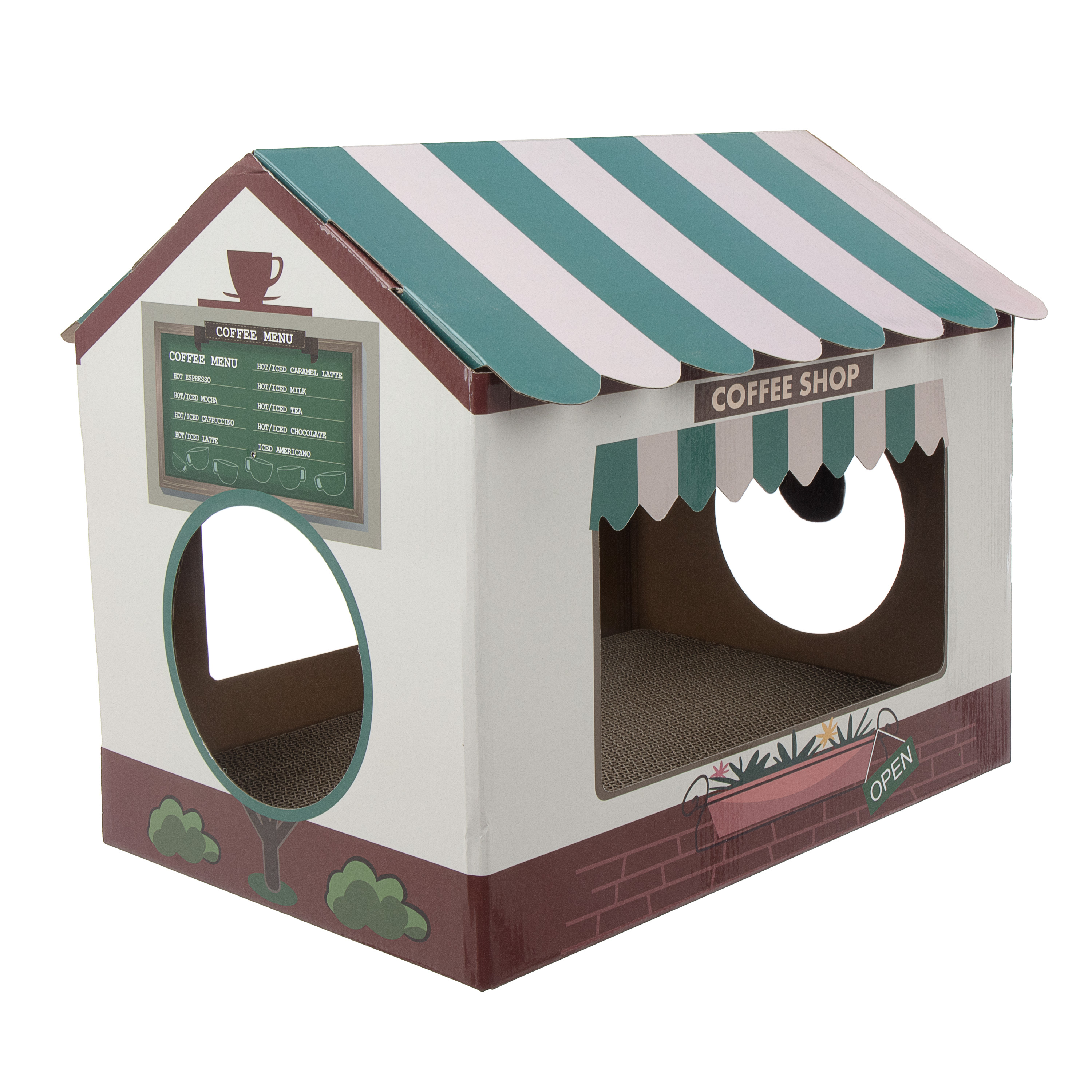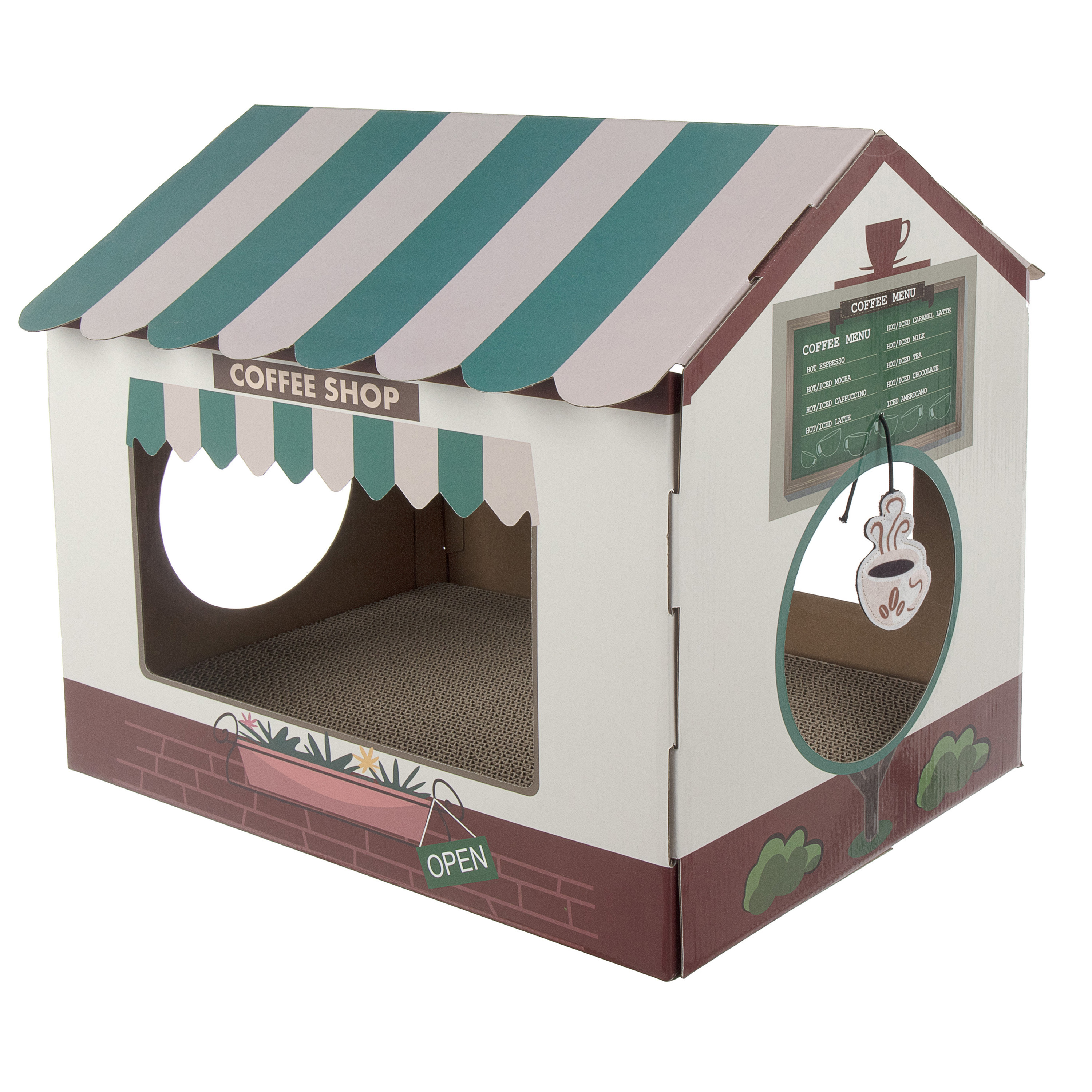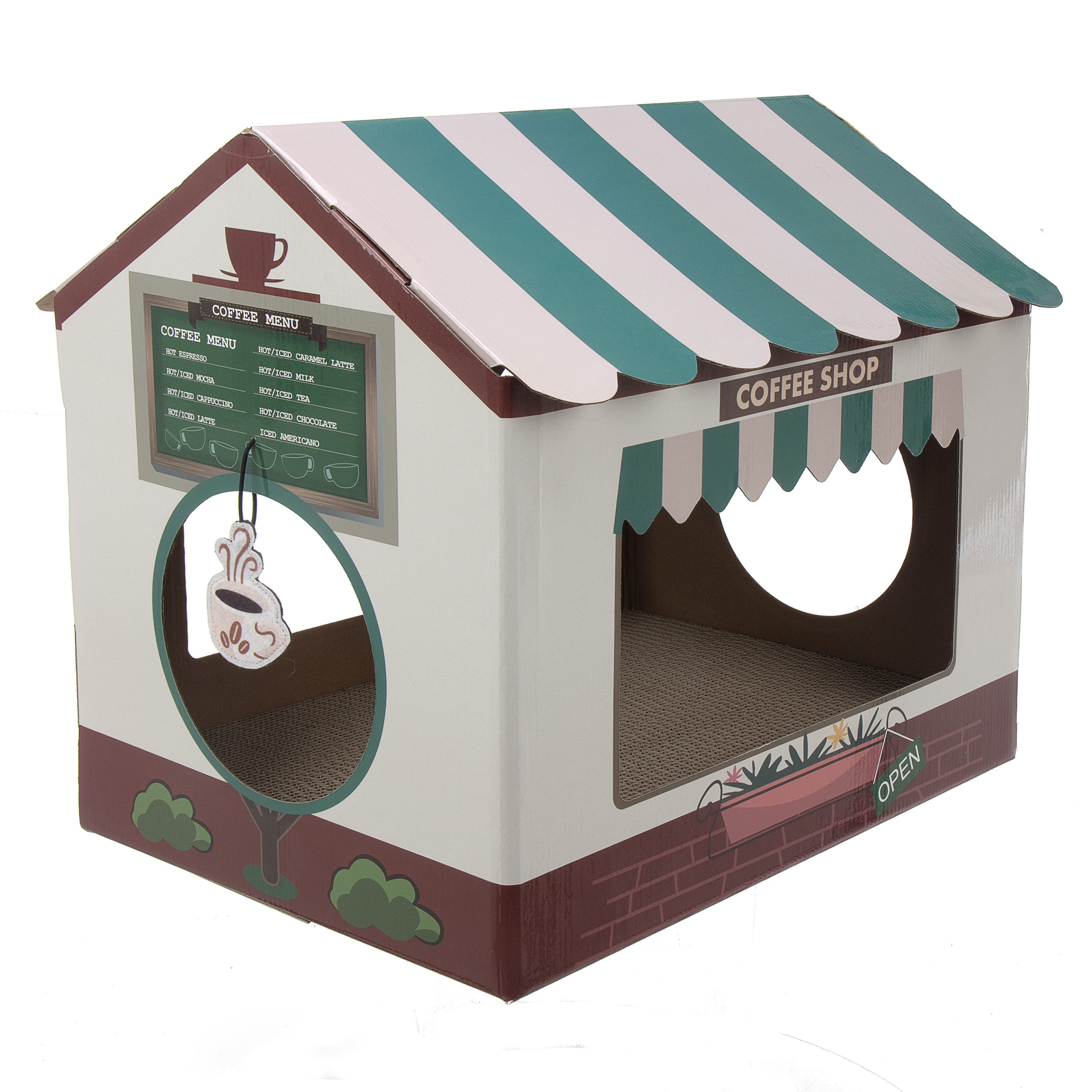 A fun themed play-n-scratch place for your active feline. Includes a hanging coffee cup shaped dangler to entice your kitty to play and engage their natural instincts