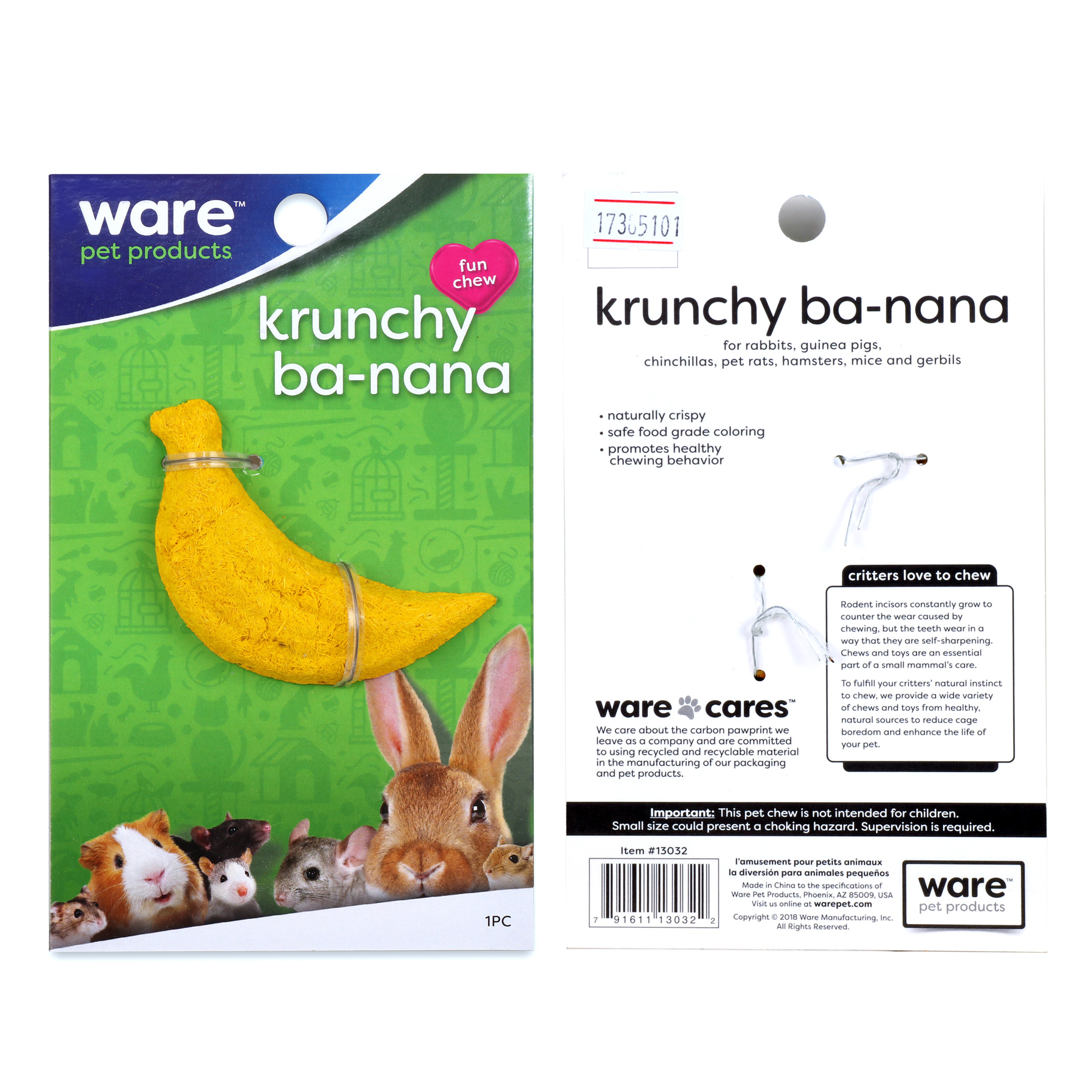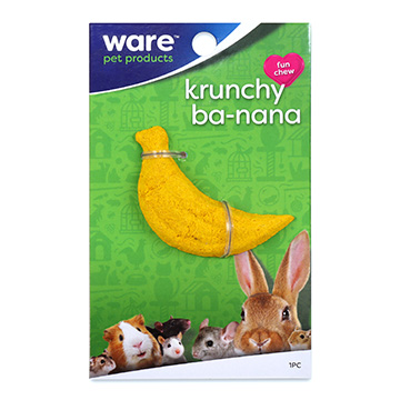 The Krunchy Ba-Nana is a safe, fun chew for small animals. Chews keep teeth trimmed and provide a fun activity that relieves cage boredom. Supervision is recommended.