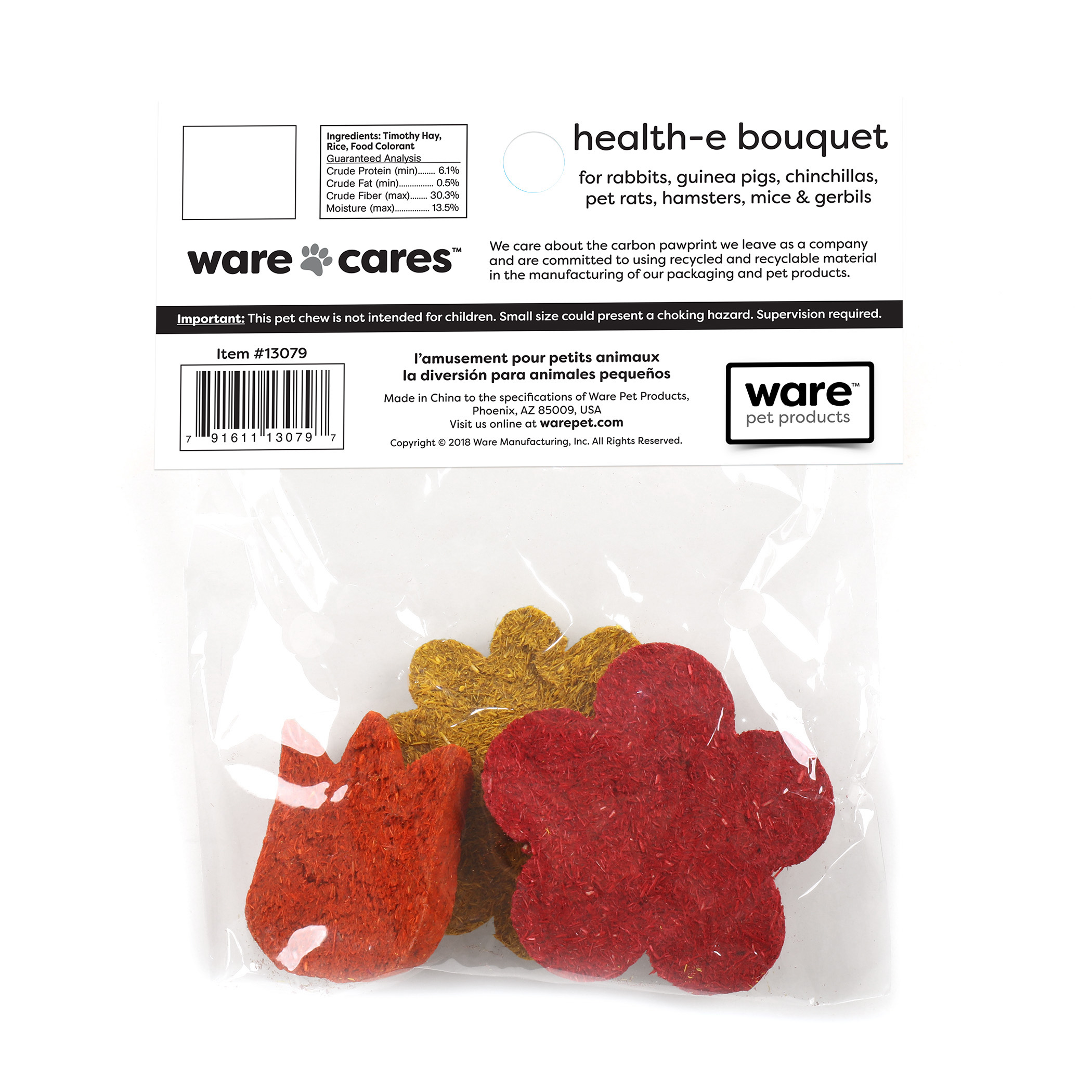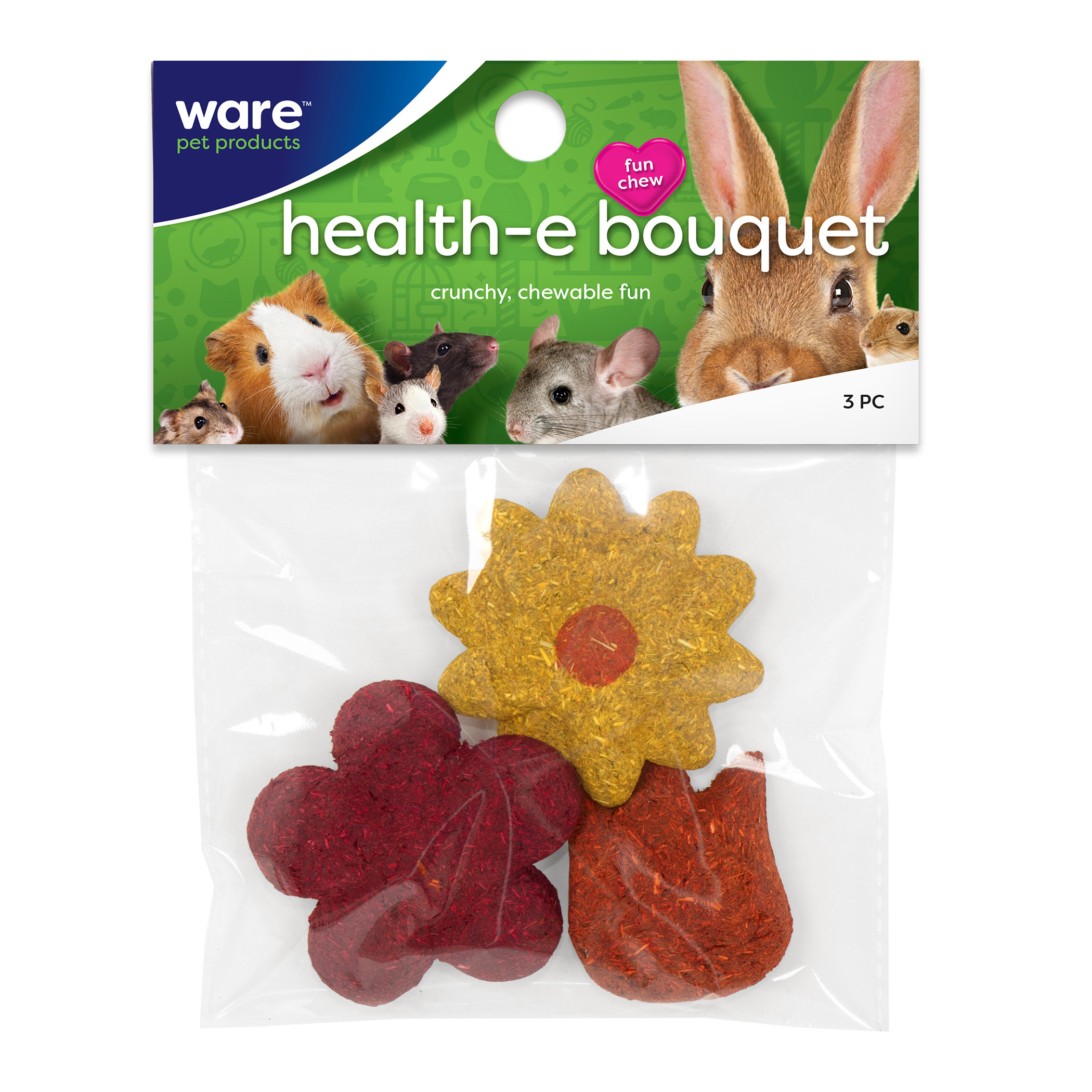 The Health-E-Bouquet is a safe, fun chew for small animals. Chews keep teeth trimmed and provide a fun activity that relieves cage boredom. Supervision is recommended.