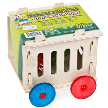 The Burrow-N-Buggy is the perfect critter carriage for nibbling and naps. This natural wood buggy can be used as either a hideout or treat holder. Hideout works best for hamsters, mice and gerbils. Safe for all small pets to chew. Includes free confetti bedding.