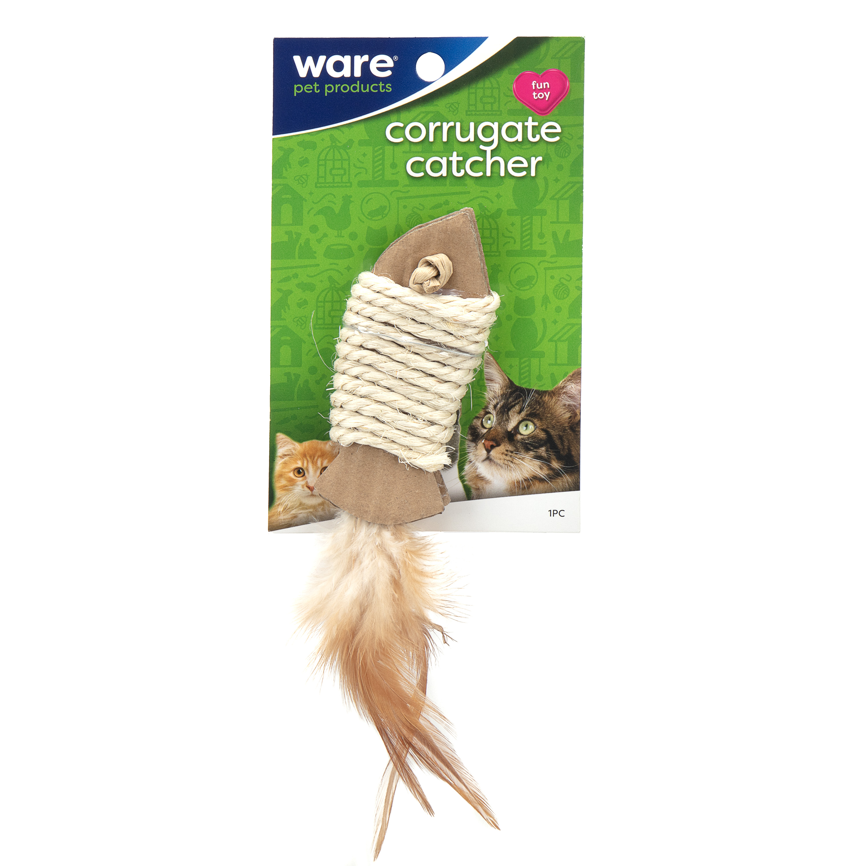 Enticing cat toy made with irresistible materials consisting of corrugate, sial rope and feathers. The shape and size of this toy will keep kitties entertained and active.