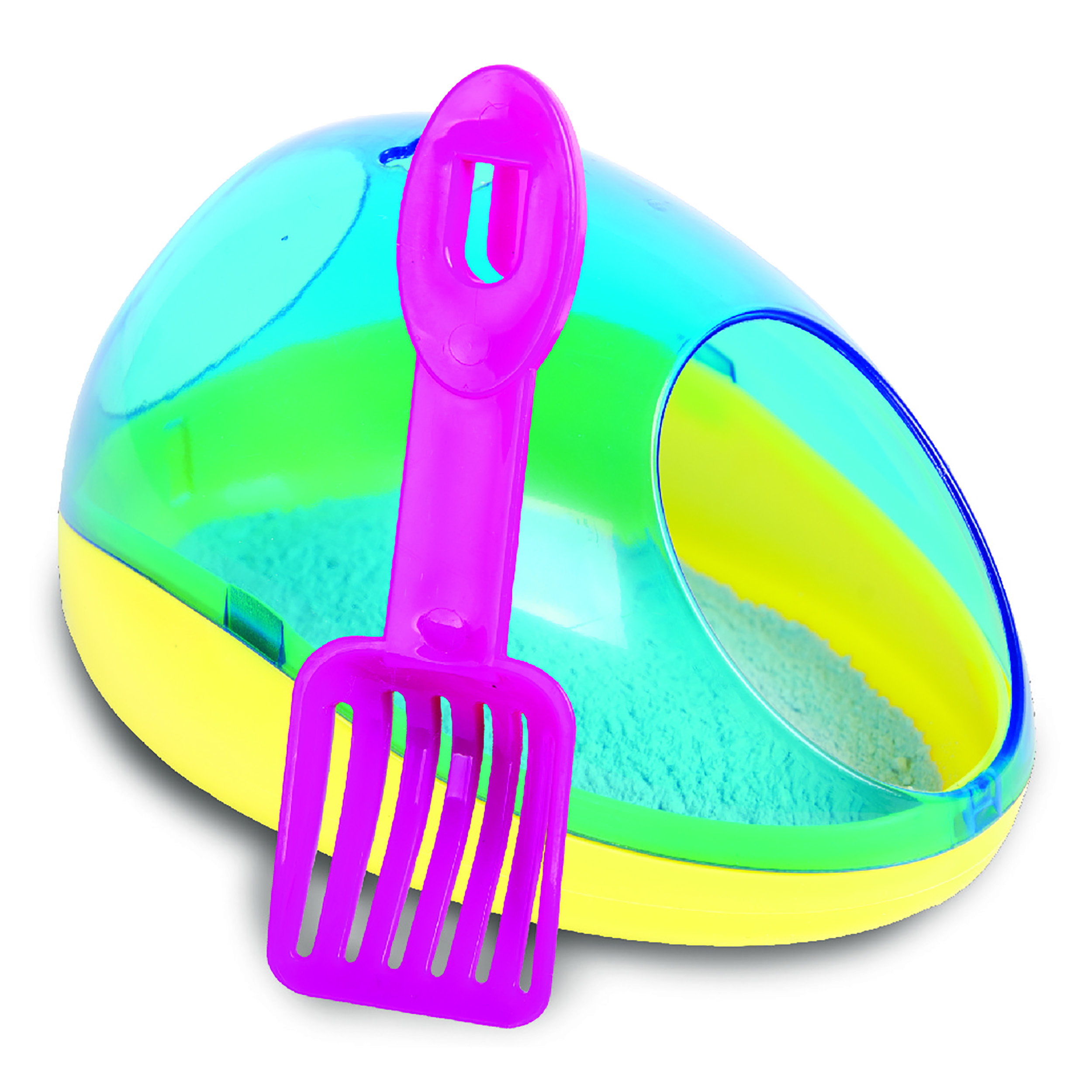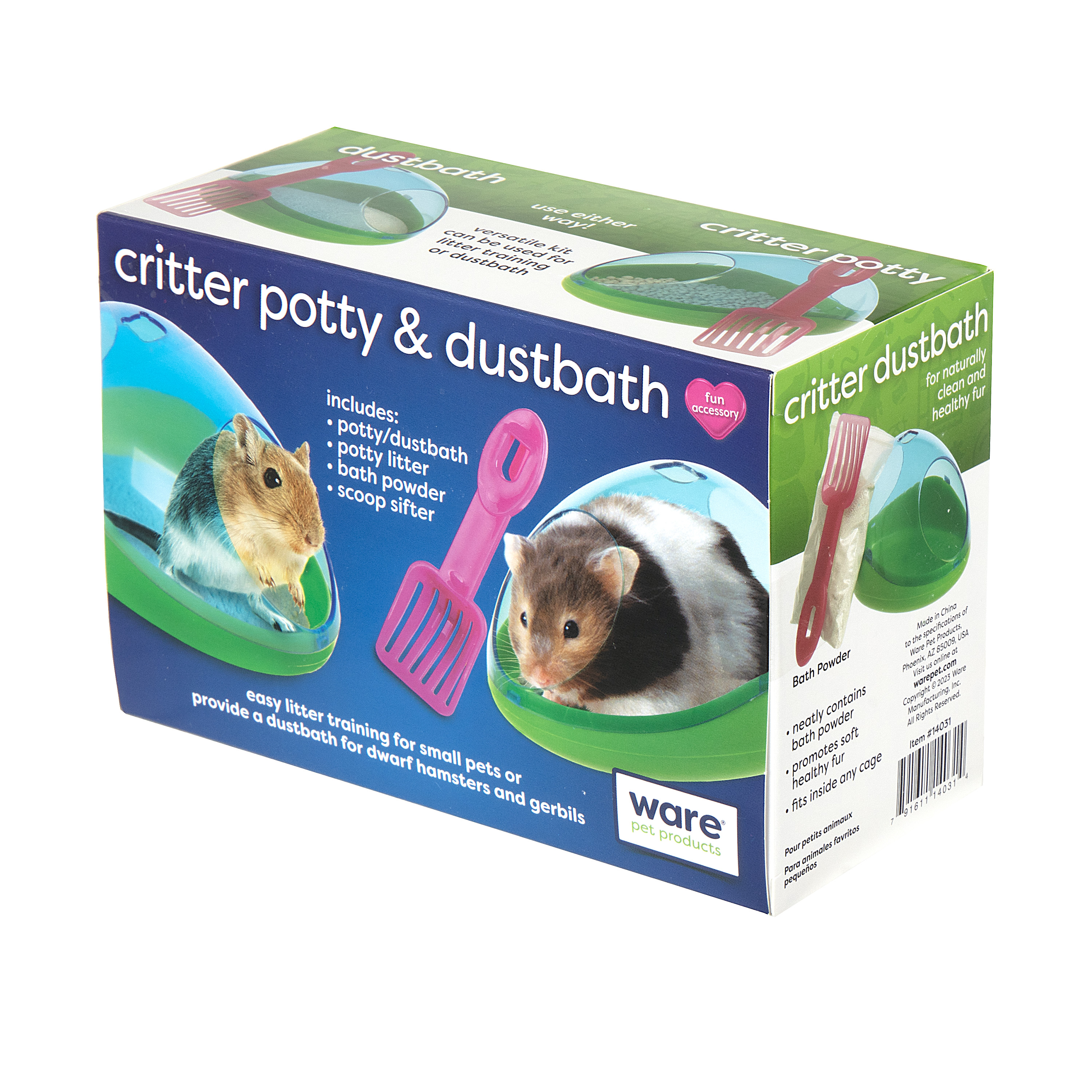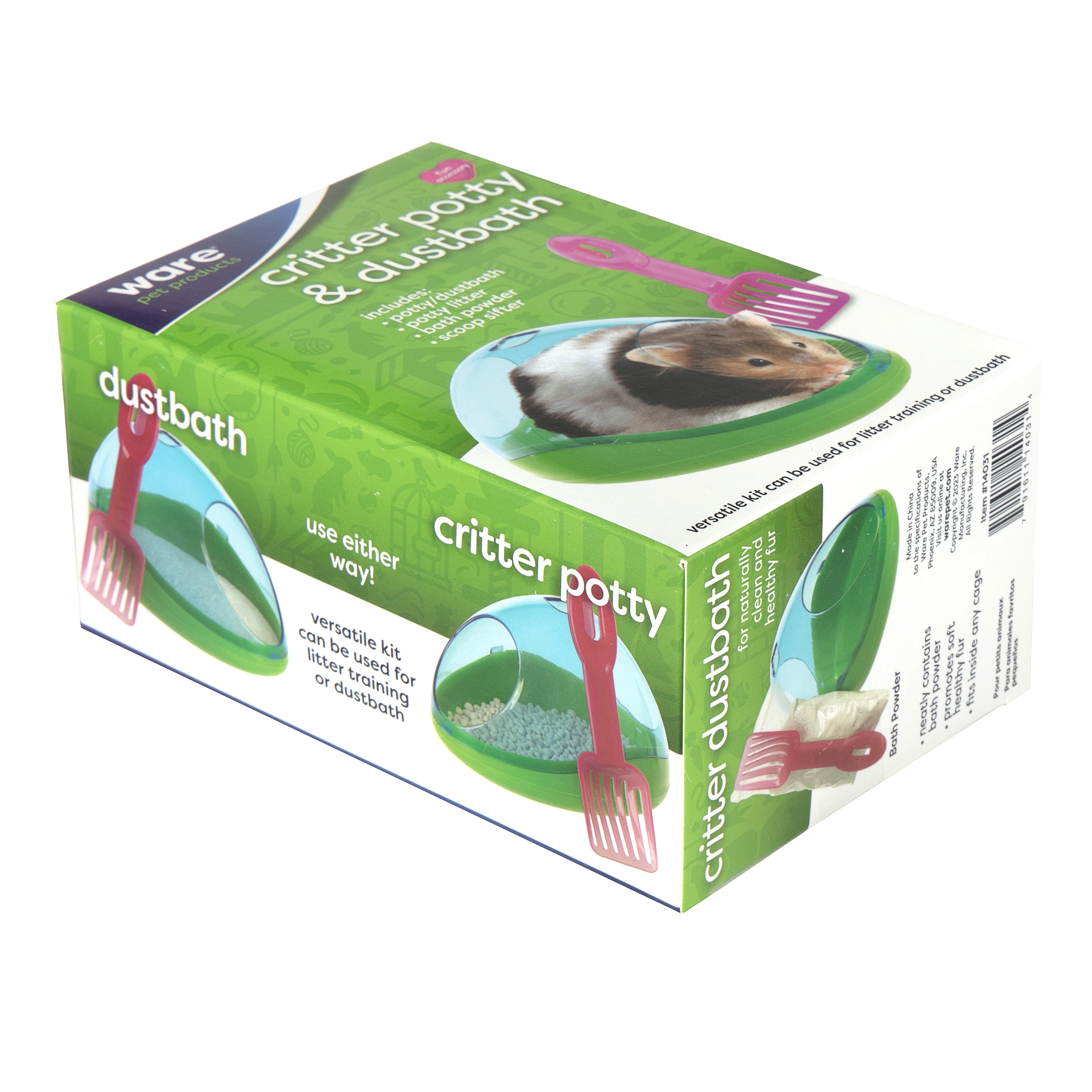 Critter Potty & Dustbath Kit is a versatile item that can be used for litter training or as a dust bath to promote soft healthy fur. Includes the critter potty, one sample each of critter litter and bathing dust and a handy scoop. Snaps apart for easy cleaning.