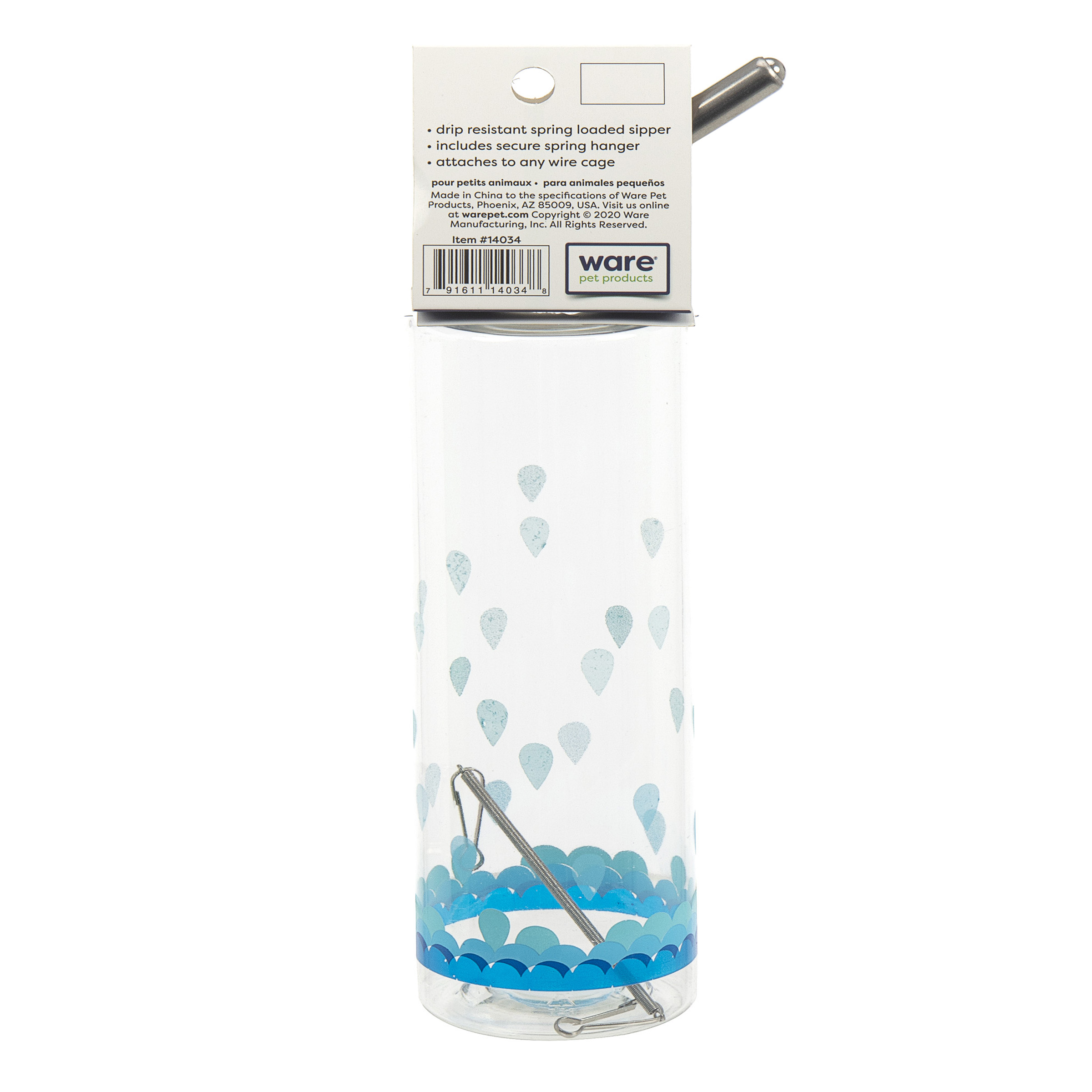 Crystal Clear bottles provide a source of clean water for small pets. Clear plastic allows for easy viewing of water level and the spring loaded sipper is drip resistant. Attaches to any wire cage with included spring hanger.