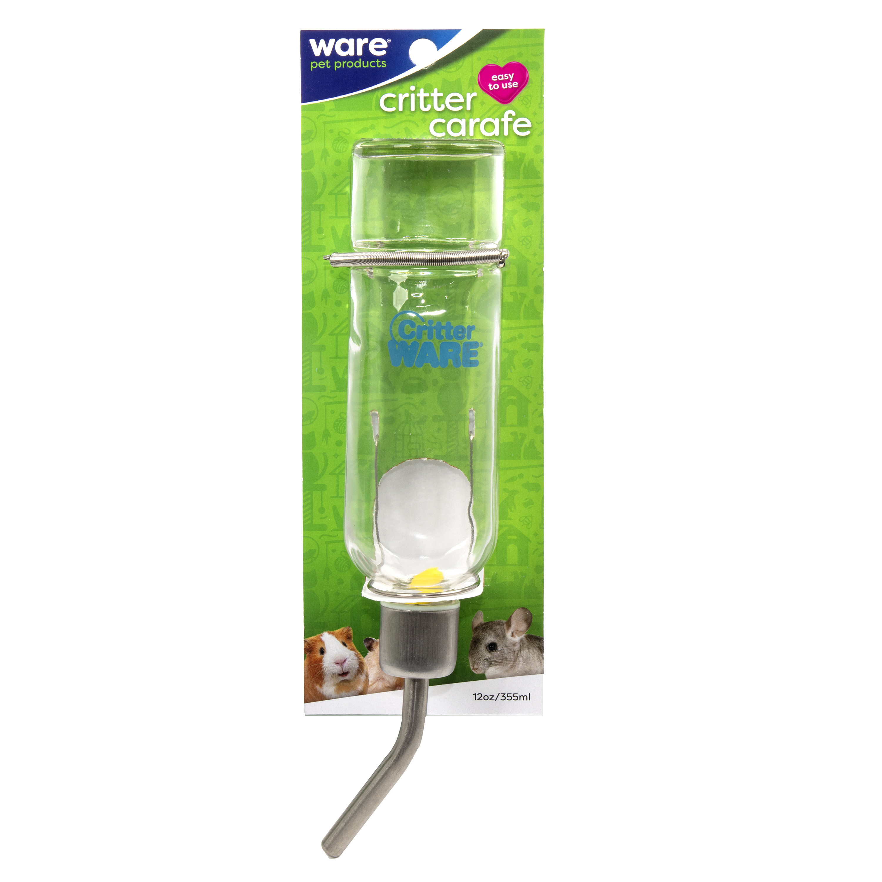 Critter Carafe is a premium quality glass bottle with a chew-proof design and drip resistant sipper. Simply secure tension spring and steel support. Can be used inside or outside a cage. Includes a floating water level indicator.