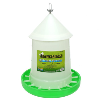 The Ware Chick-N-Feeder holds up to 17lbs. of food. With a UV stabilized plastic construction, this feeder will hold up in all-weather conditions. Features include easy to clean 3 piece design, hanging metal hook and food flow adjuster.