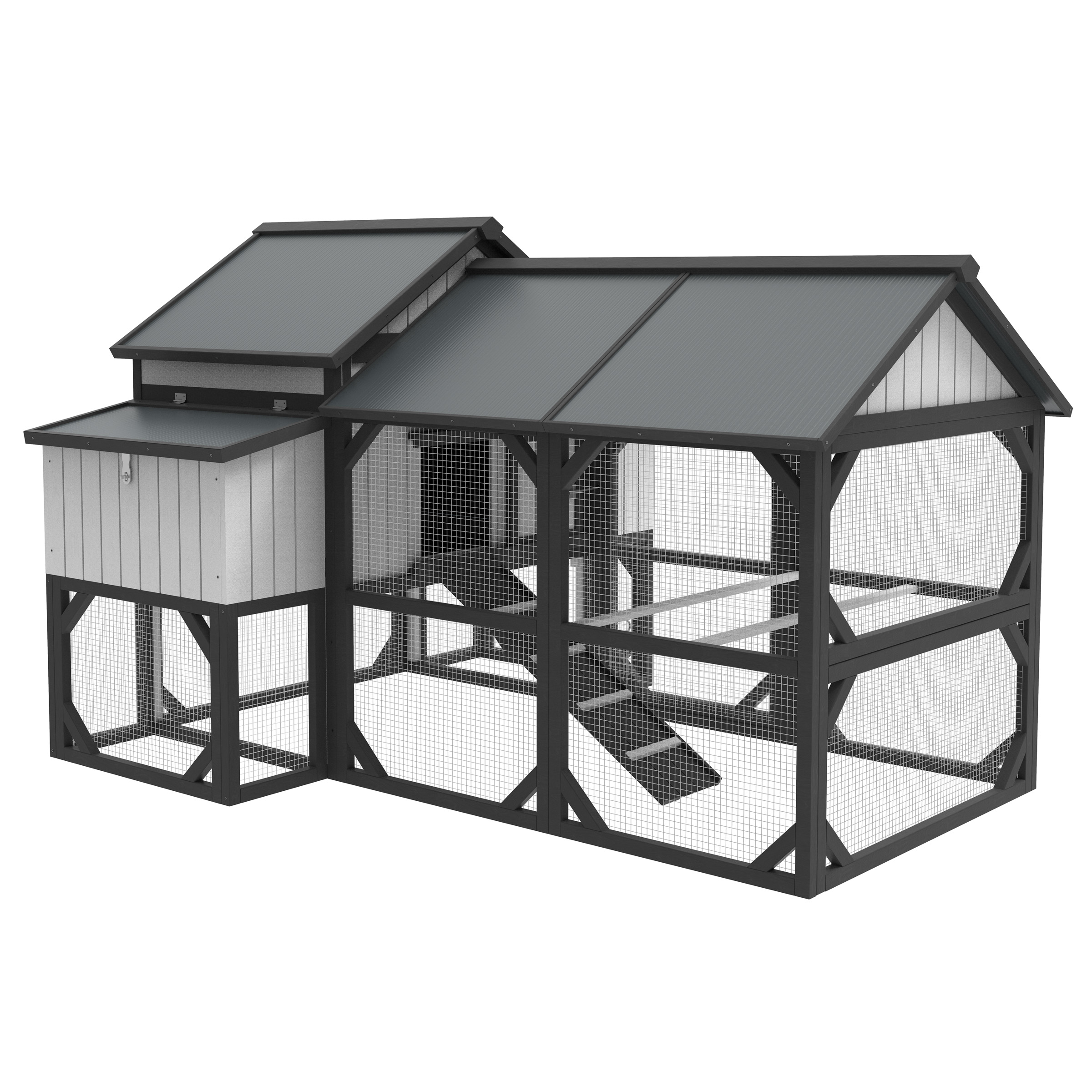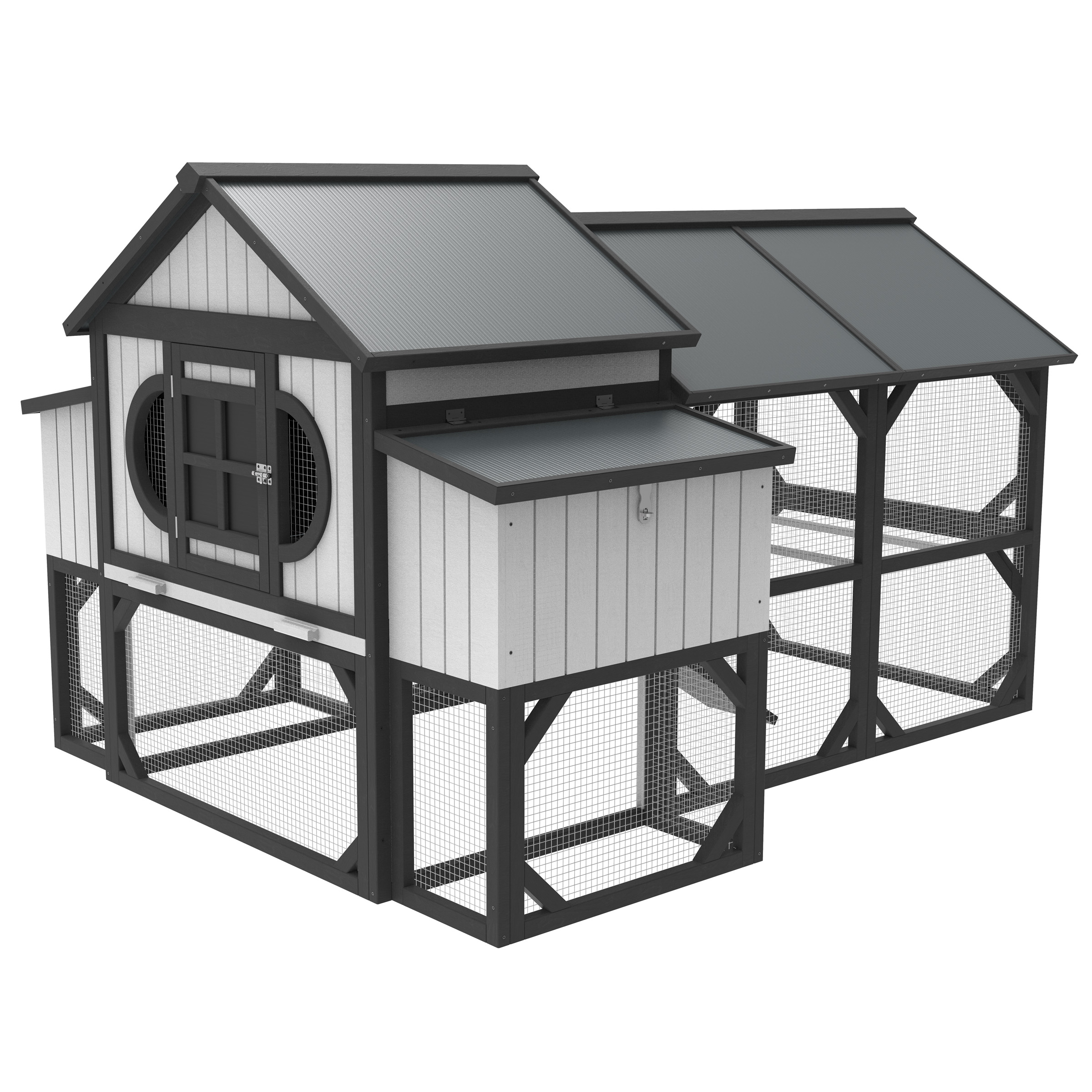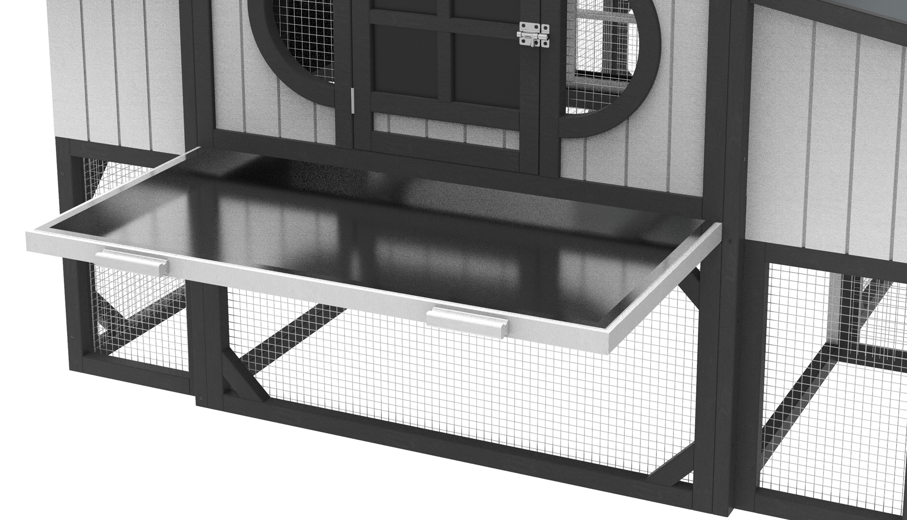 The Chicken Carriage House is a stylish coop that makes egg collection easy and fun. The large covered pen area creates a "free range" environment. Slide-out pull pan and front access door included. Multiple roosting and nesting spots available.