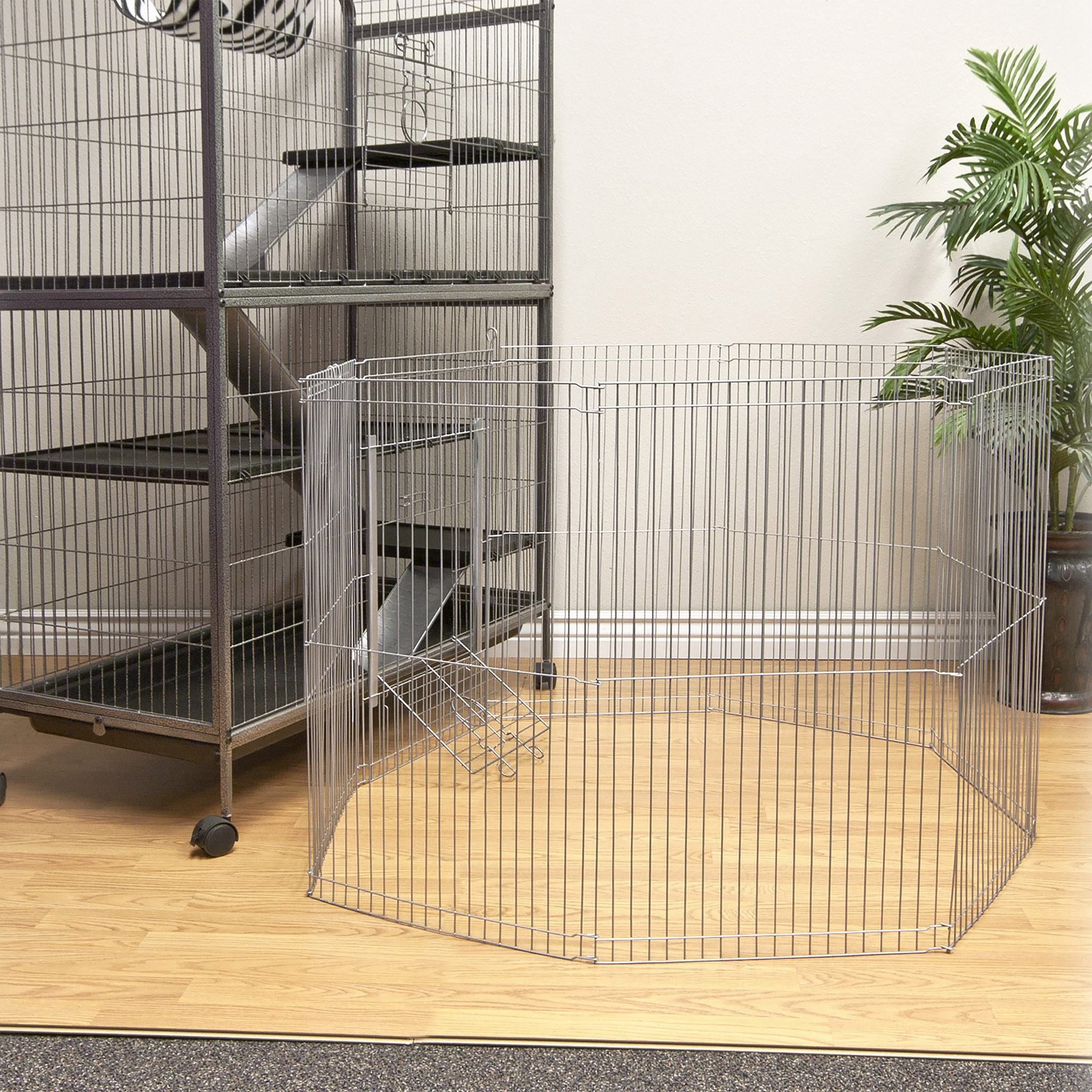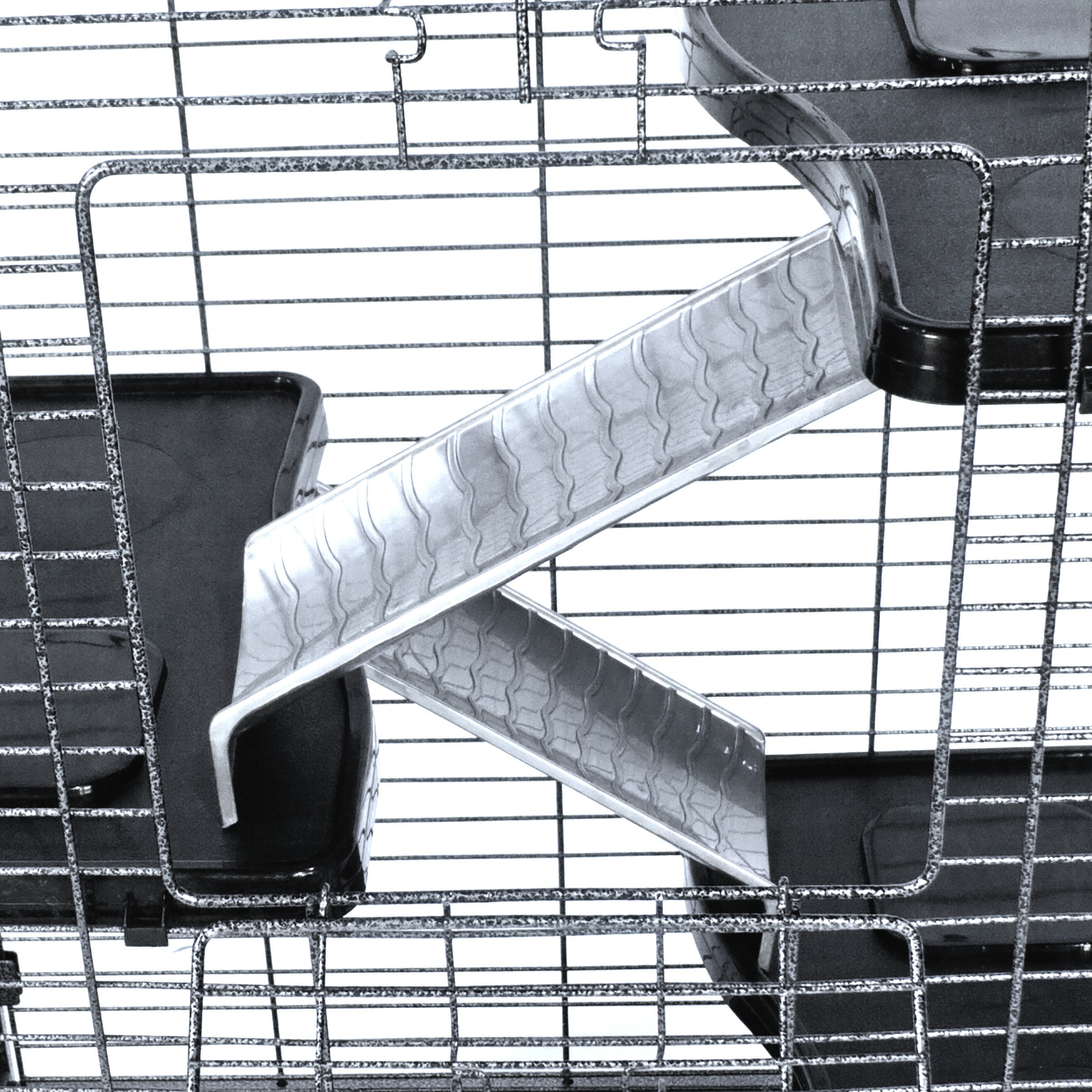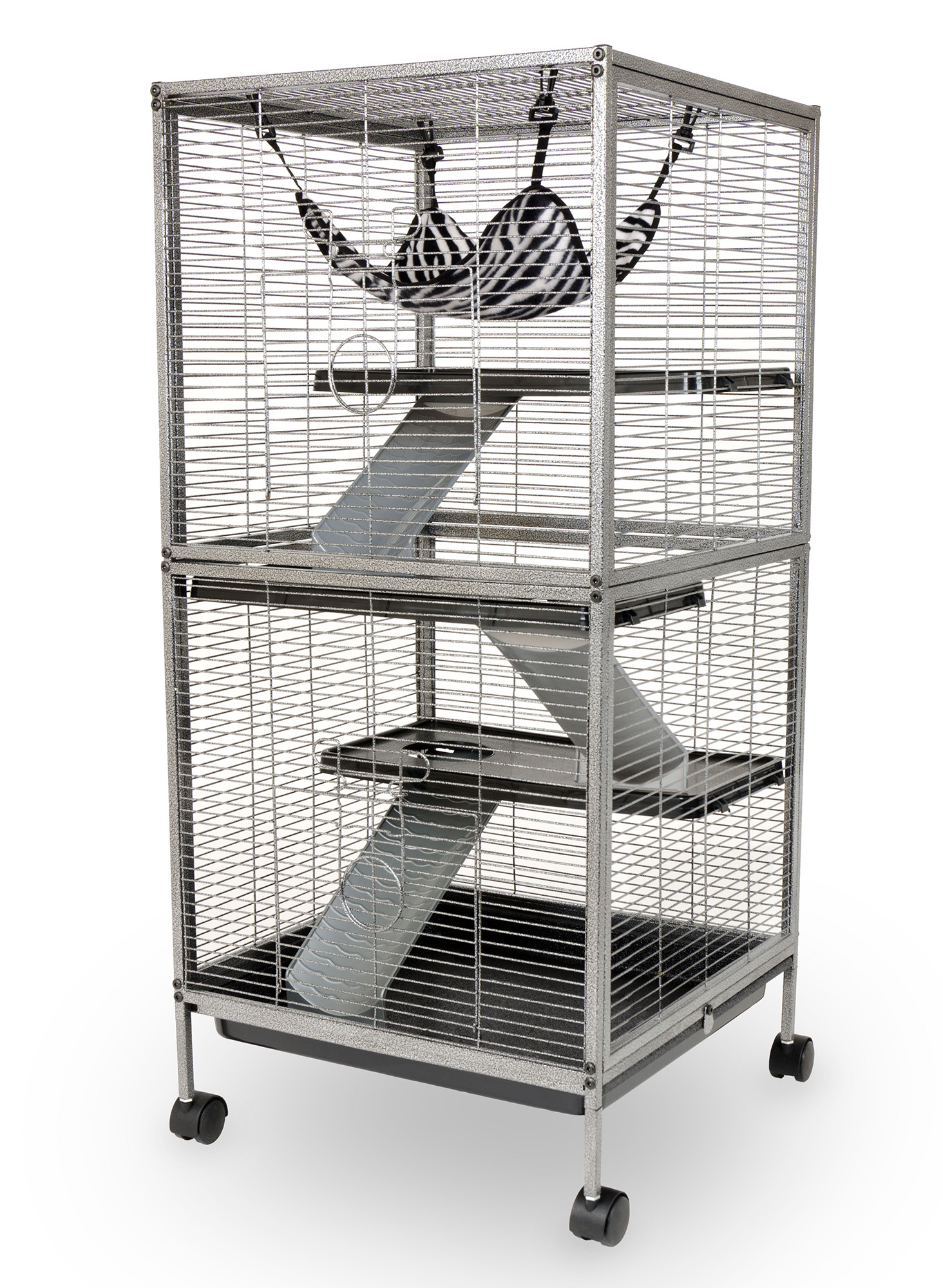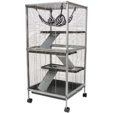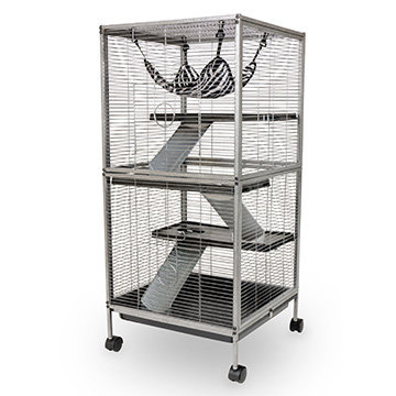 Living Room Series Critter Home offers the ultimate in pet comfort, complete safety and convenient cleaning. Strong square tube construction is easy to assemble and clean and a full size pull pan makes care simple. Includes shelves, ramps, bowl, hammock and more.