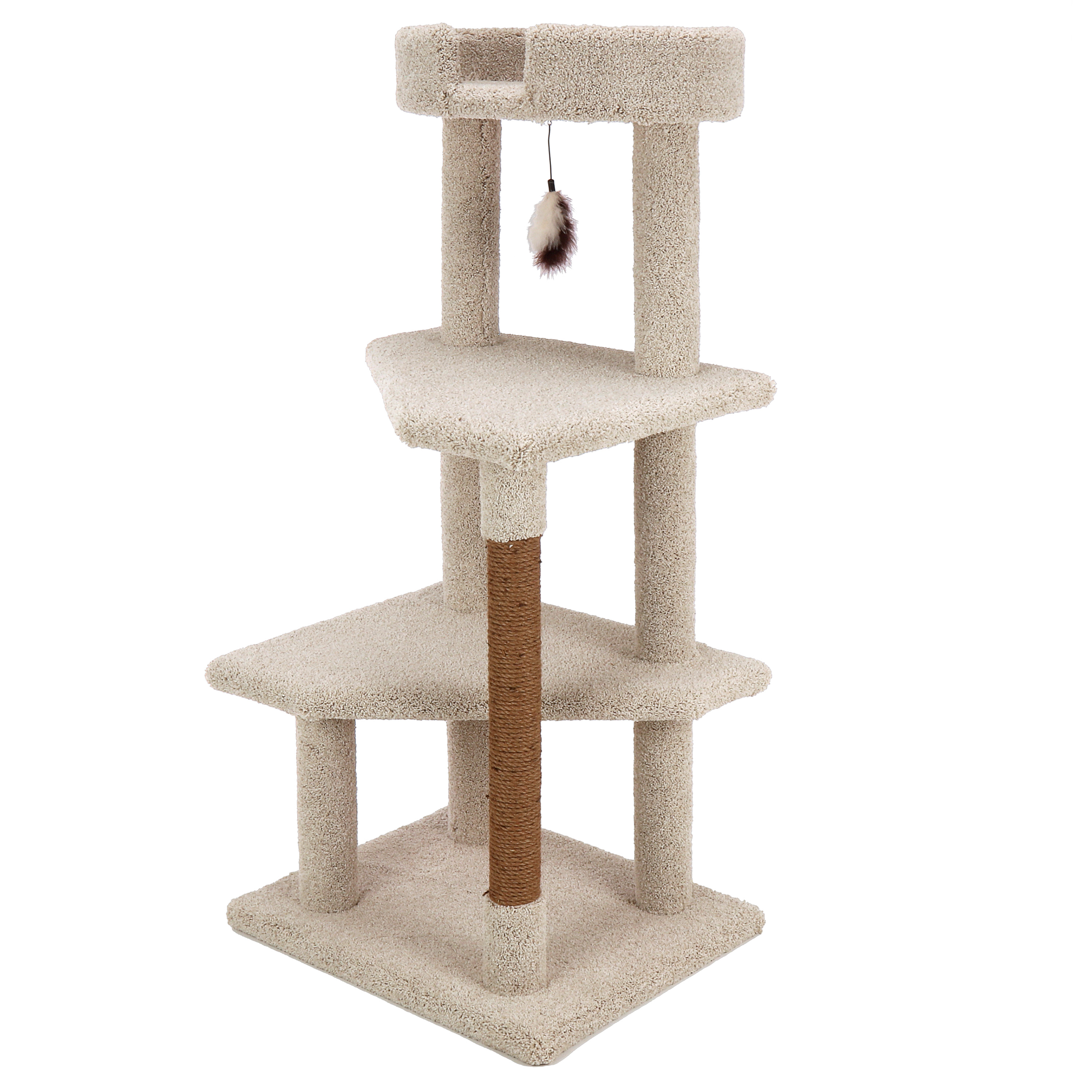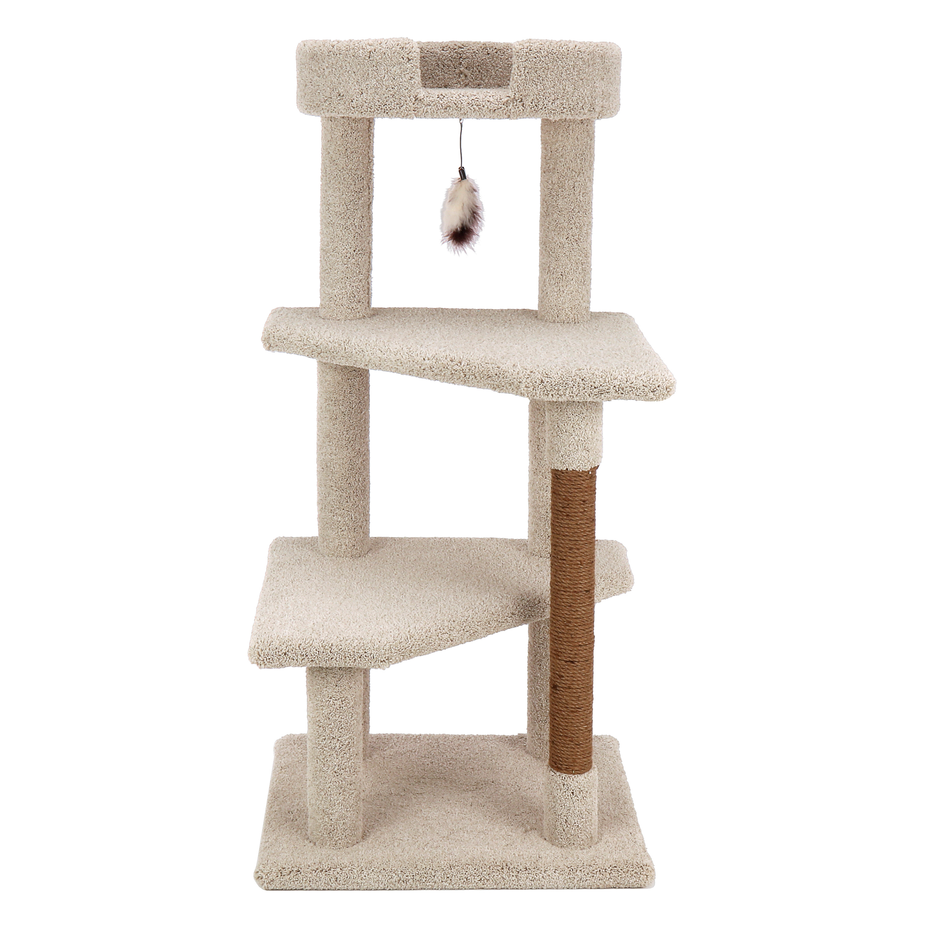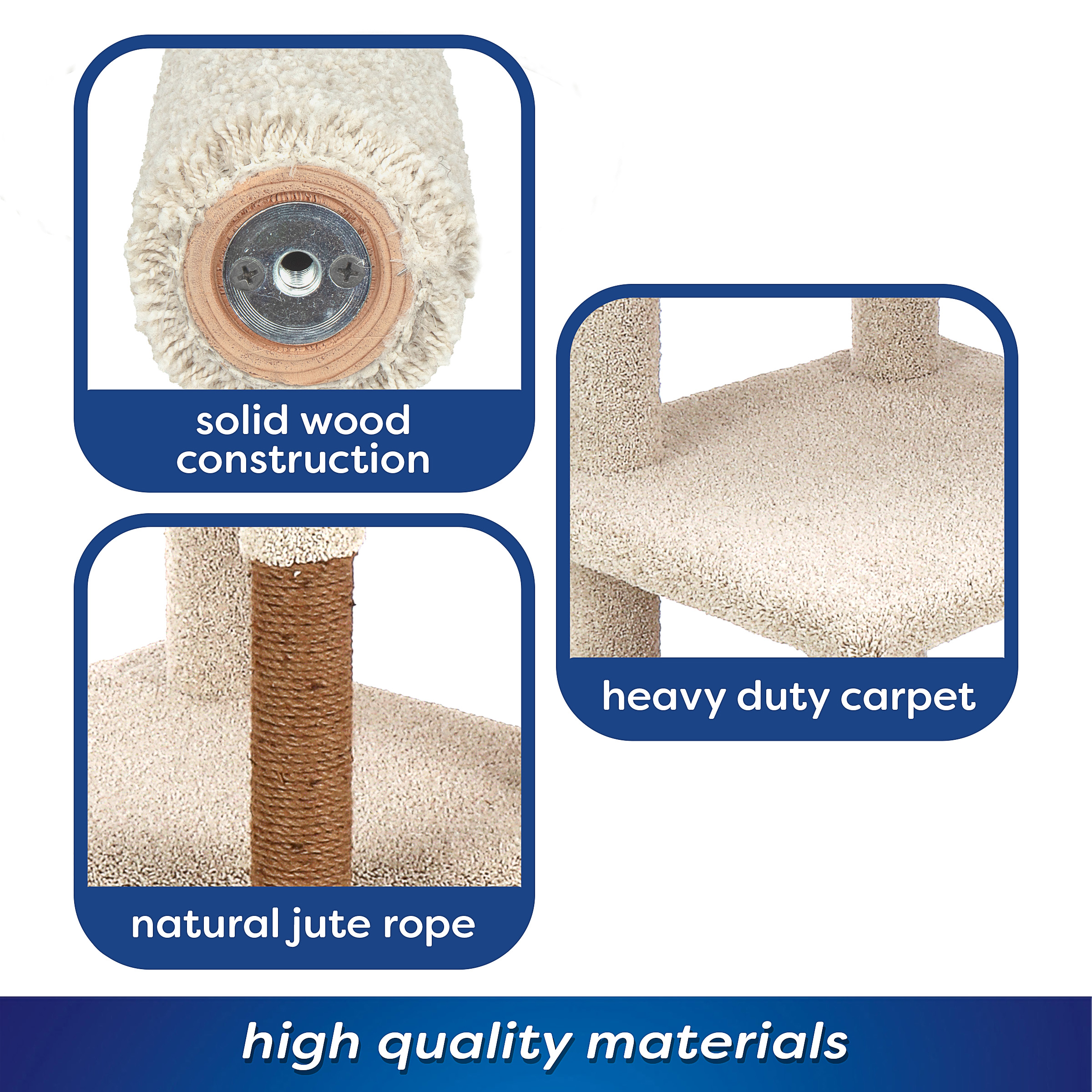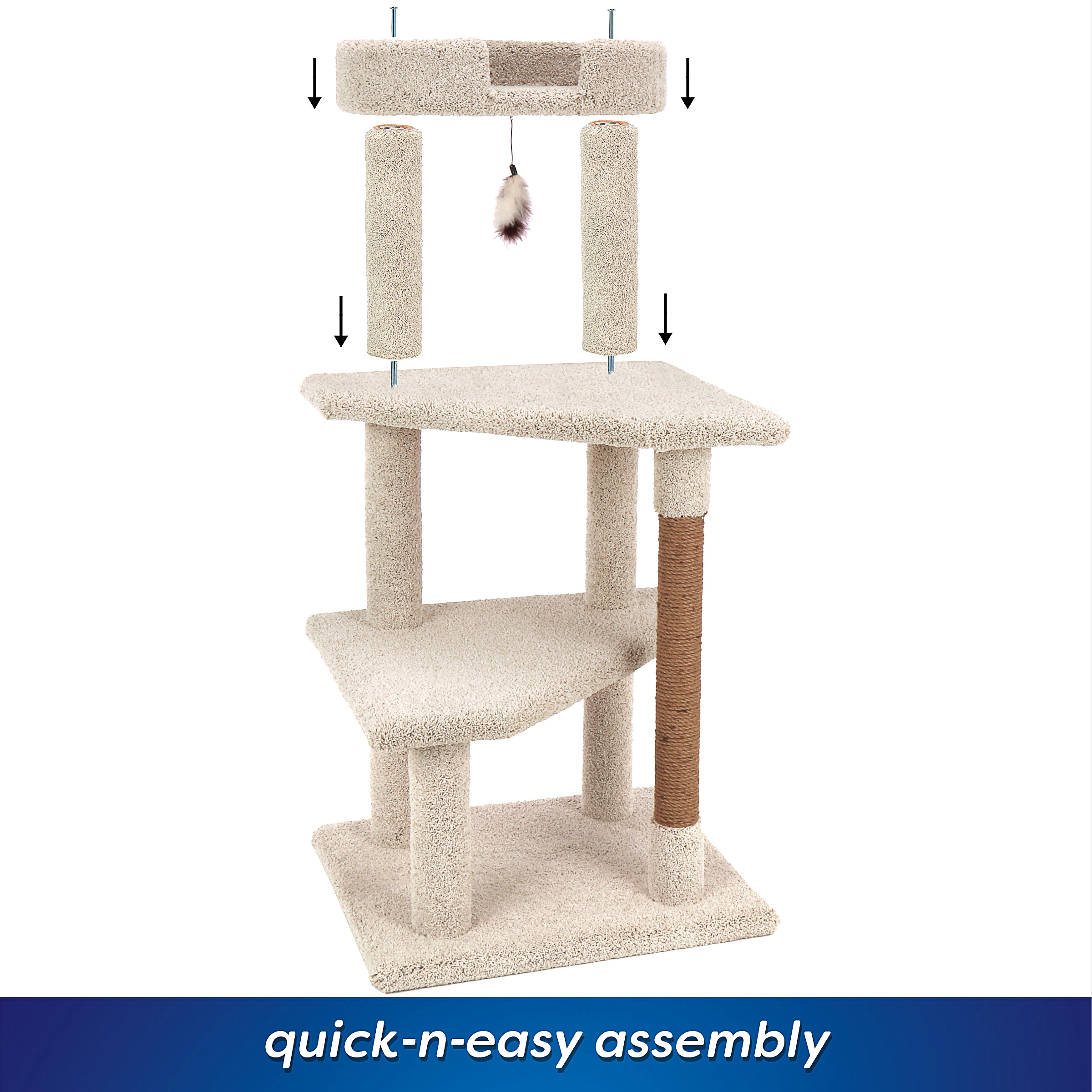 The Kitty-Quick 49" Cat Tower is perfect for multiple cats to lounge and play. It features large platforms for bigger kitties and a stair-step design for easy access to the top. Handcrafted in the USA with solid wood and household grade carpet. It also has a large jute rope post to encourage positive scratching behavior. Combines ready-to-assemble shipping with pre-built quality for the best of both worlds!