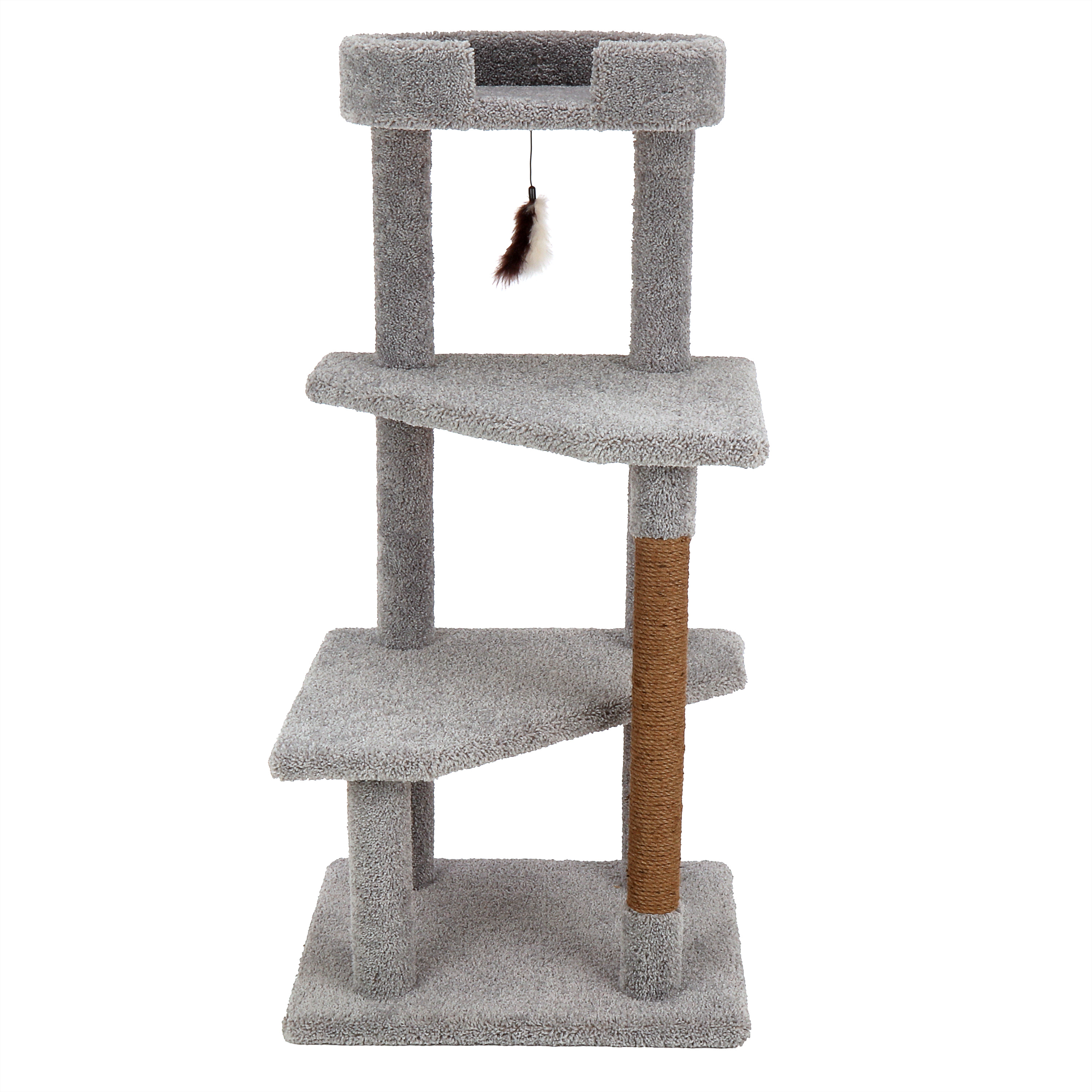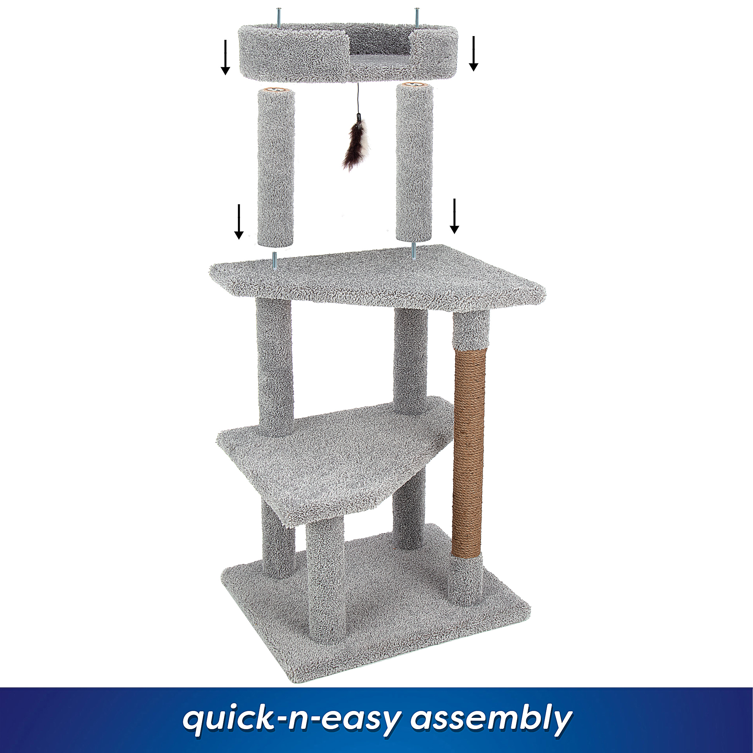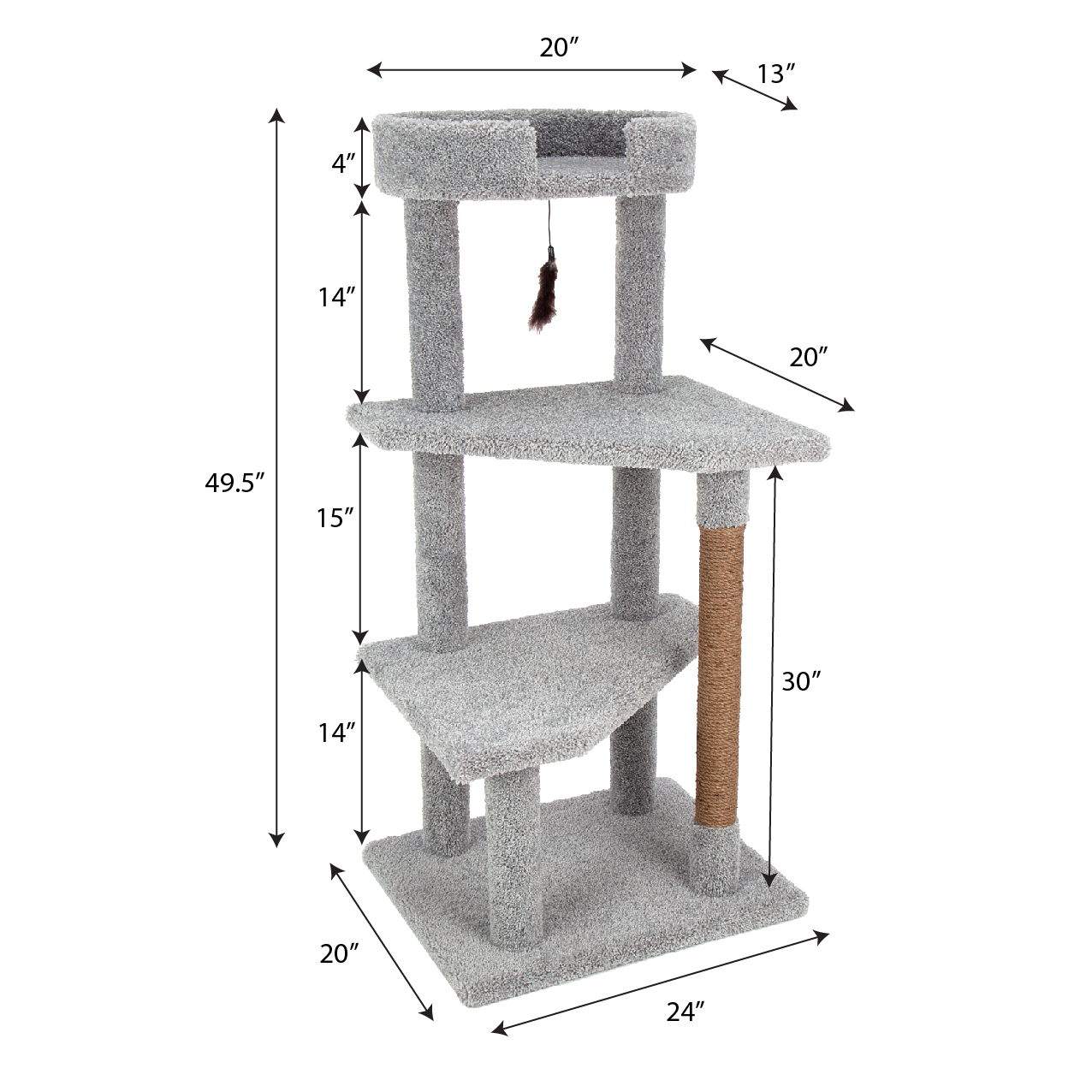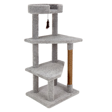 The Kitty-Quick 49" Cat Tower is perfect for multiple cats to lounge and play. It features large platforms for bigger kitties and a stair-step design for easy access to the top. Handcrafted in the USA with solid wood and household grade carpet. It also has a large jute rope post to encourage positive scratching behavior. Combines ready-to-assemble shipping with pre-built quality for the best of both worlds!