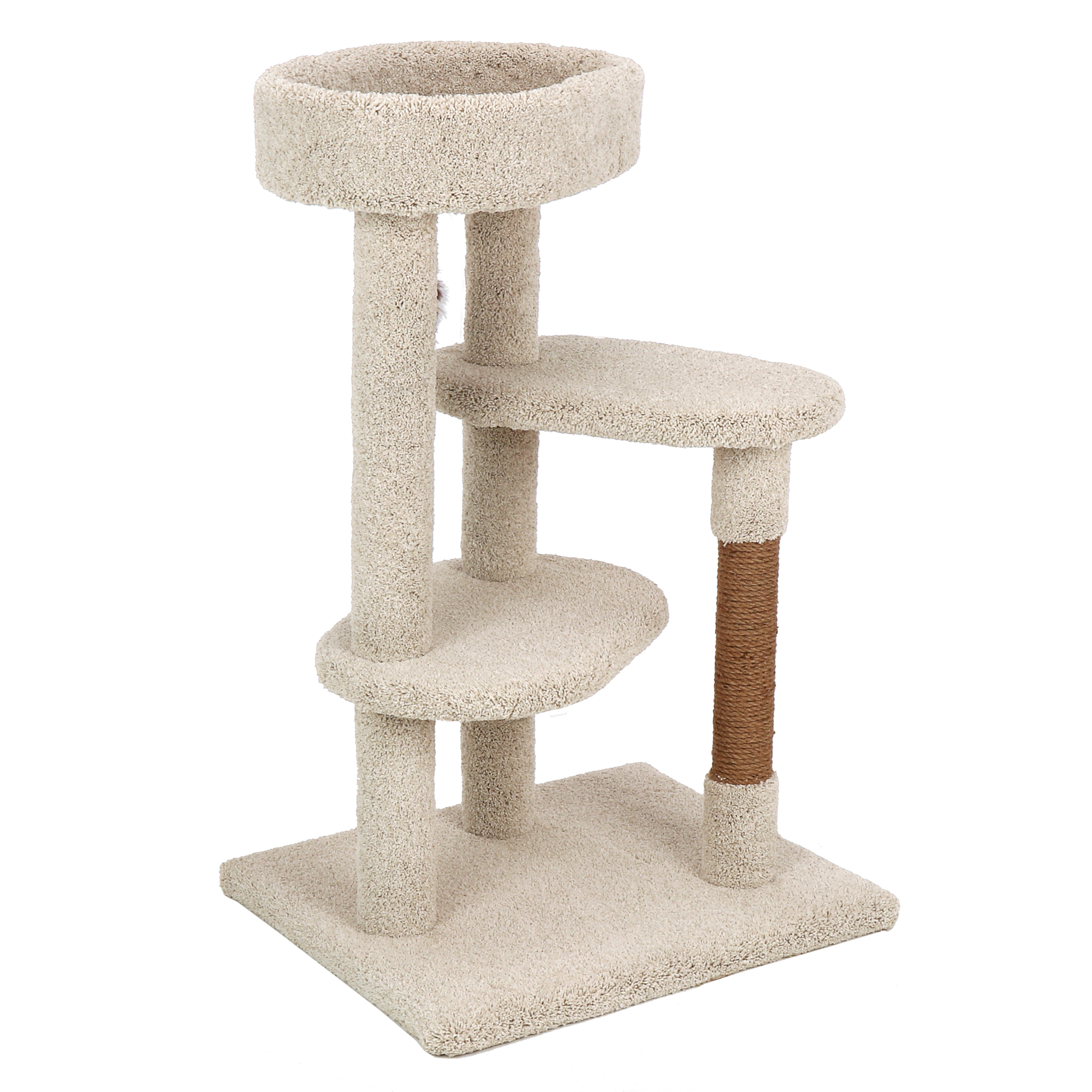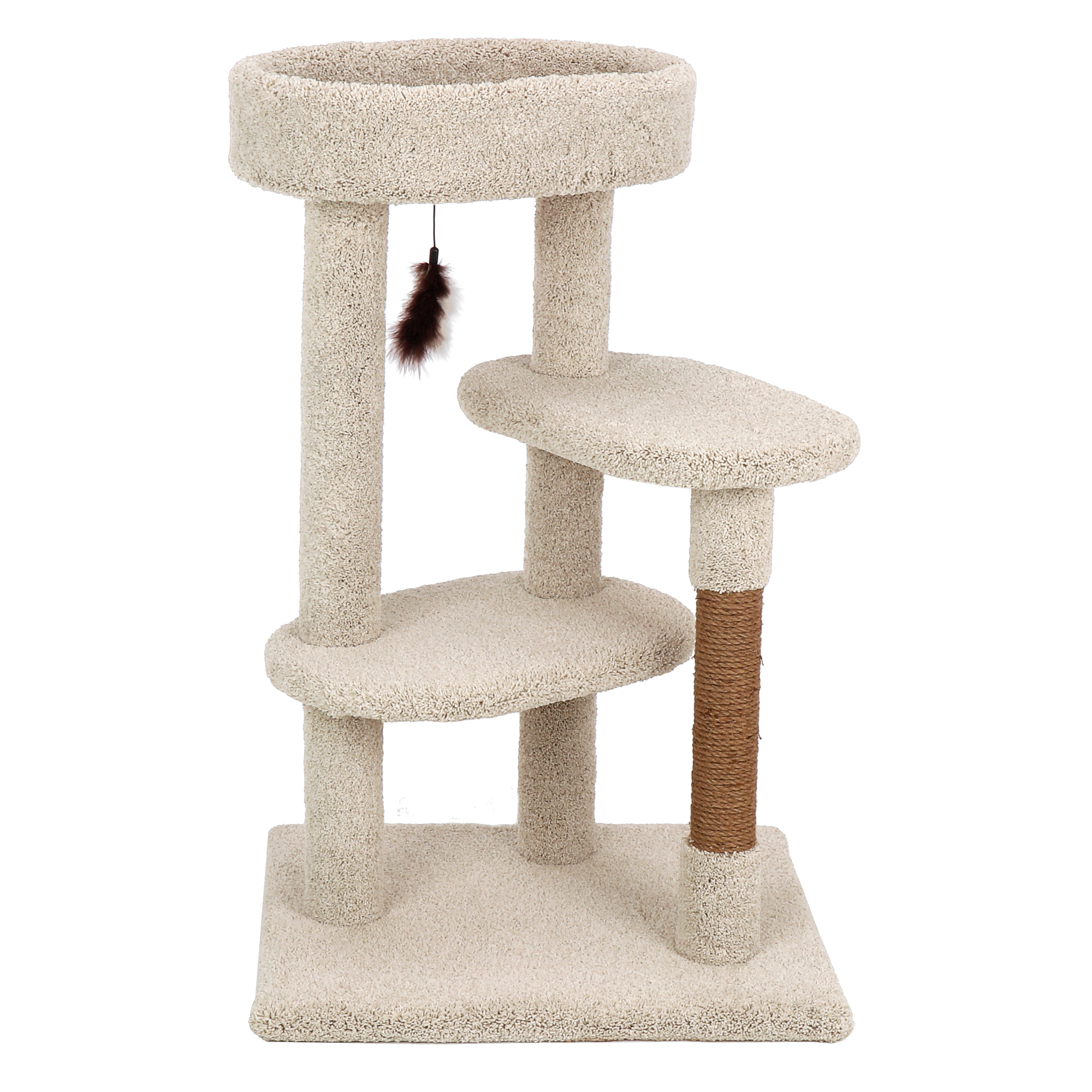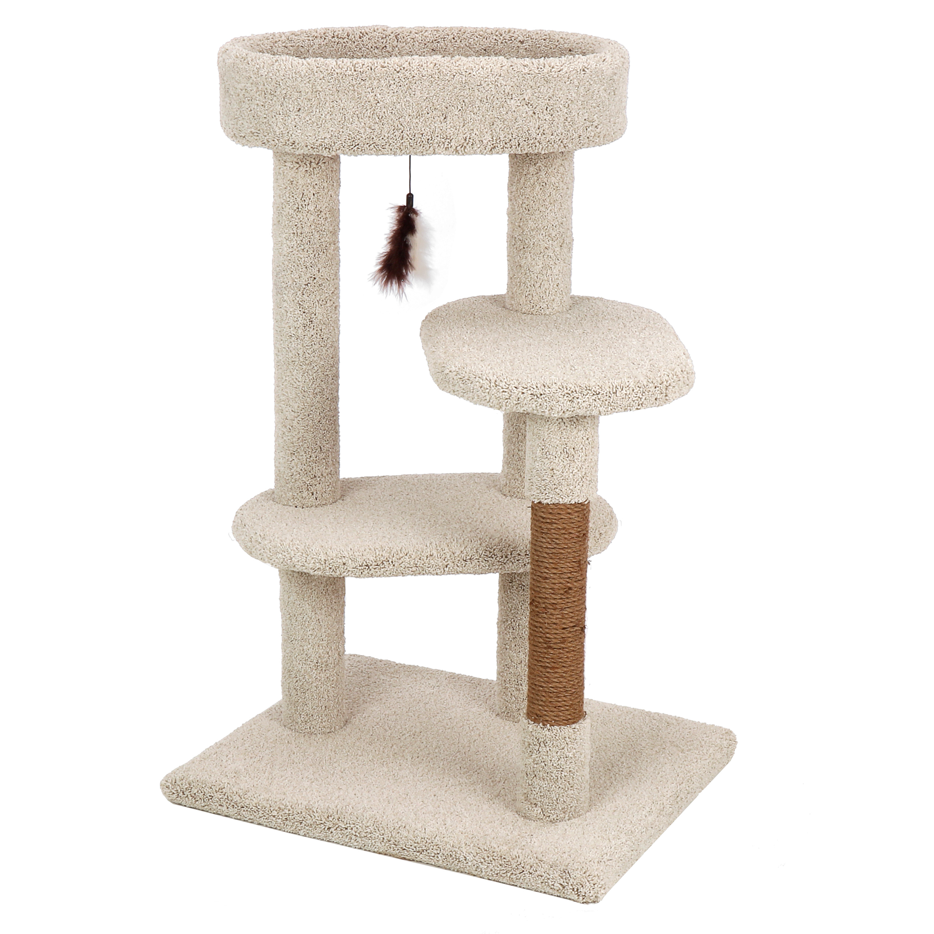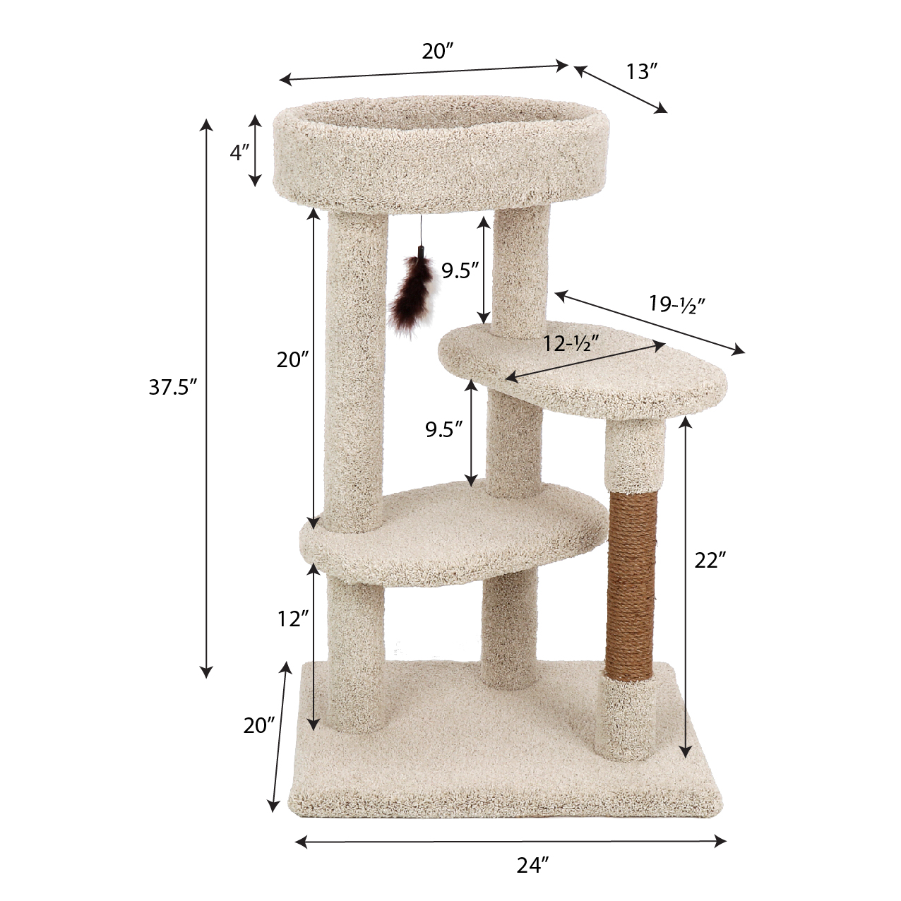 A 36" tall cat tree built with a stair-step design for cats young and old to climb. A cozy cuddler sits on top and provides a comfy lounging area with a view. Handcrafted in the USA with solid wood and household carpet. Combines ready-to-assemble shipping with pre-built quality for the best of both worlds!