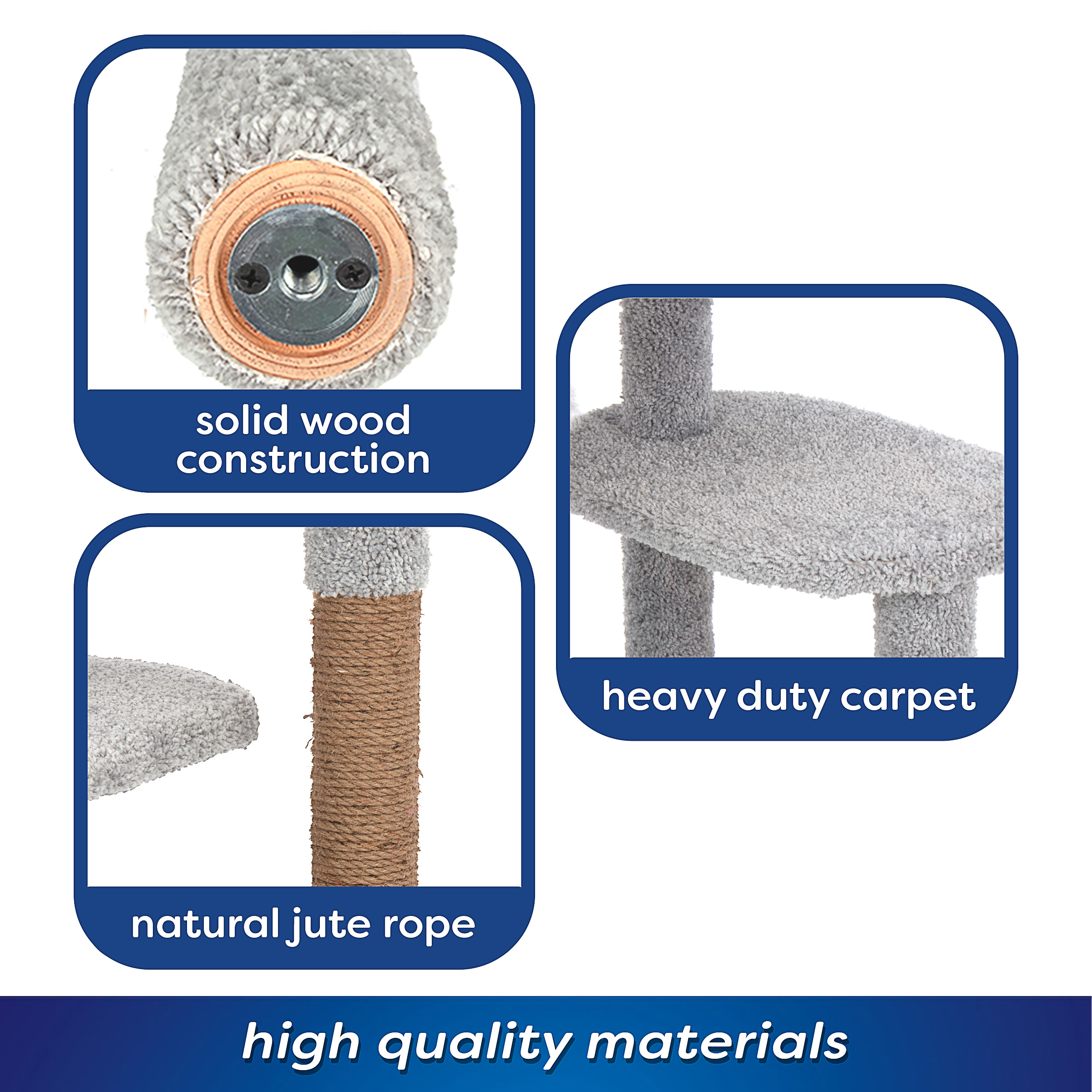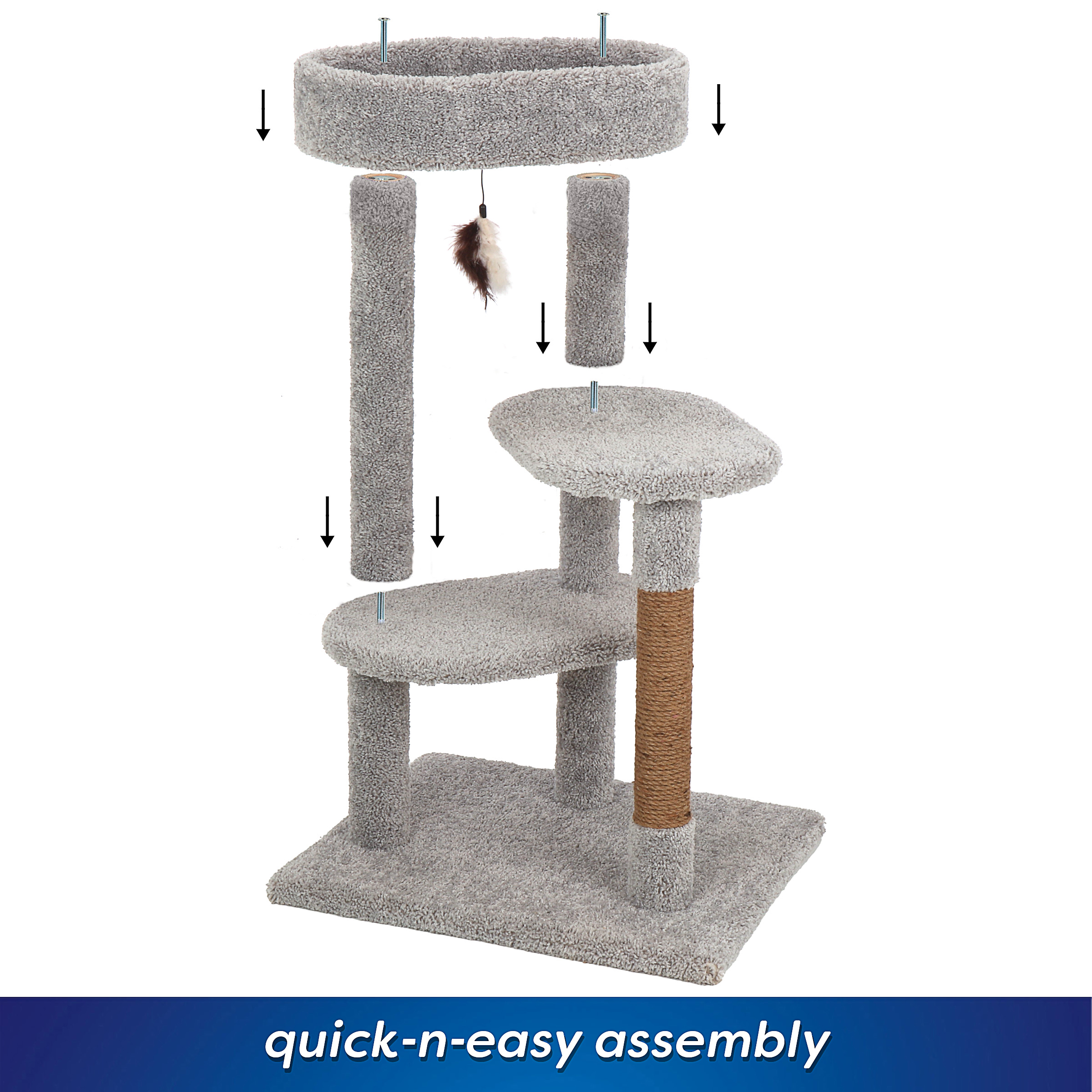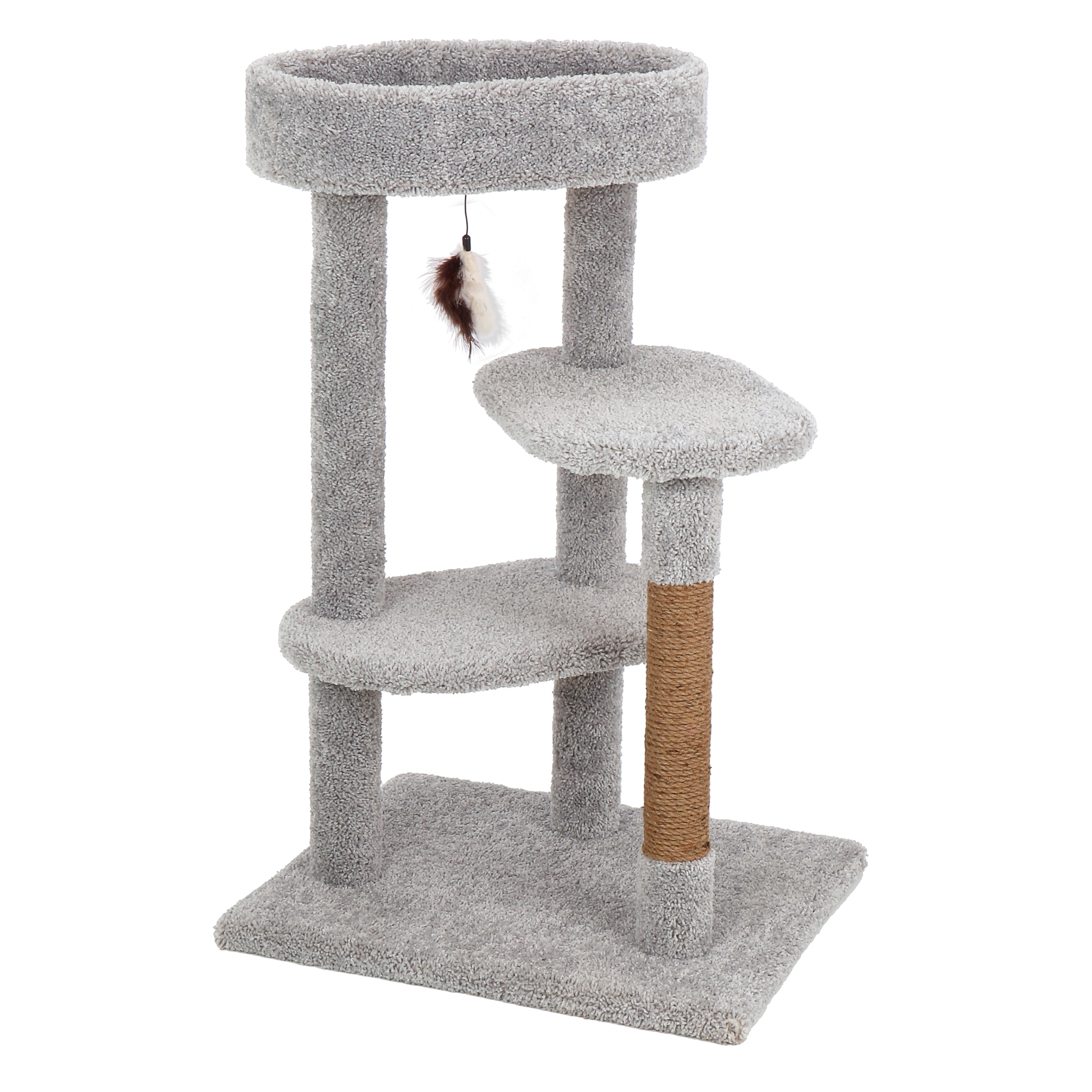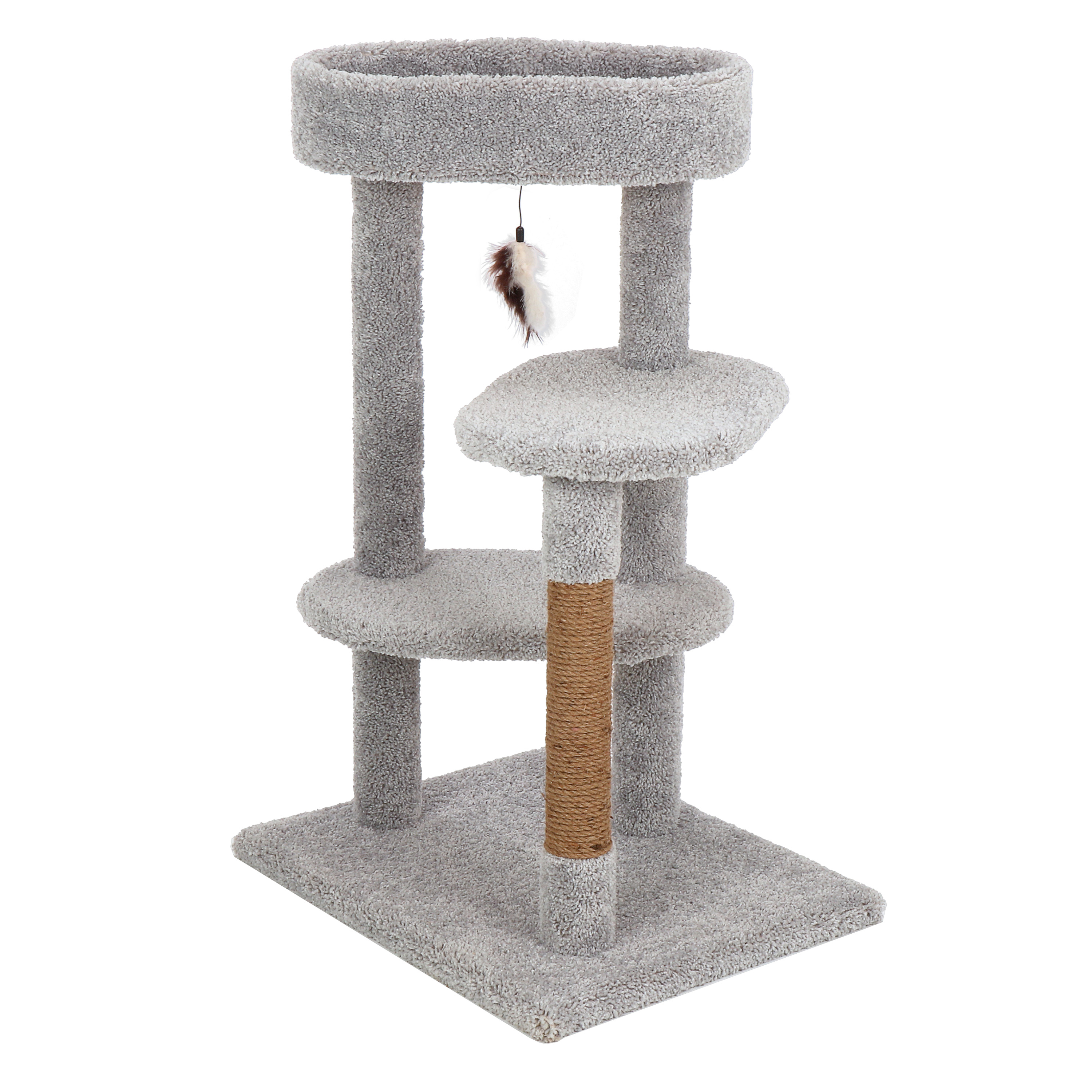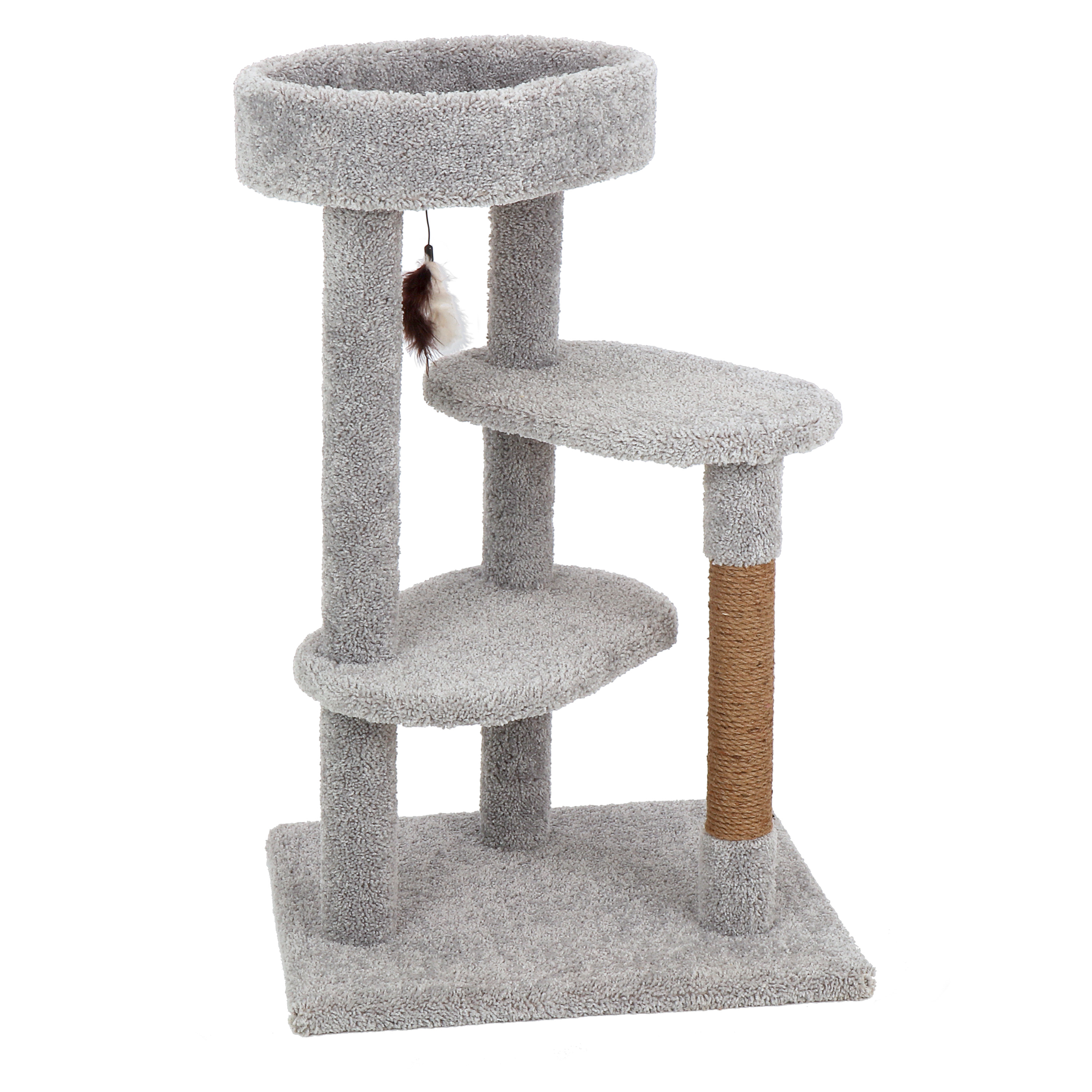 A 36" tall cat tree built with a stair-step design for cats yound and old to climb. A cozy cuddler sits on top and provides and comfy lounging area with a view. Handcrafted in the USA with solid wood and household carpet. Combines ready-to-assemble shipping with pre-built quality for the best of both worlds!