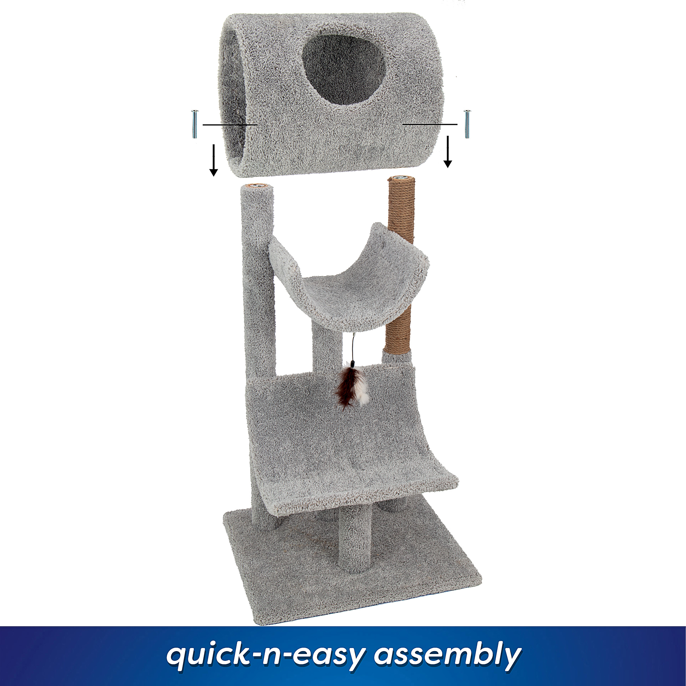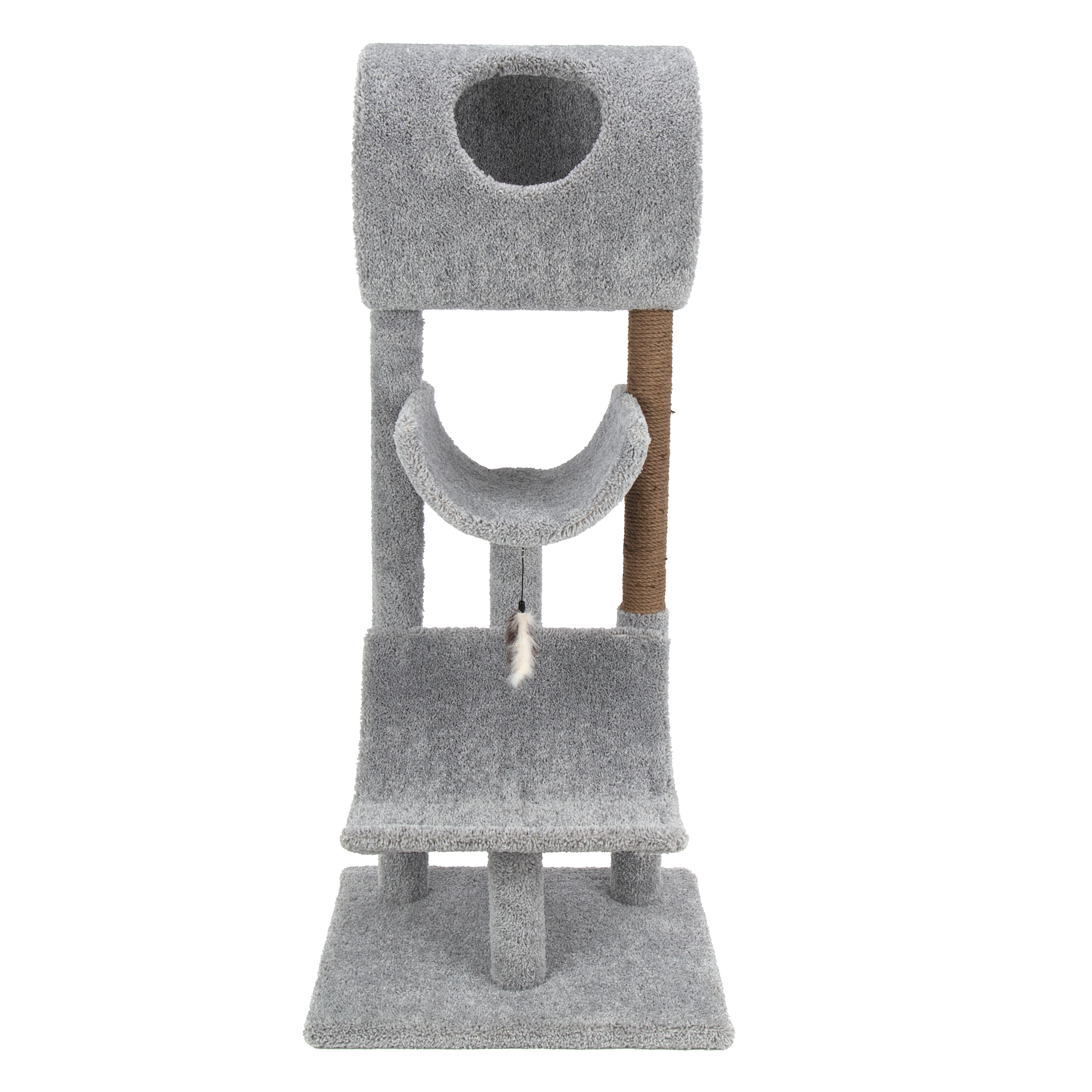 The Kitty-Quick 54" Lounger offers 3 spacious levels of lounging with easy access to the penthouse that sits on top. Great for multiple penthouse that sits on top. Great for multiple cats to relax and enjoy. Handcrafted in the USA with solid wood and household grade carpet. Combines ready-to-assemble shipping with pre-built quality for the best of both worlds!