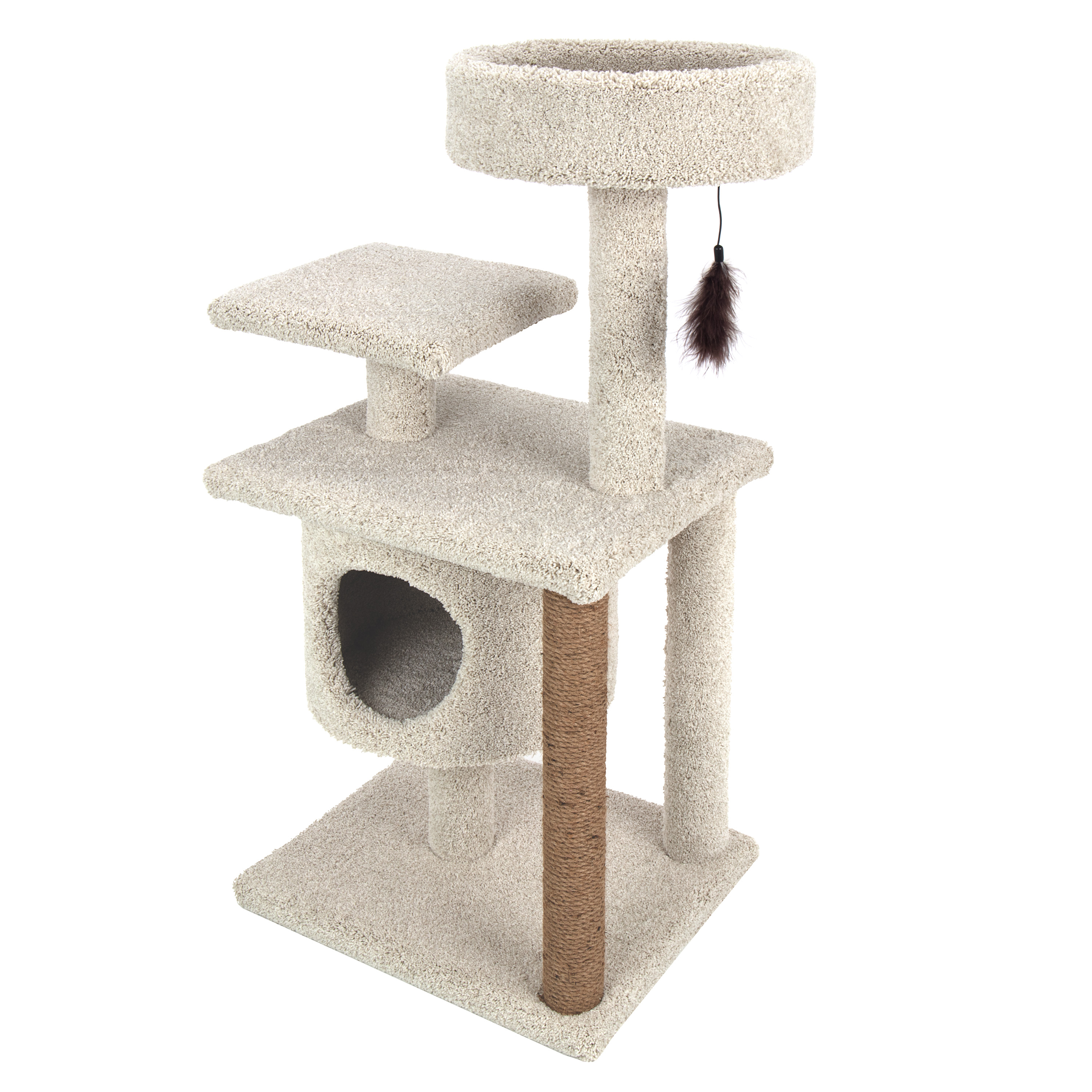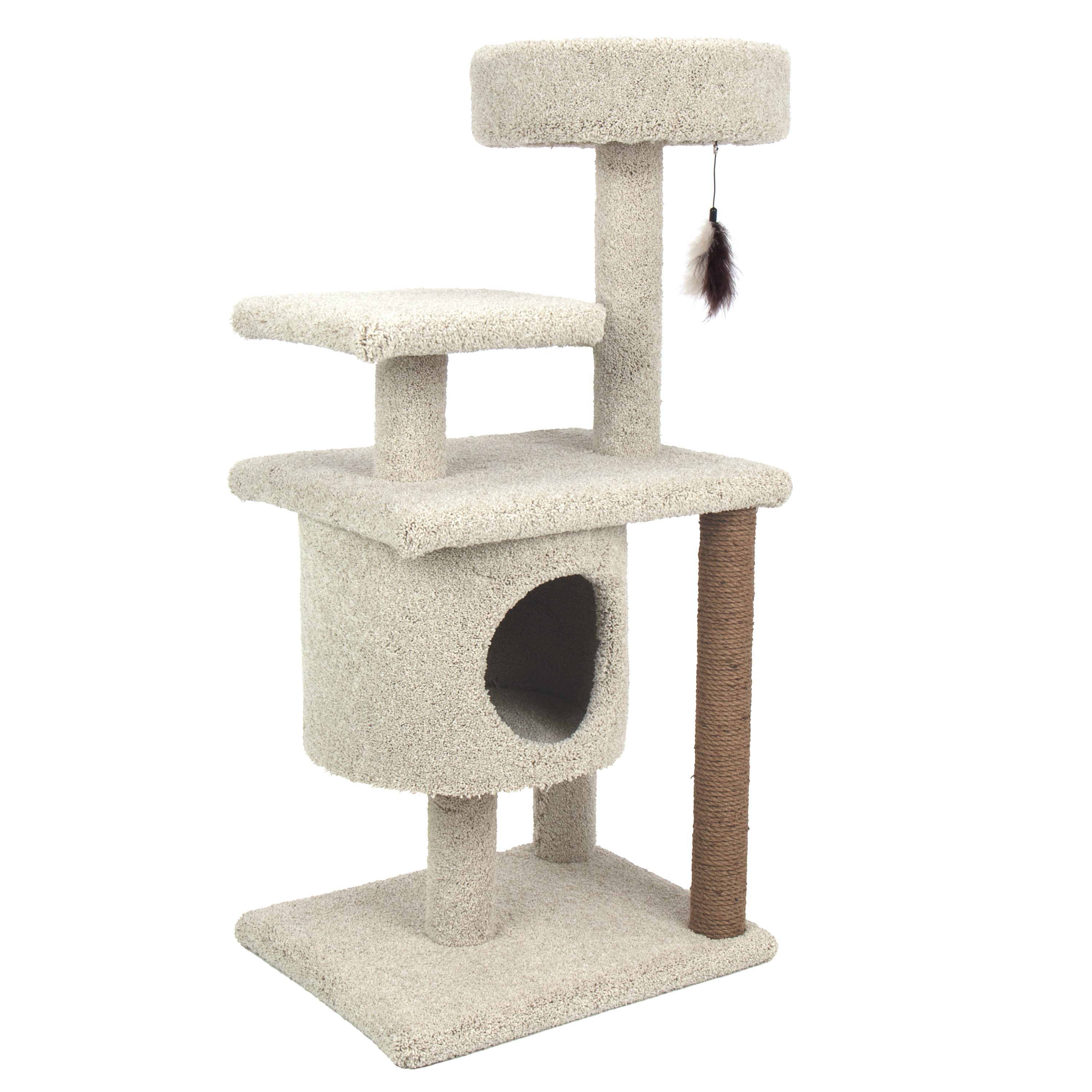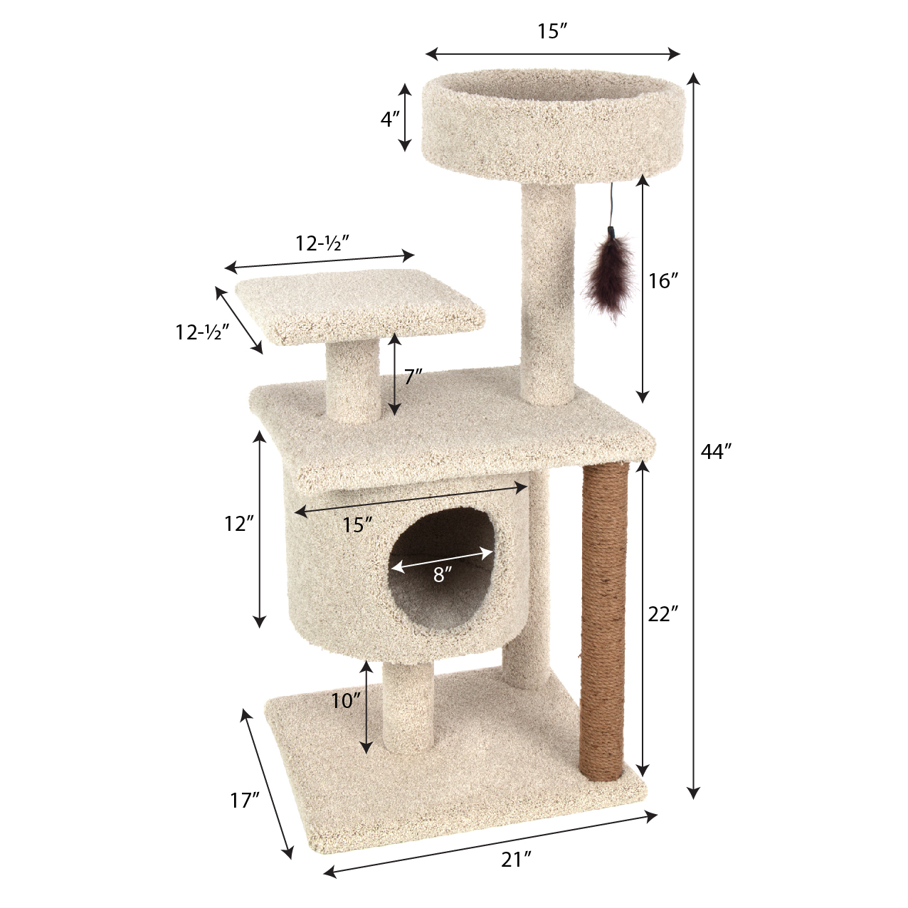 A versatile 44" Cat Tree with easy access to perch and cozy condo. Special step helps aid older cats to climb to the top perch. The condo offers a secure and secluded place for kitty to hangout and relax. Comes with a long jute wrapped post to encourage positive scratching behavior. Handcrafted in the USA with solid wood and household grade carpet. Combines ready-to-assemble shipping with pre-built quality for the best of both worlds!