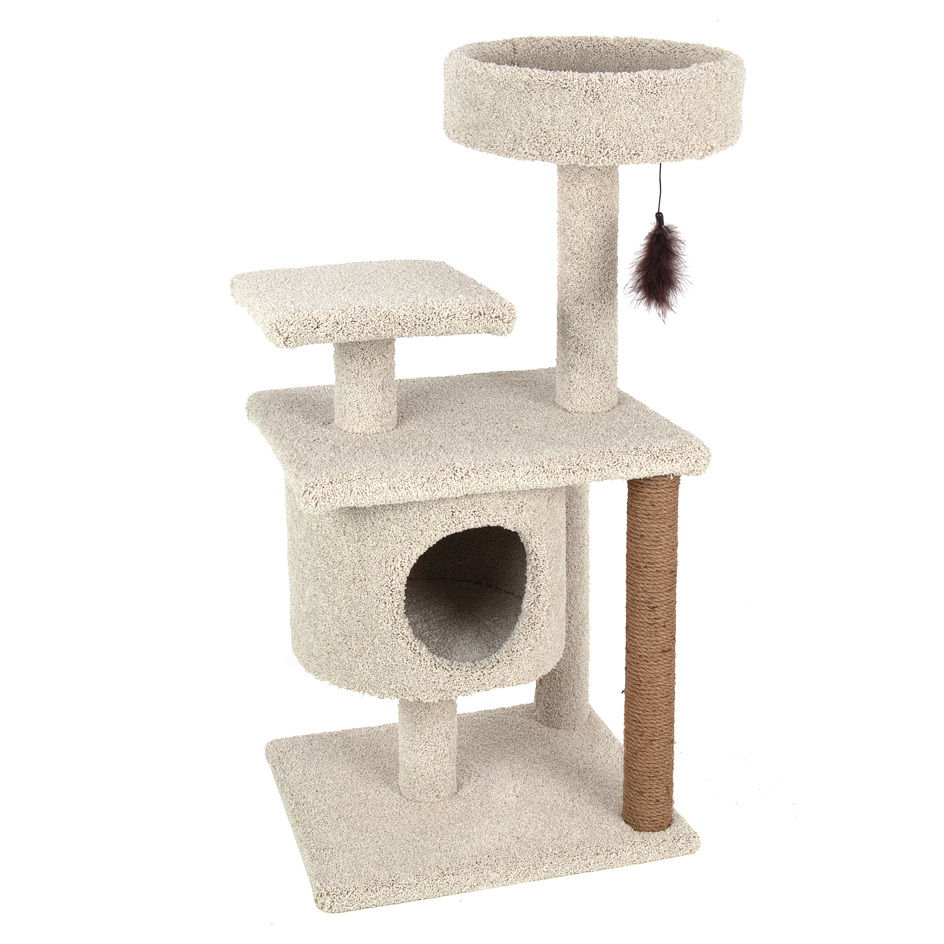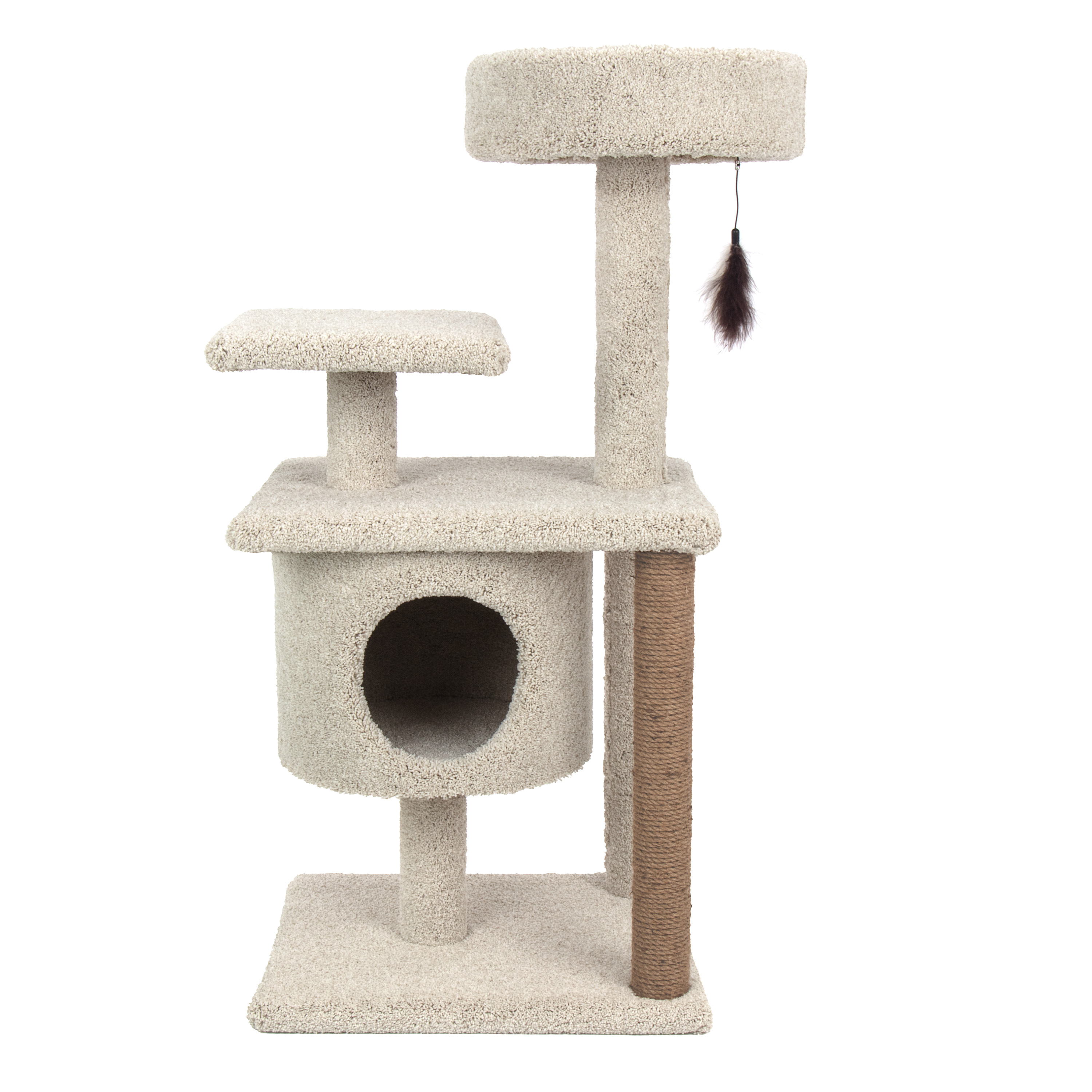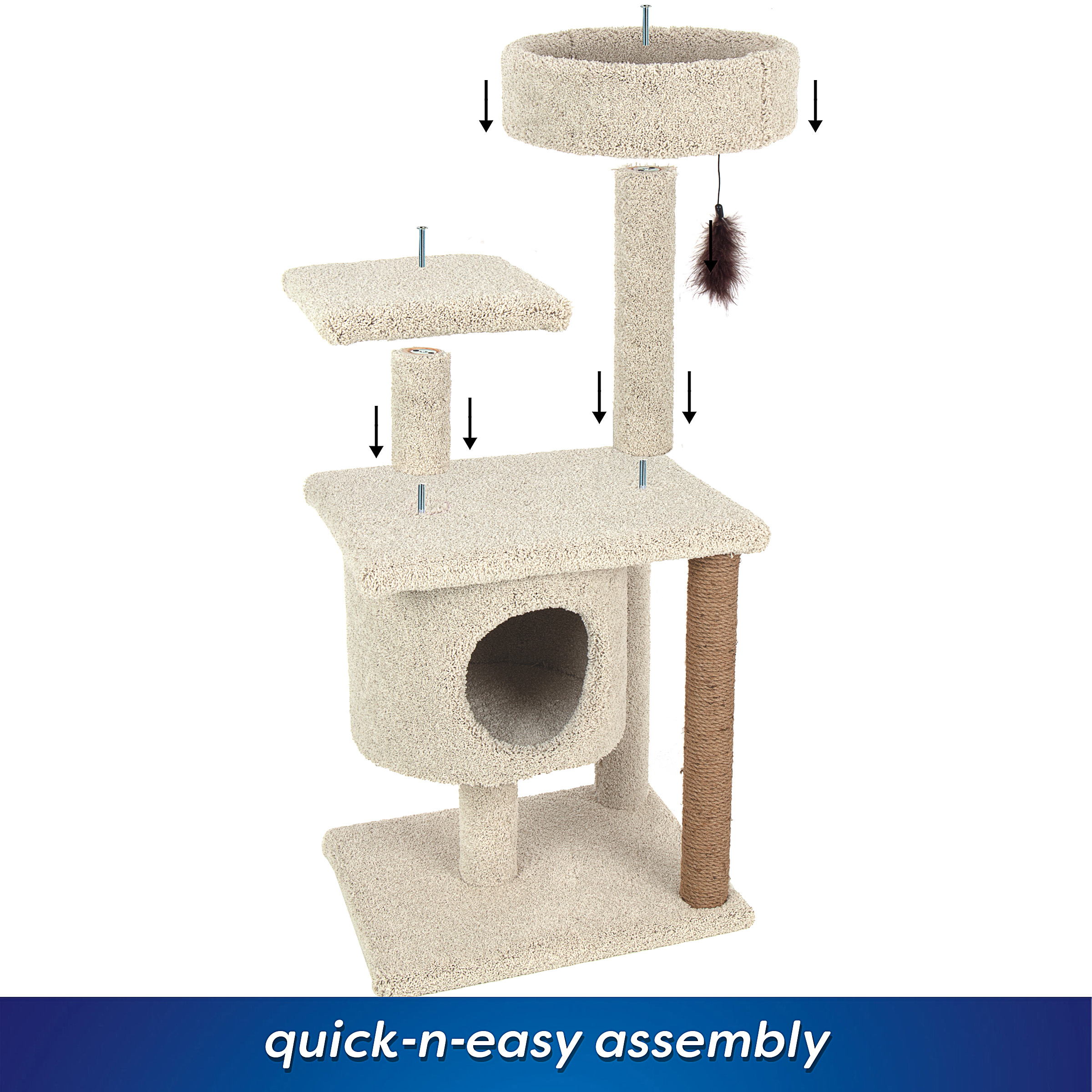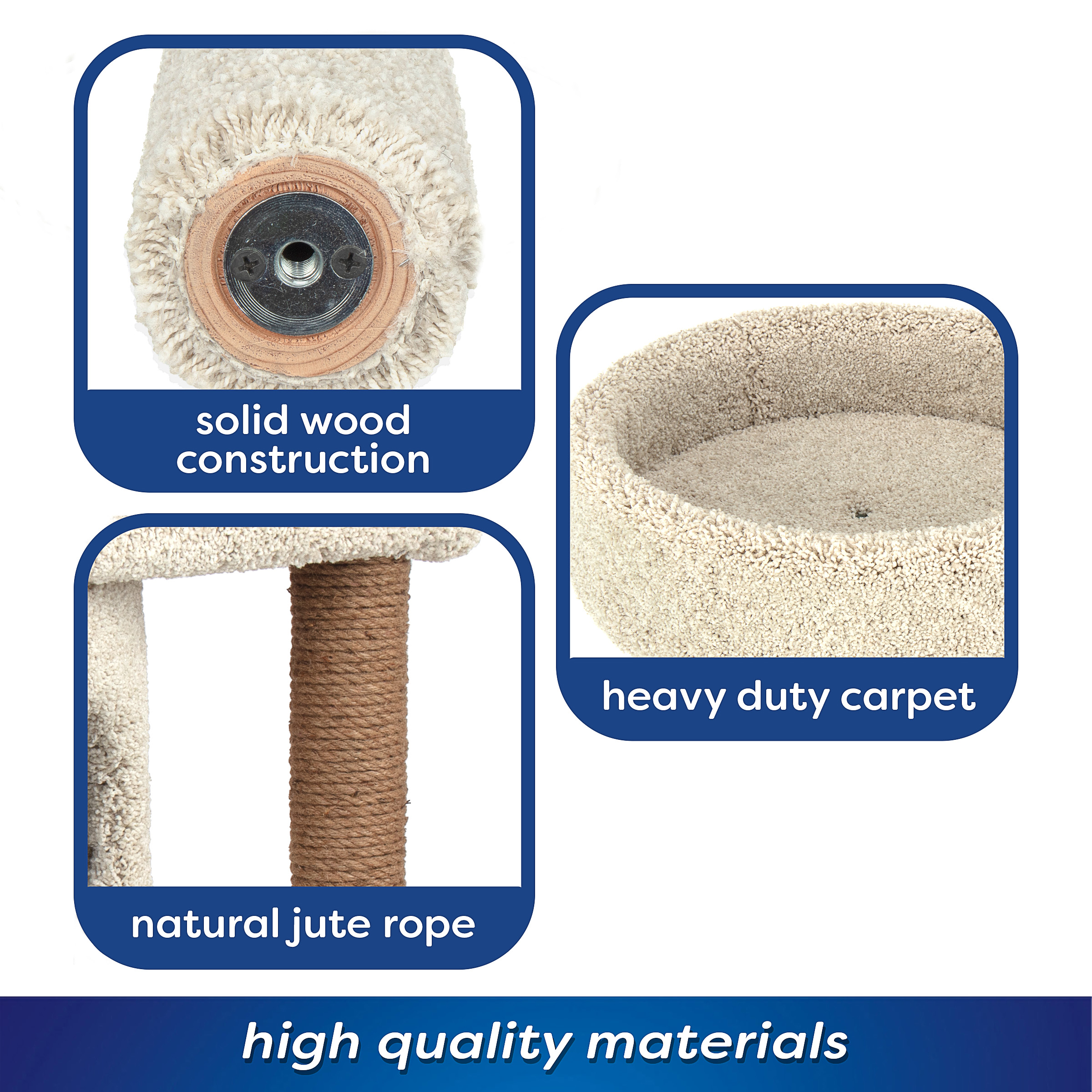 A versatile 44" Cat Tree with easy access to perch and cozy condo. Special step helps aid older cats to climb to the top perch. The condo offers a secure and secluded place for kitty to hangout and relax. Comes with a long jute wrapped post to encourage positive scratching behavior. Handcrafted in the USA with solid wood and household grade carpet. Combines ready-to-assemble shipping with pre-built quality for the best of both worlds!