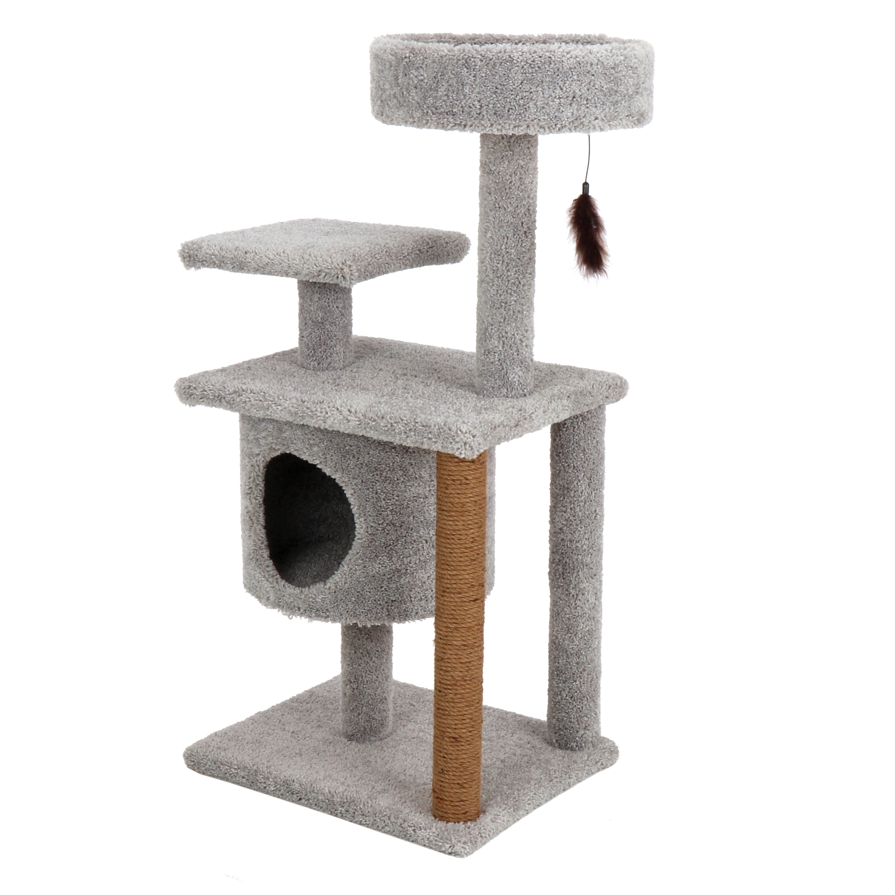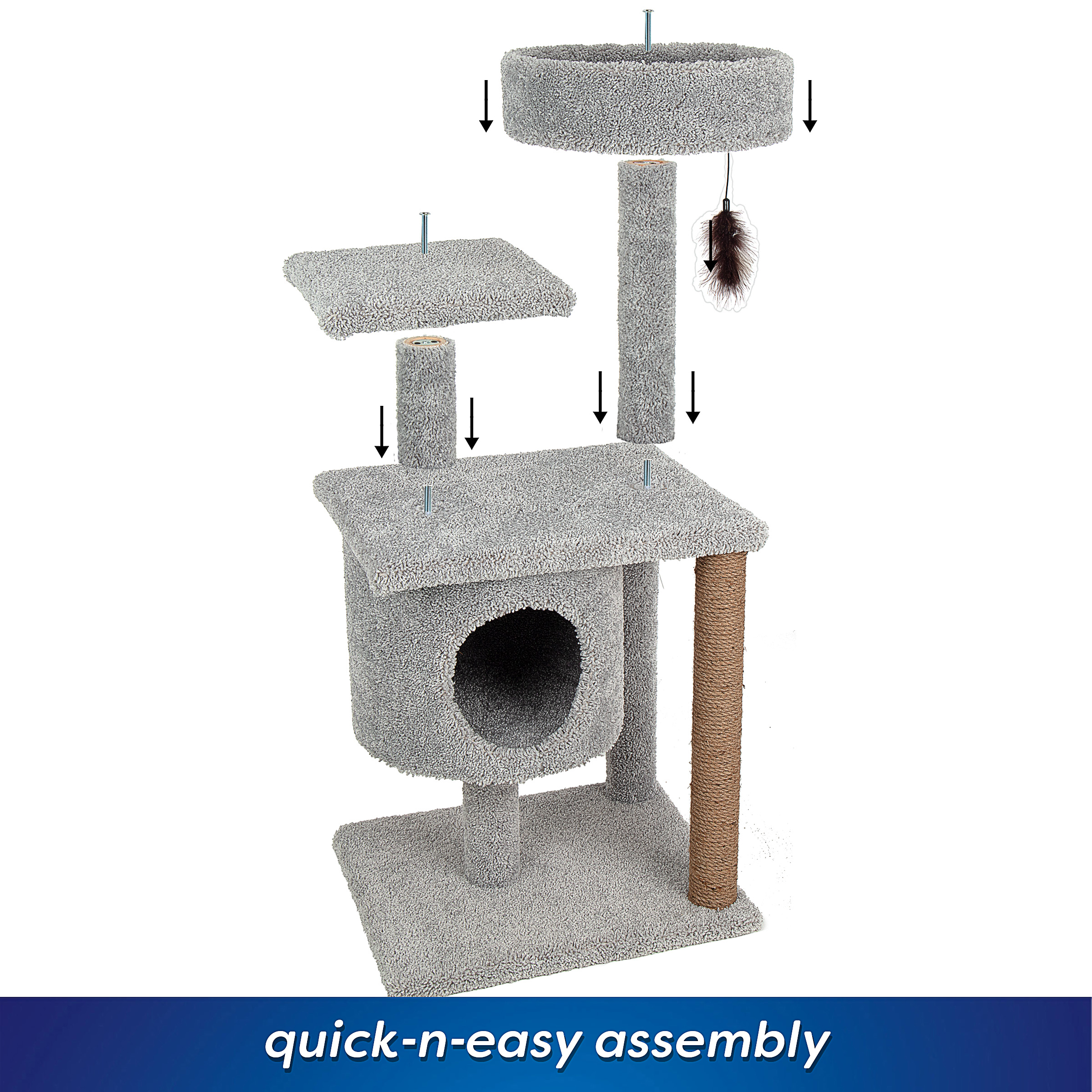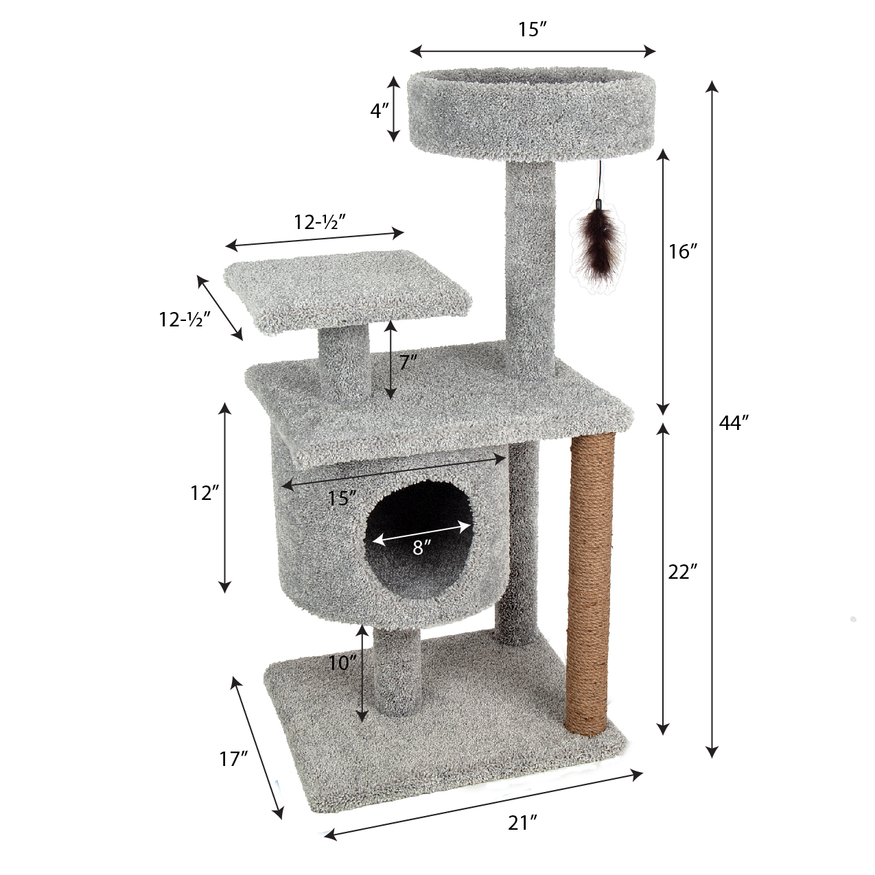 A versatile 44" Cat Tree with easy access to perch and cozy condo. Special step help aid older cats to climb to the top perch. The condo offers a secure and secluded place for kitty to hangout and relax. Comes with a long jute wrapped post to encourage positive scratching behavior. Handcrafted in the USA with solid wood and household grade carpet. Combines ready-to-assemble shipping with pre-built quality for the best of both worlds!