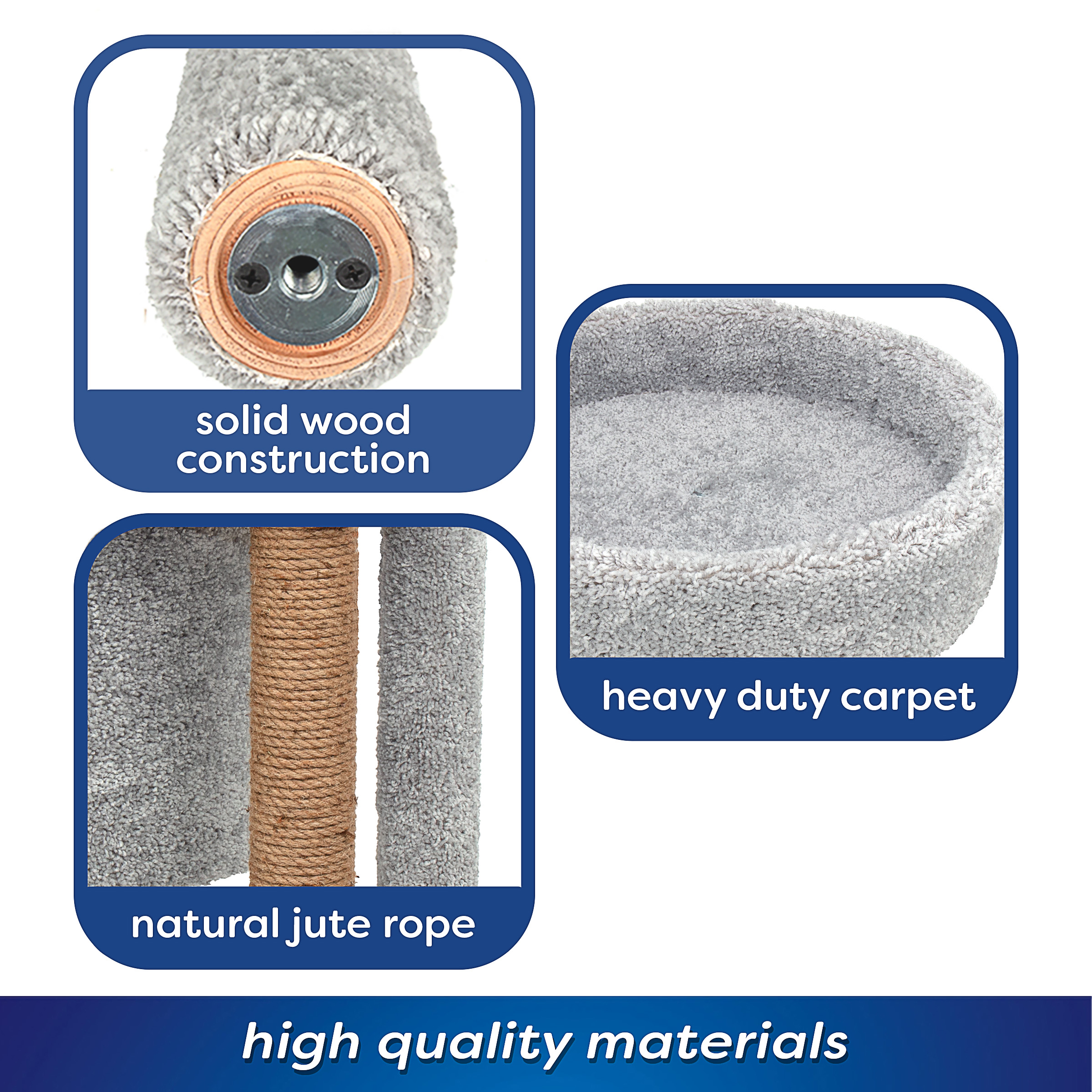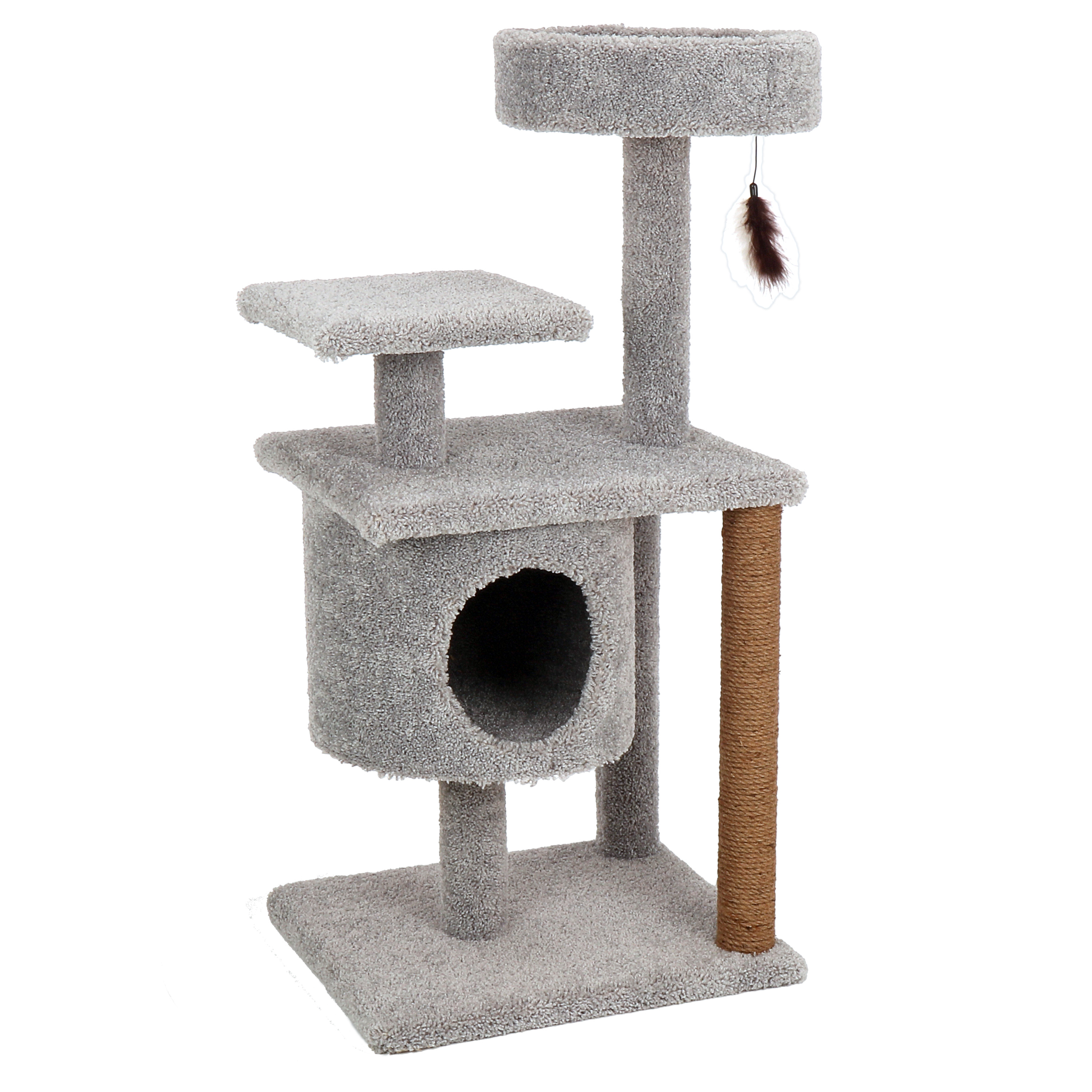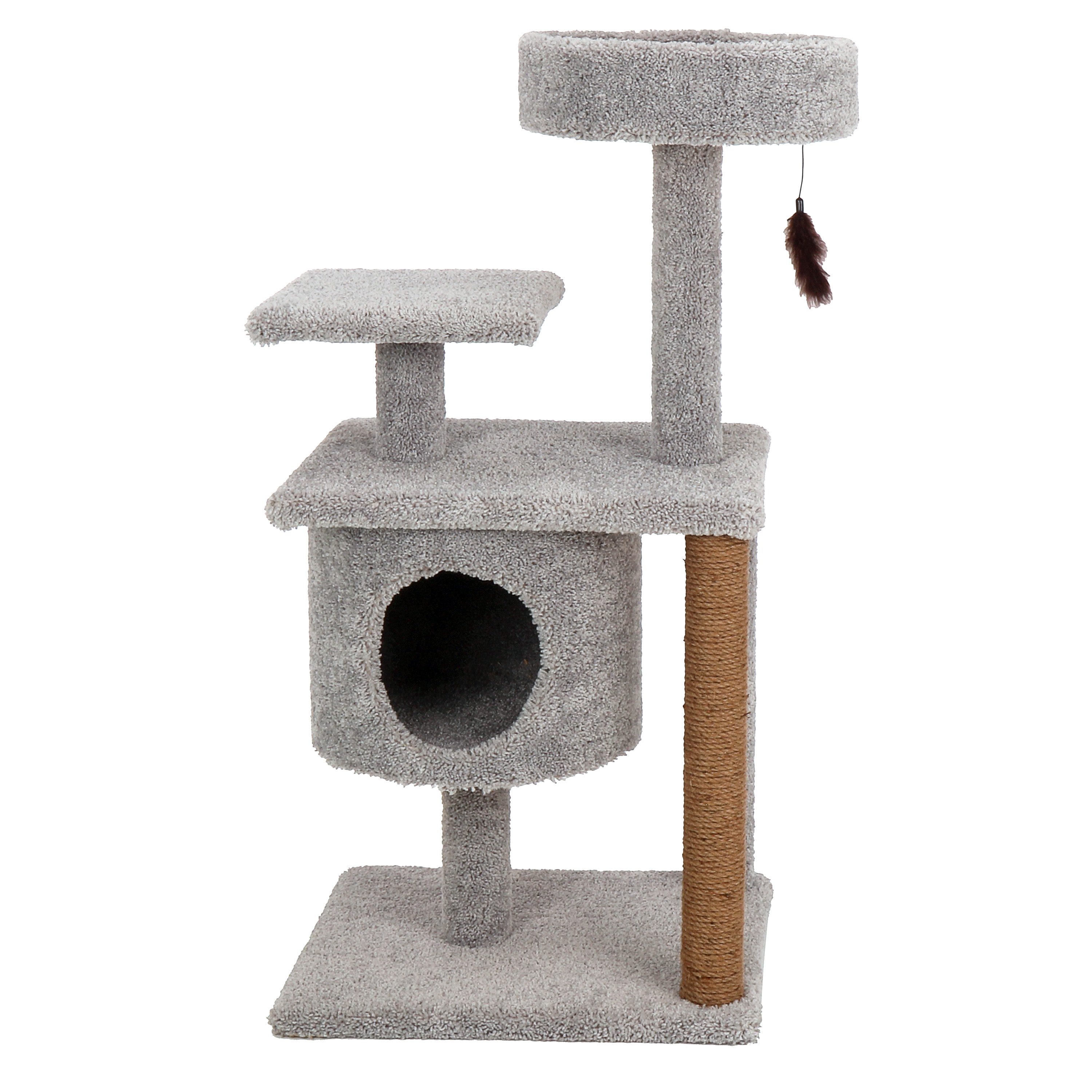 A versatile 44" Cat Tree with easy access to perch and cozy condo. Special step help aid older cats to climb to the top perch. The condo offers a secure and secluded place for kitty to hangout and relax. Comes with a long jute wrapped post to encourage positive scratching behavior. Handcrafted in the USA with solid wood and household grade carpet. Combines ready-to-assemble shipping with pre-built quality for the best of both worlds!
