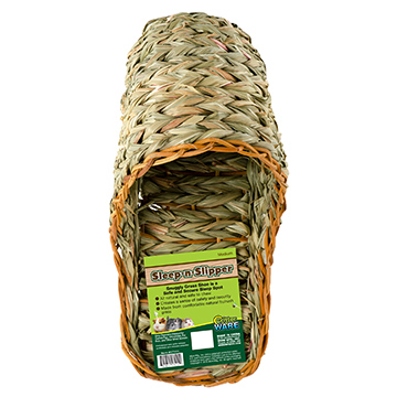 Sleep-N-Slipper is a snuggly grass shoe that provides a safe and secure sleep spot for small animals. Made from all natural grasses, it is safe and fun for pets to chew as well.