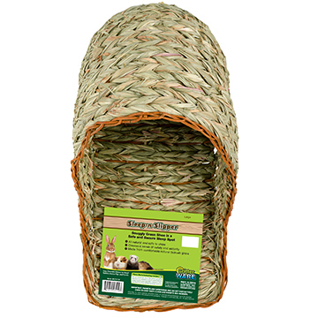 Sleep-N-Slipper is a snuggly grass shoe that provides a safe and secure sleep spot for small animals. Made from all natural grasses, it is safe and fun for pets to chew as well.