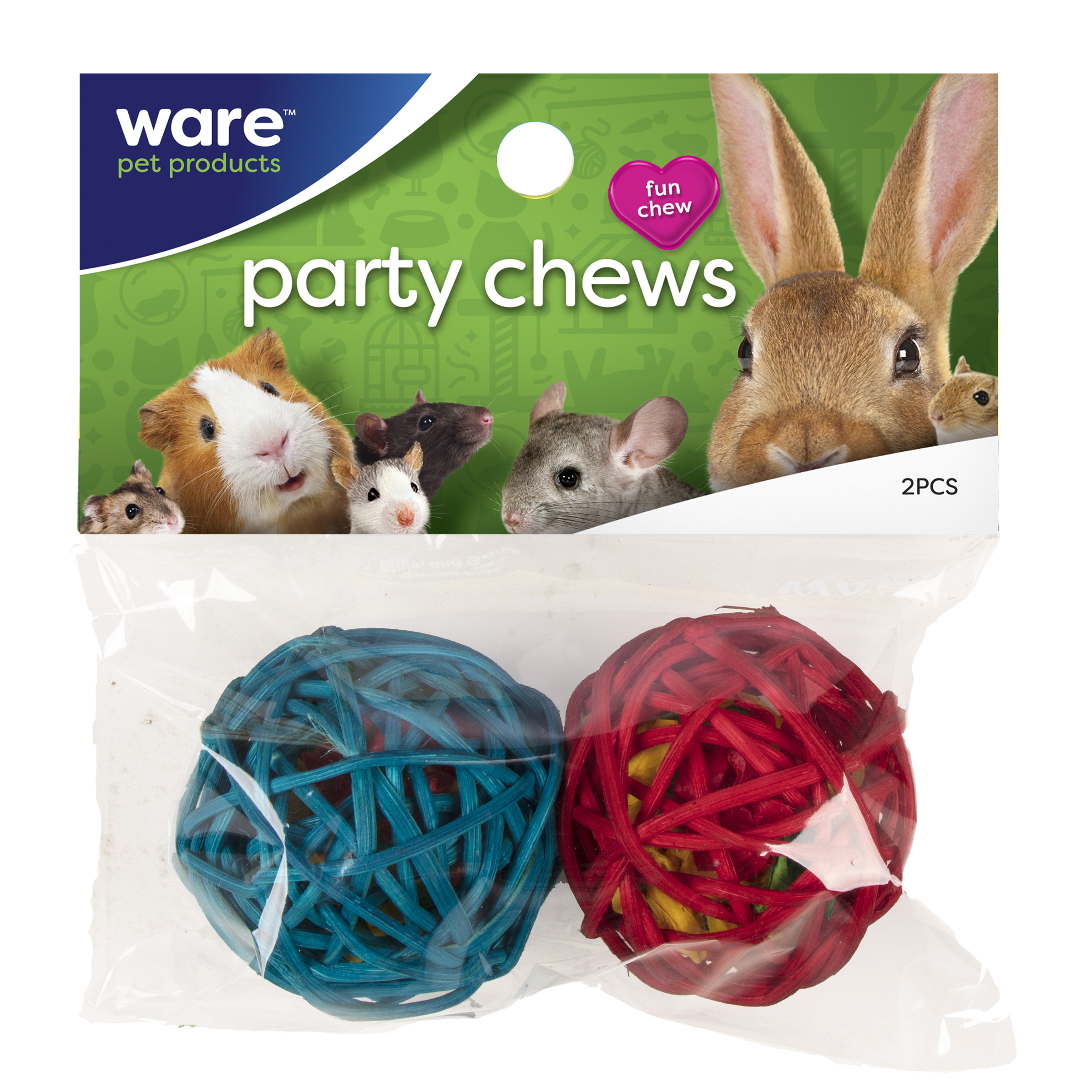 The Ware Party Chews are colorful, crunchy chew toys for critters of all sizes. Made out of rattan and raffia paper, Party Chews encourage natural behaviors. Supervision is highly recommended when introducing your critter to a new chew toy.