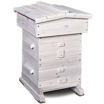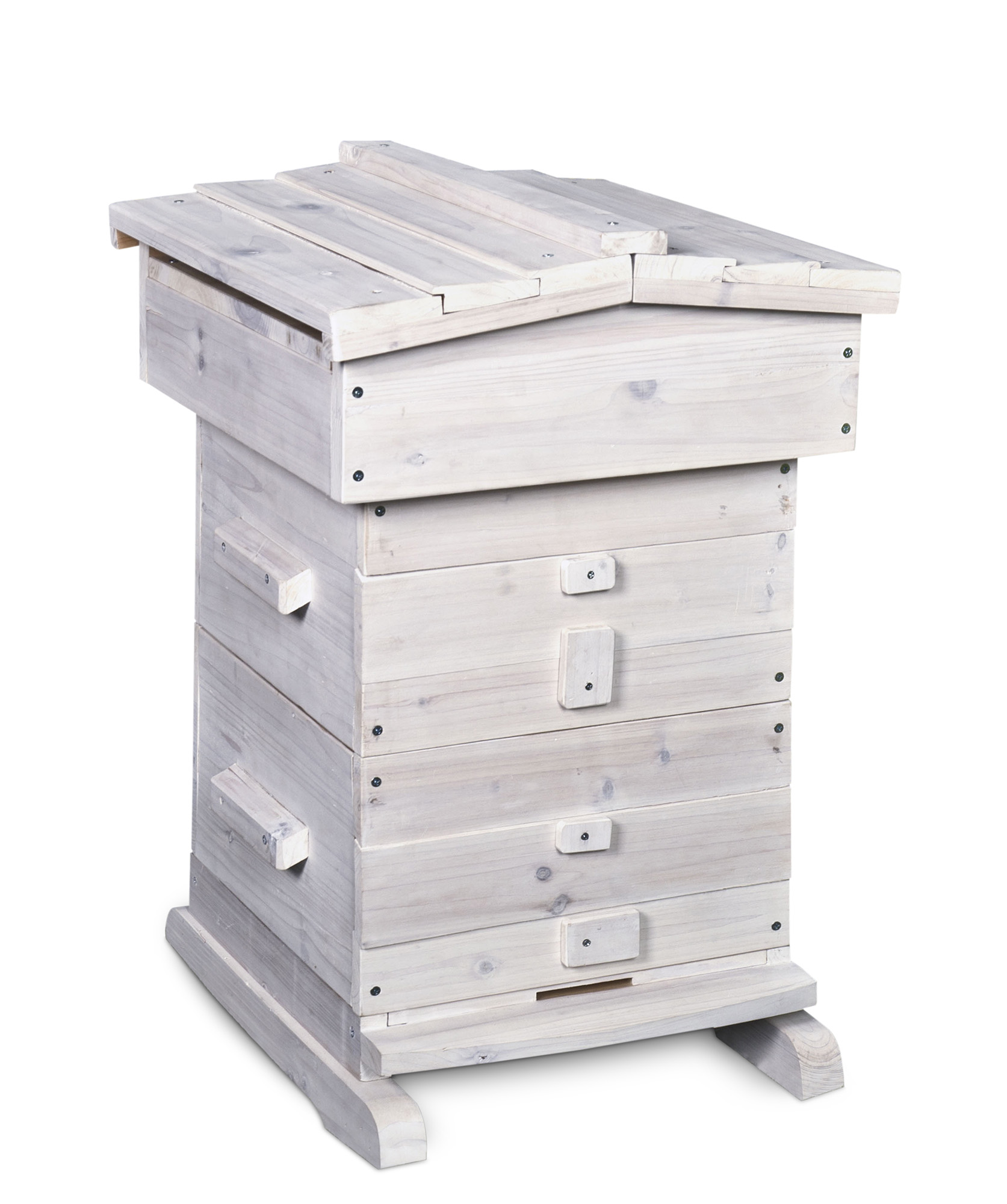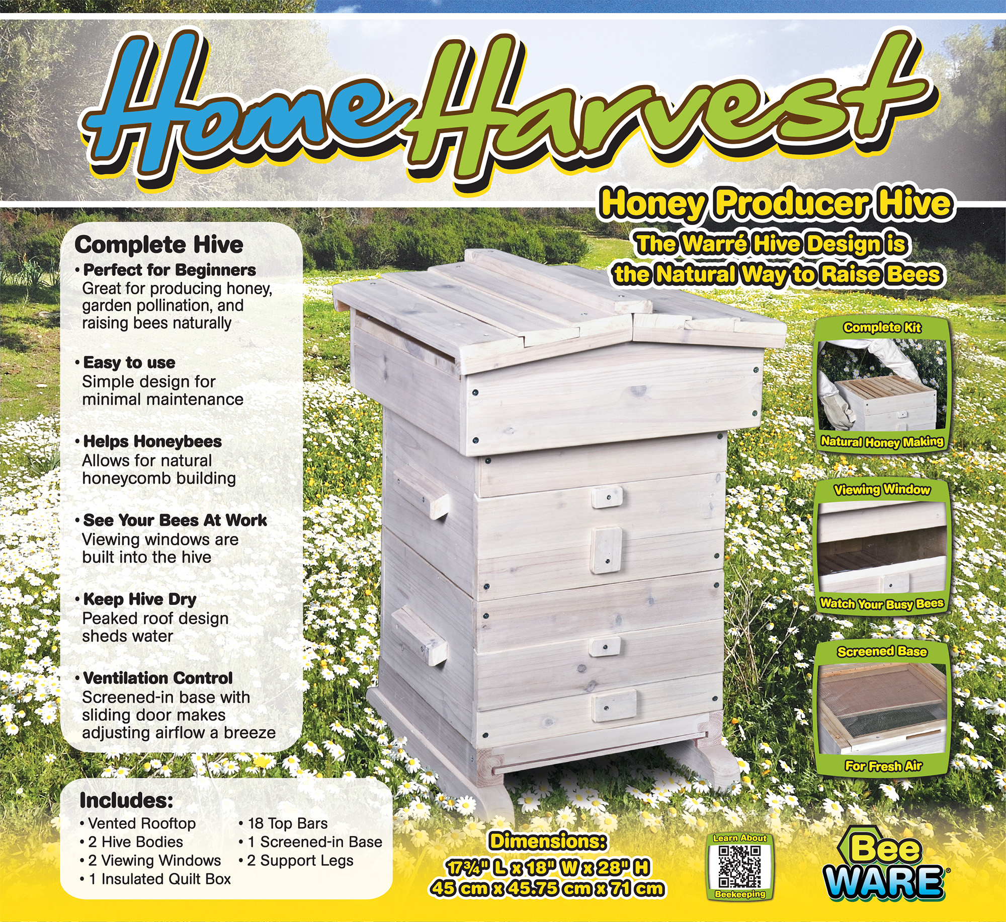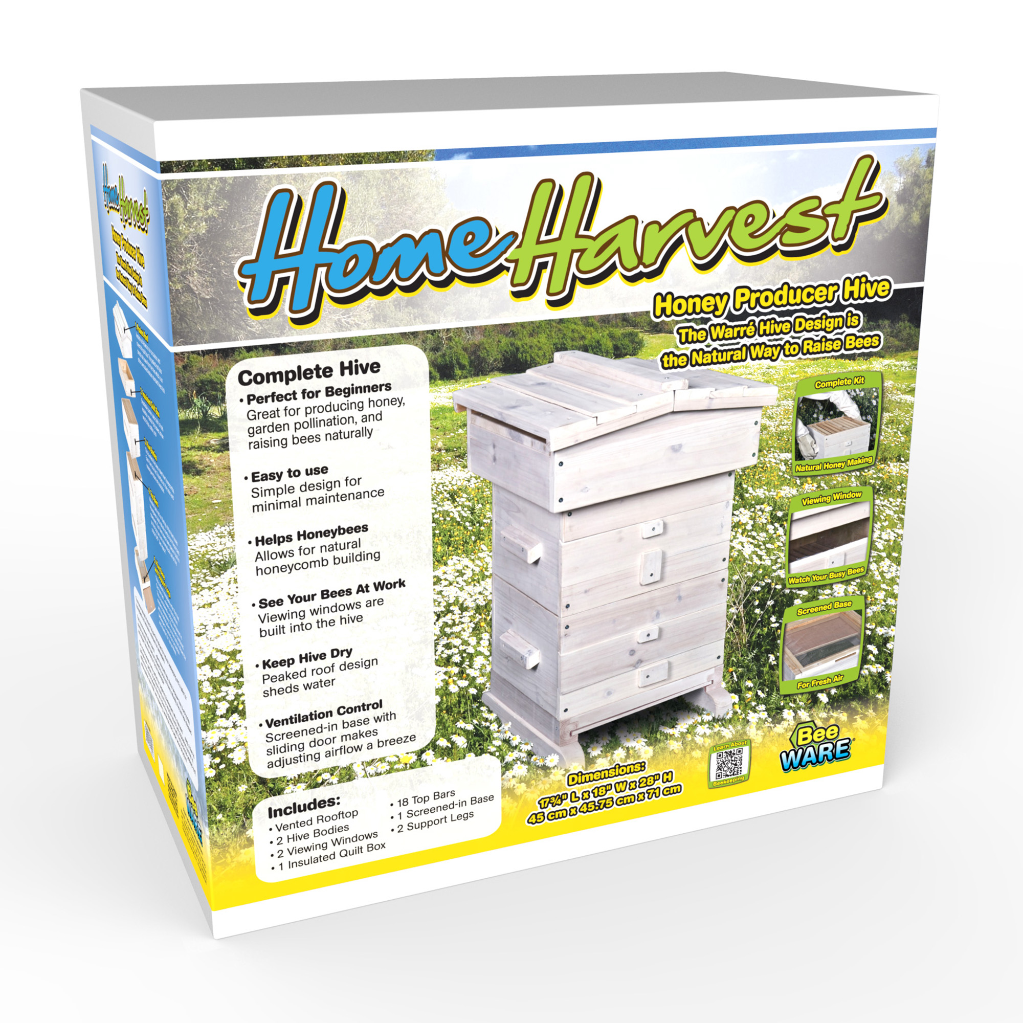 Home Harvest Hive is a Ware hive design for natural beekeeping. Complete Hive is perfect for beginners to use for garden pollination and raising bees naturally. Includes a vented rooftop, 2 hive boxes, 2 viewing windows, 18 top bars, insulated quilt box, screened-in base and support legs.