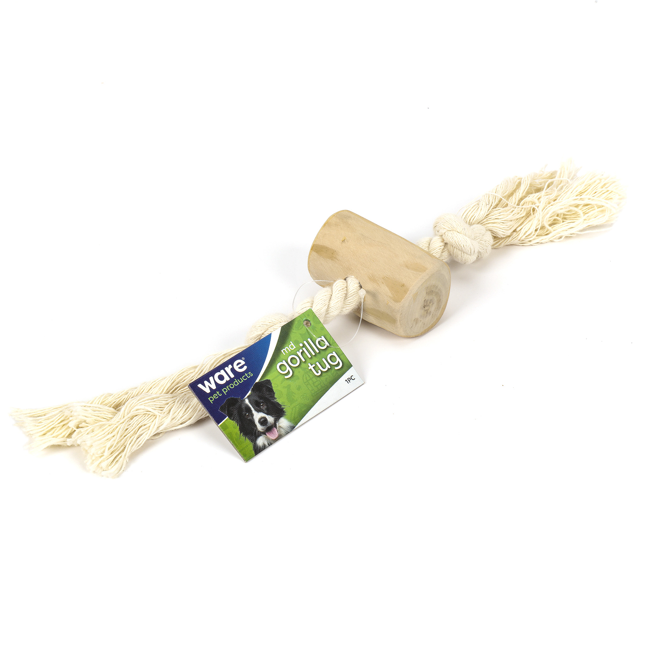 Gorilla Tugs are an all natural chew toy for dogs, sustainably harvested and environmentally friendly . They feature a wood chew in the middle with cotton rope on each end. Natural dense and hard wood makes a durable, long-lasting chew for dental health and gum care. Rope fibers also help floss dog's teeth. Plus, the cotton rope is perfect dog's teeth. Plus, the cotton rope is perfect for playing tug-of-ware games! Does not bleed, stain or smell.